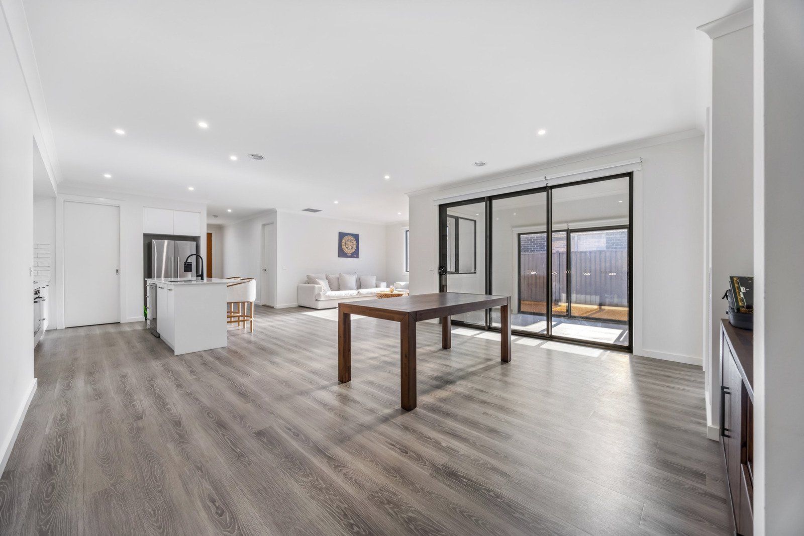 - Open-plan kitchen, dining, and living area