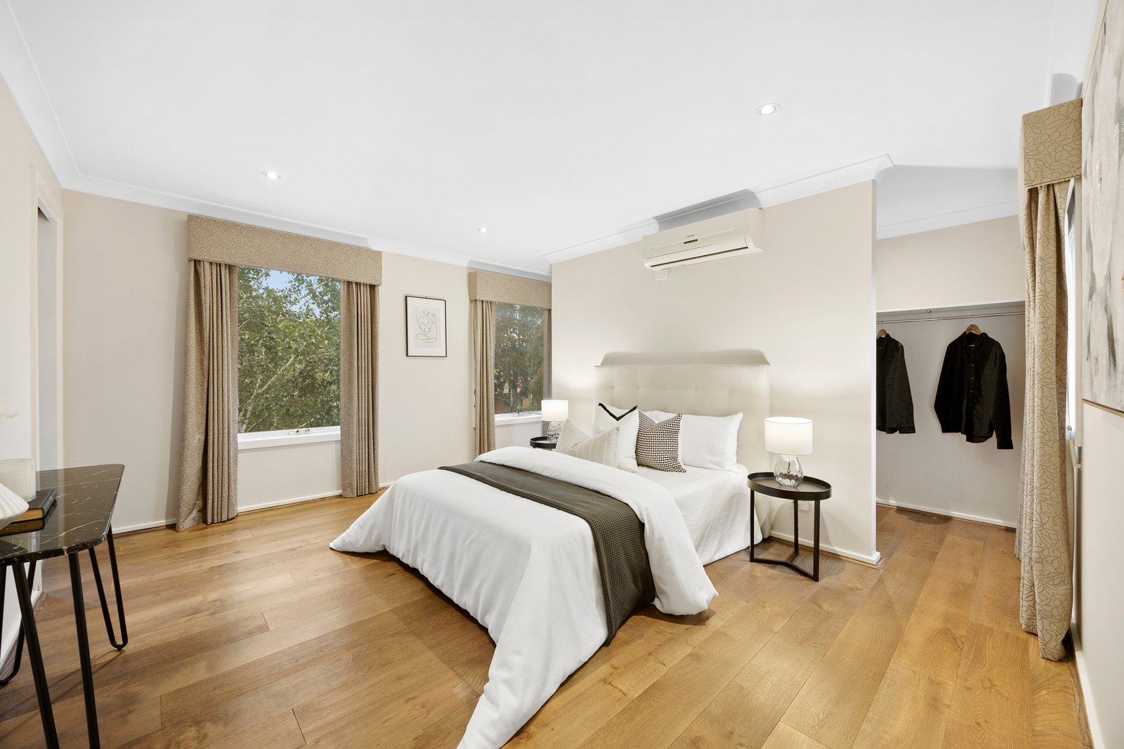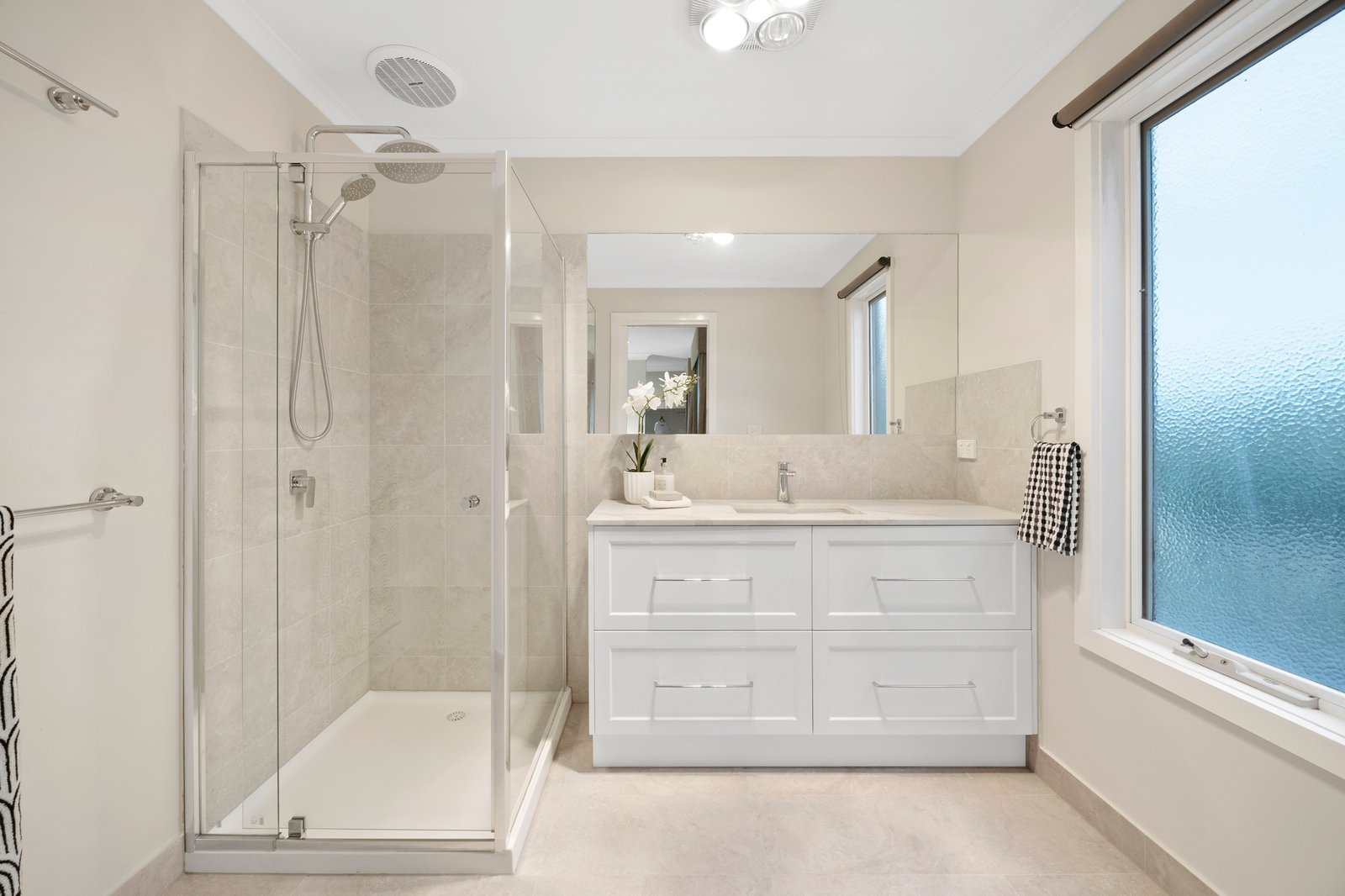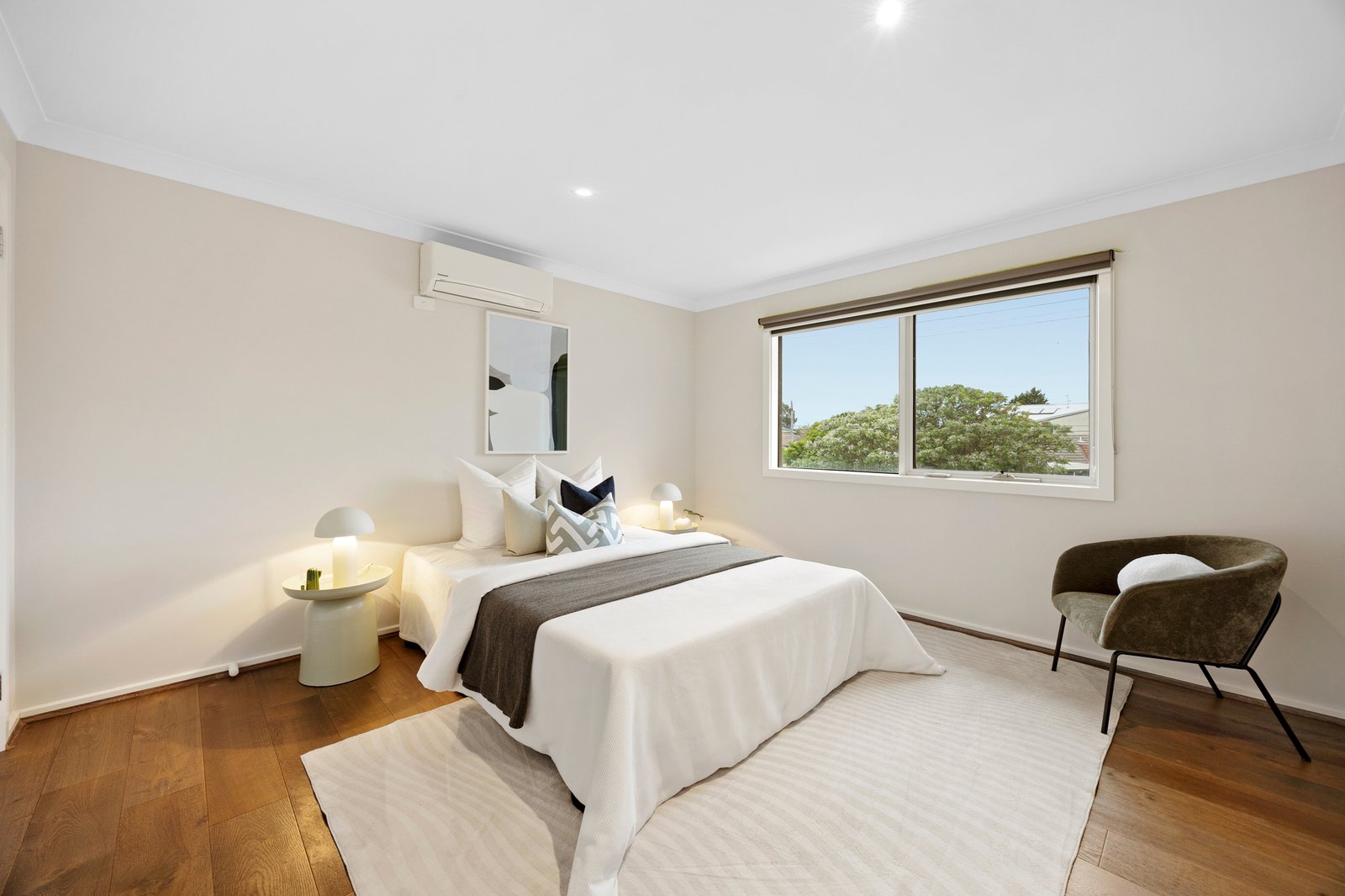 Upstairs is complemented by engineered oak floors, the large main bedroom boasts a walk-in robe and newly renovated ensuite with stone vanity and frameless shower. Two additional robed bedrooms share a family bathroom with bath, shower, and separate toilet.