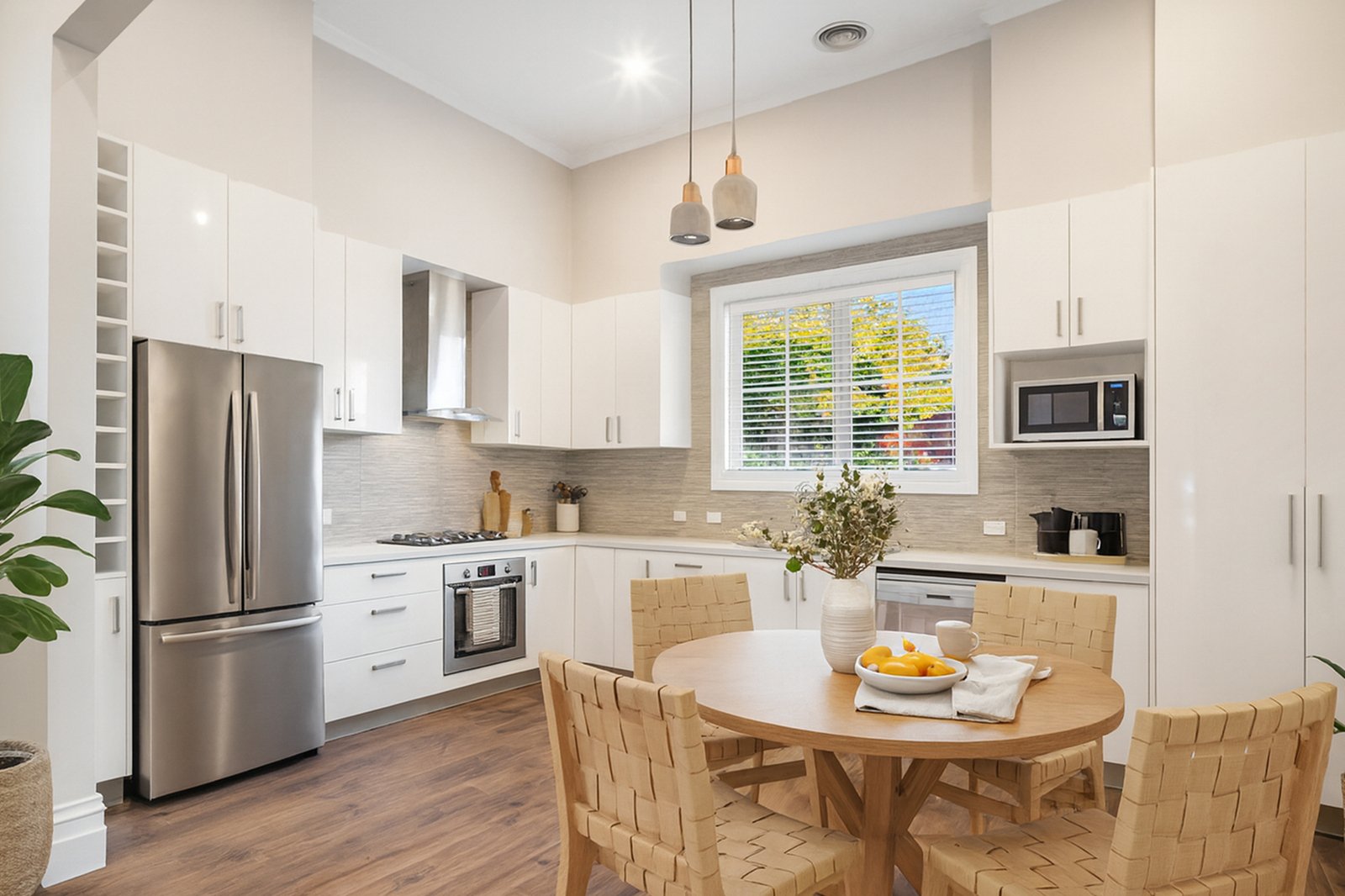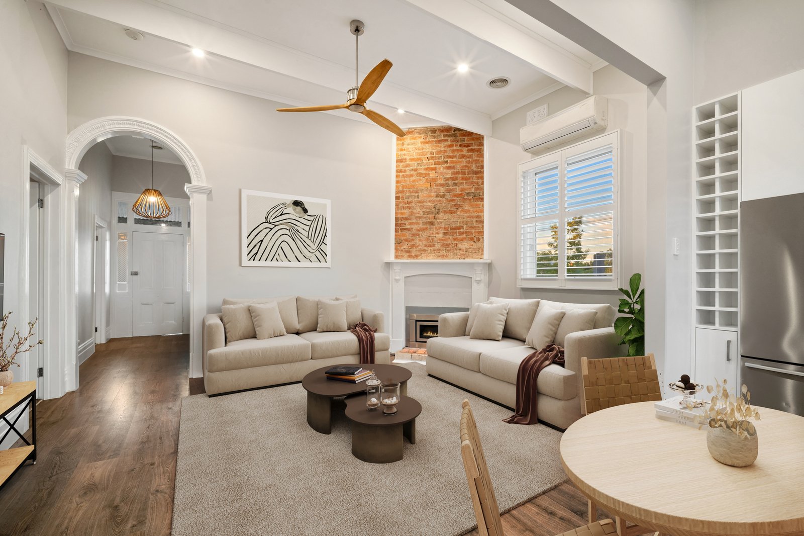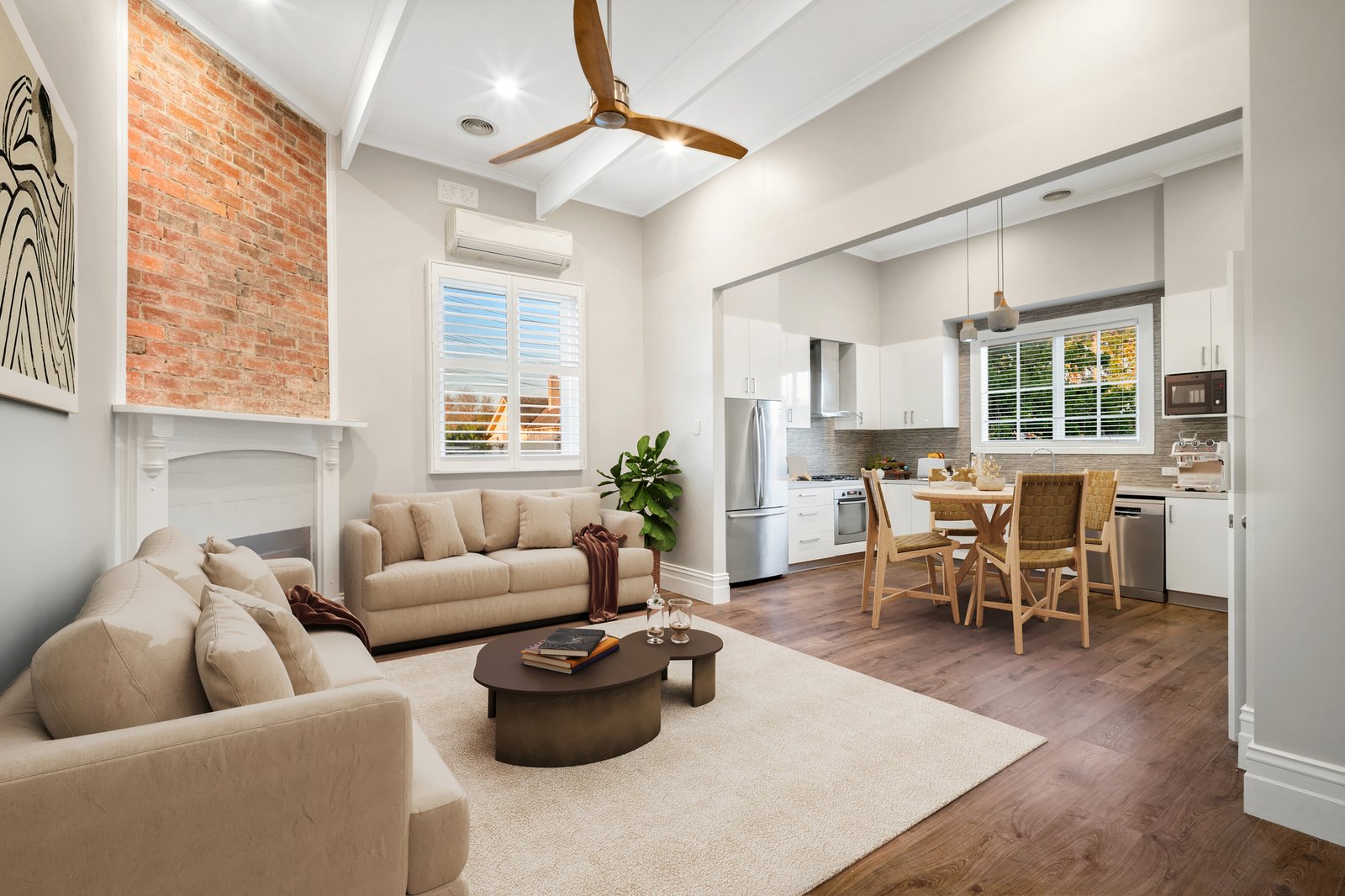 Inside, you’ll be greeted by soaring 12ft ceilings, an elegant original archway in the hallway, and the warmth of polished timber floors. The light-filled open-plan living area features plantation shutters, double-glazed windows and a cosy gas log heater framed by a stunning exposed brick feature wall. A ceiling fan and split system ensure year-round comfort, while NBN connection adds everyday practicality.