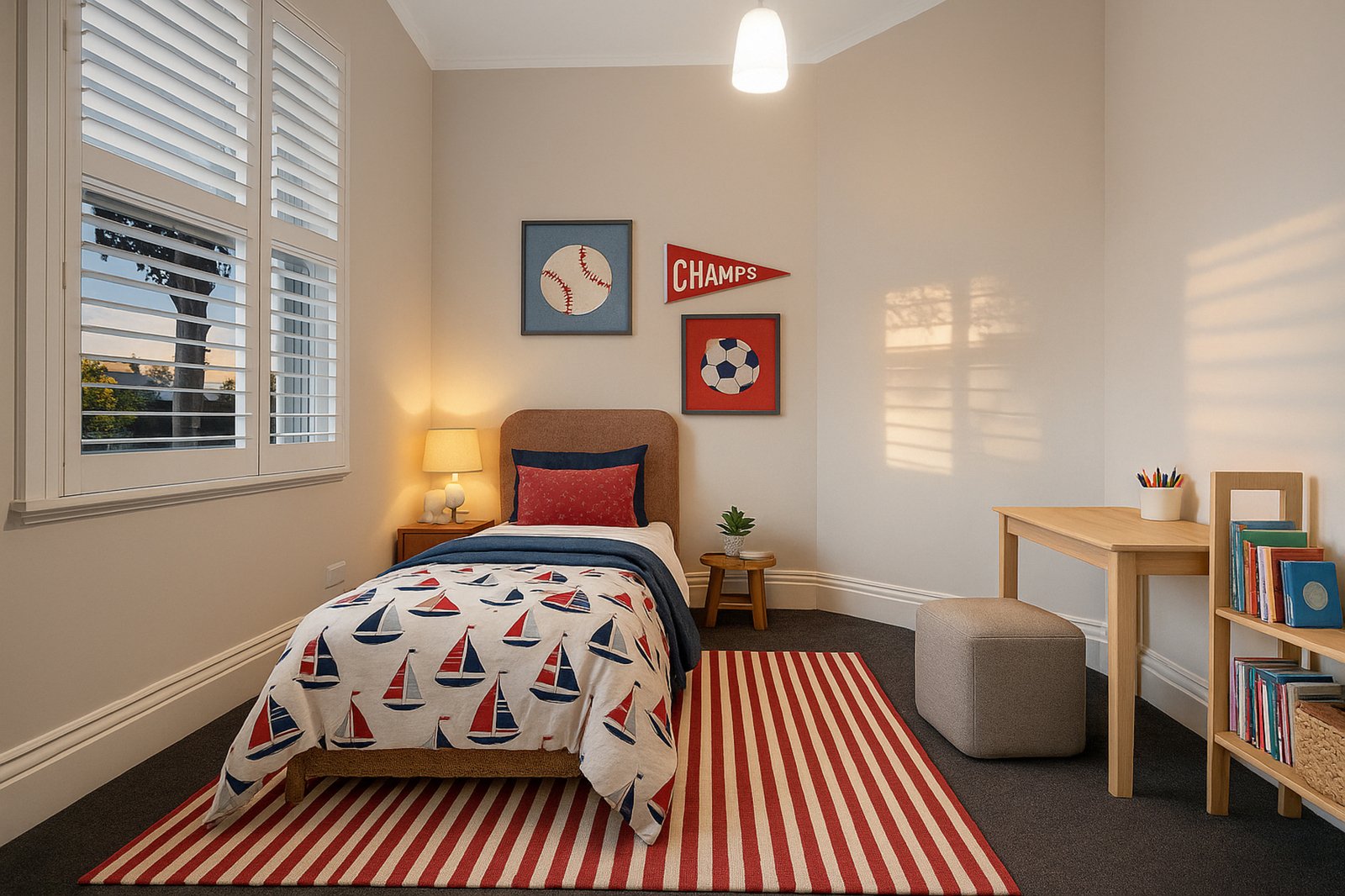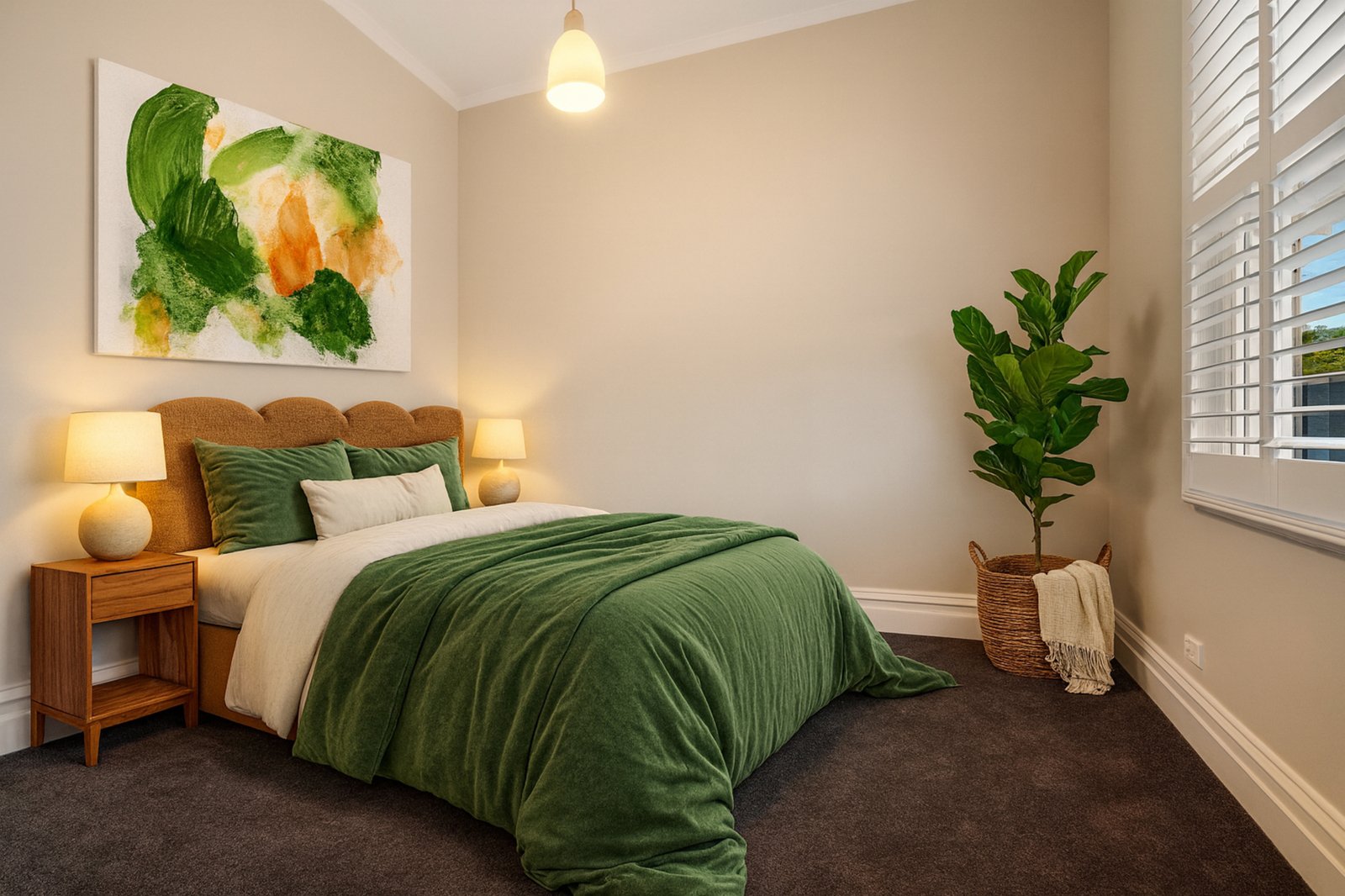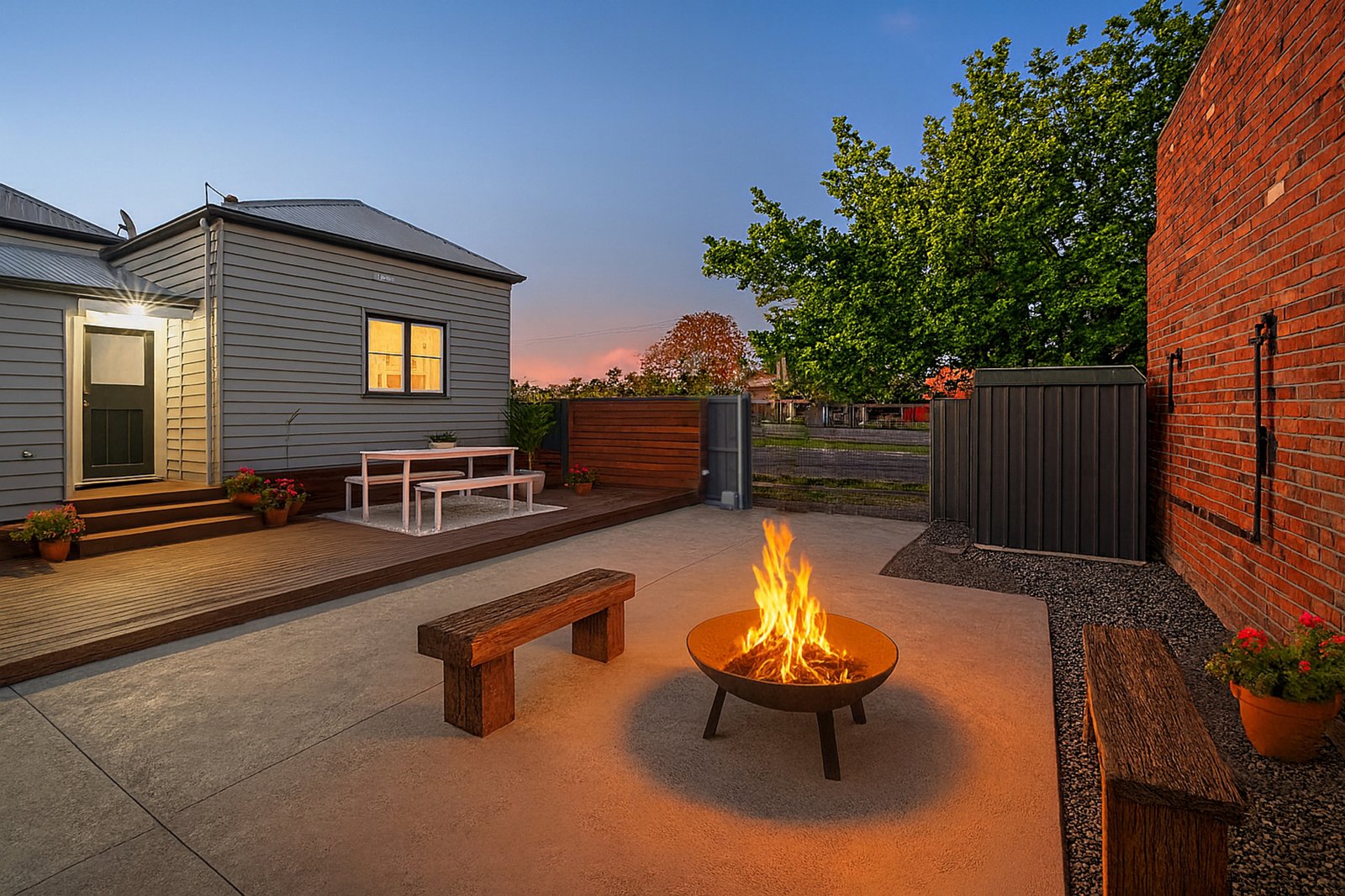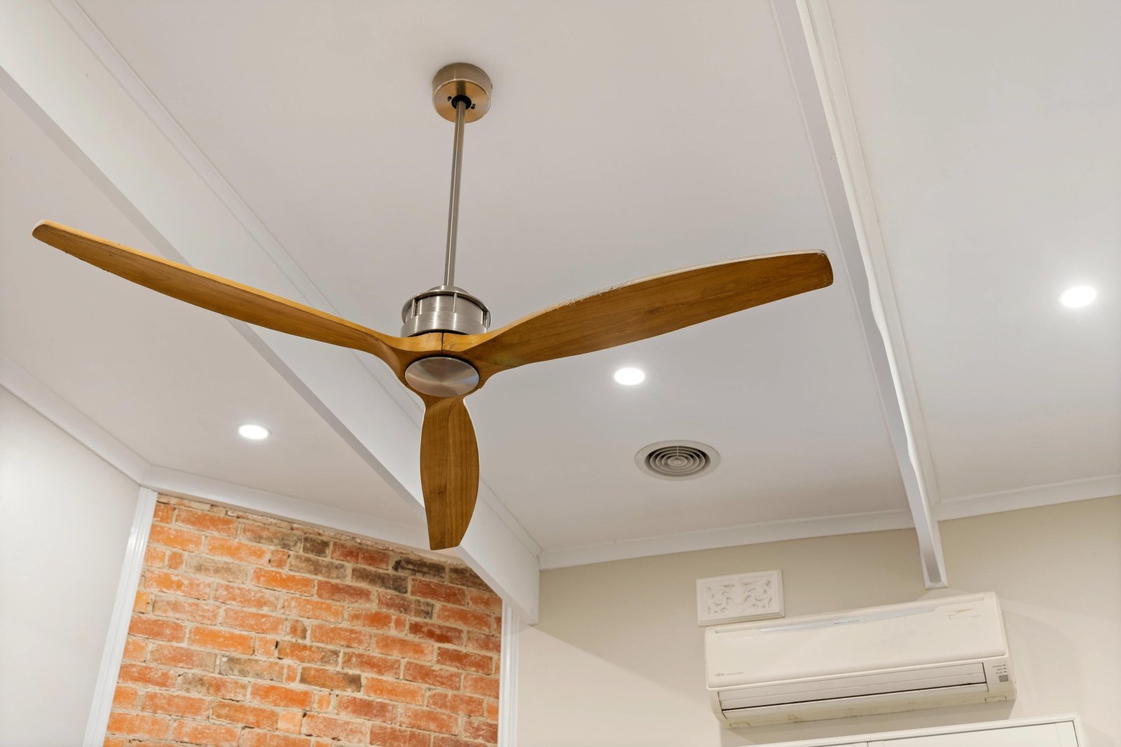 Inside, you’ll be greeted by soaring 12ft ceilings, an elegant original archway in the hallway, and the warmth of polished timber floors. The light-filled open-plan living area features plantation shutters, double-glazed windows and a cosy gas log heater framed by a stunning exposed brick feature wall. A ceiling fan and split system ensure year-round comfort, while NBN connection adds everyday practicality.