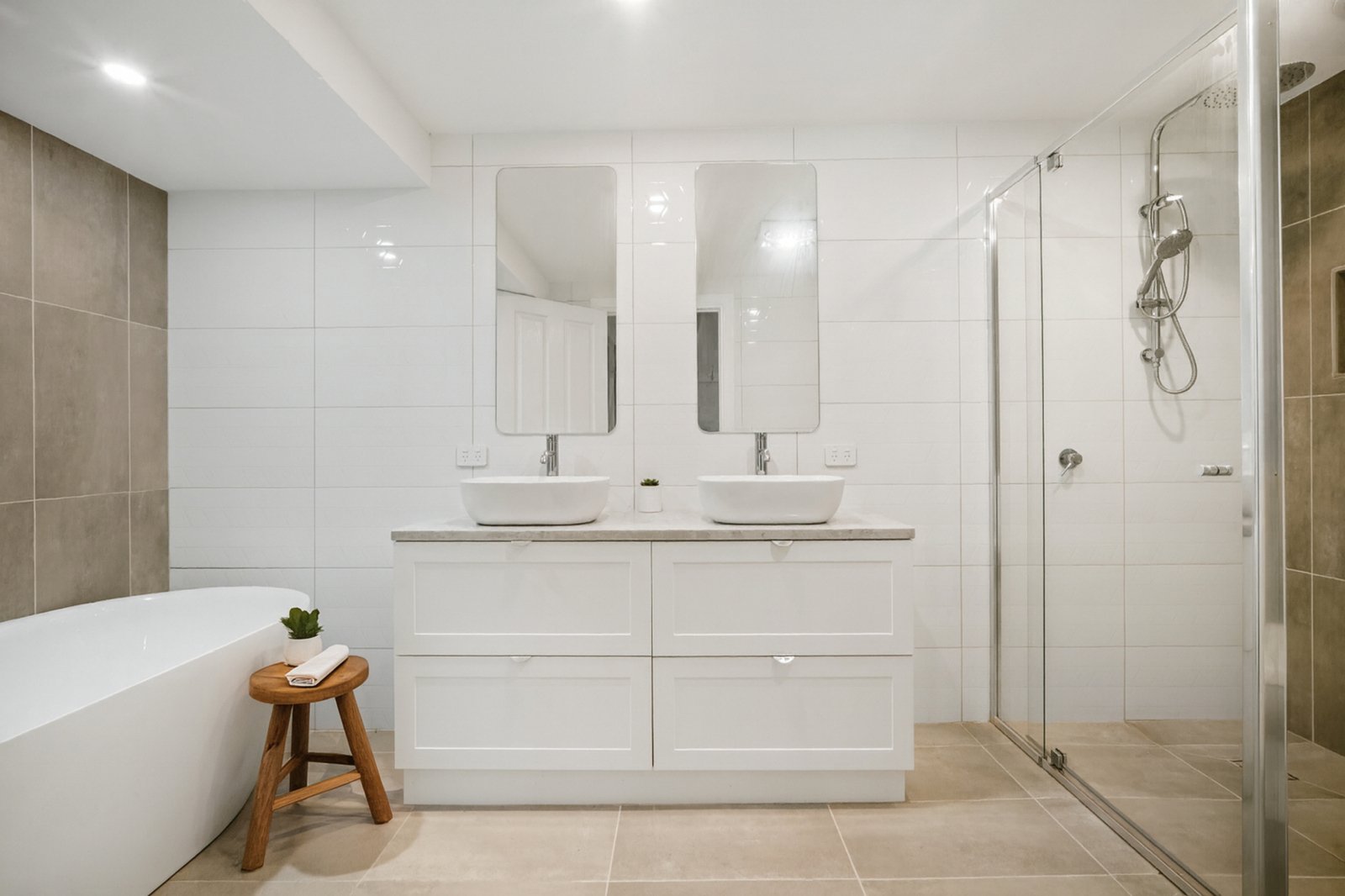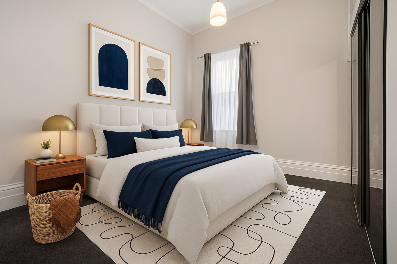 The sleek kitchen and bathroom both showcase quality stone finishes, with the bathroom offering a large bath and vanity. The spacious master bedroom includes an impressive built-in robe, while the remaining bedrooms continue the home’s inviting sense of light and charm.