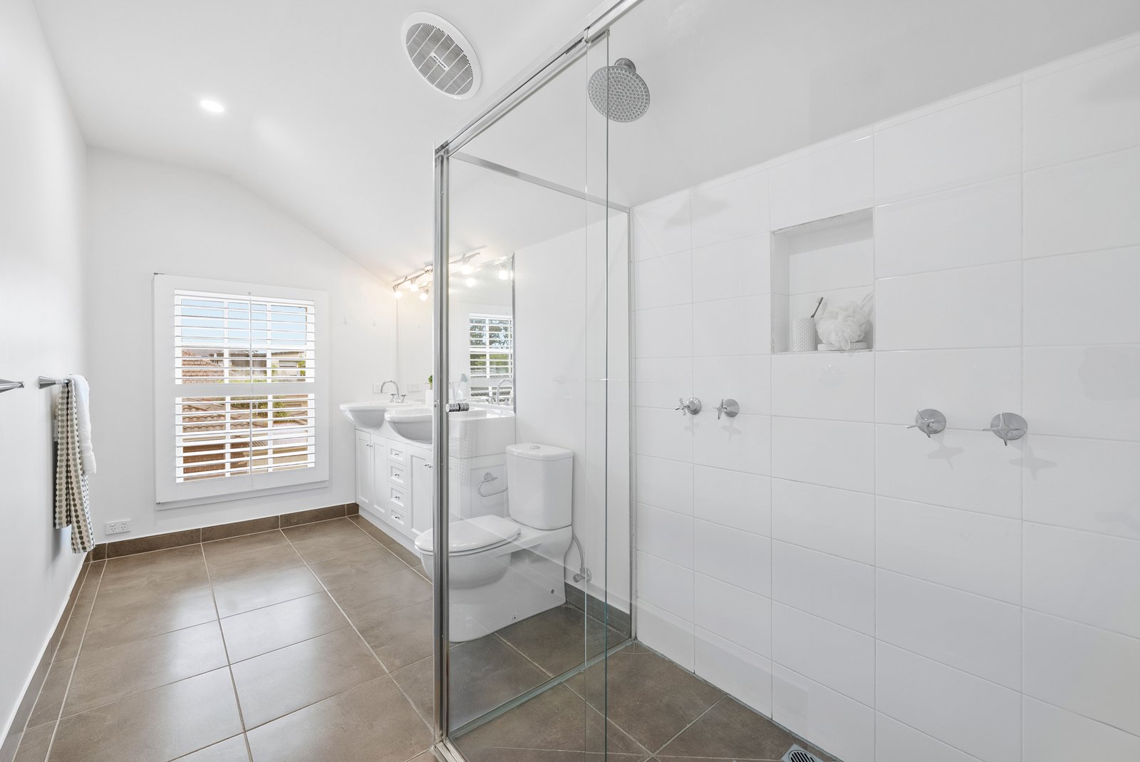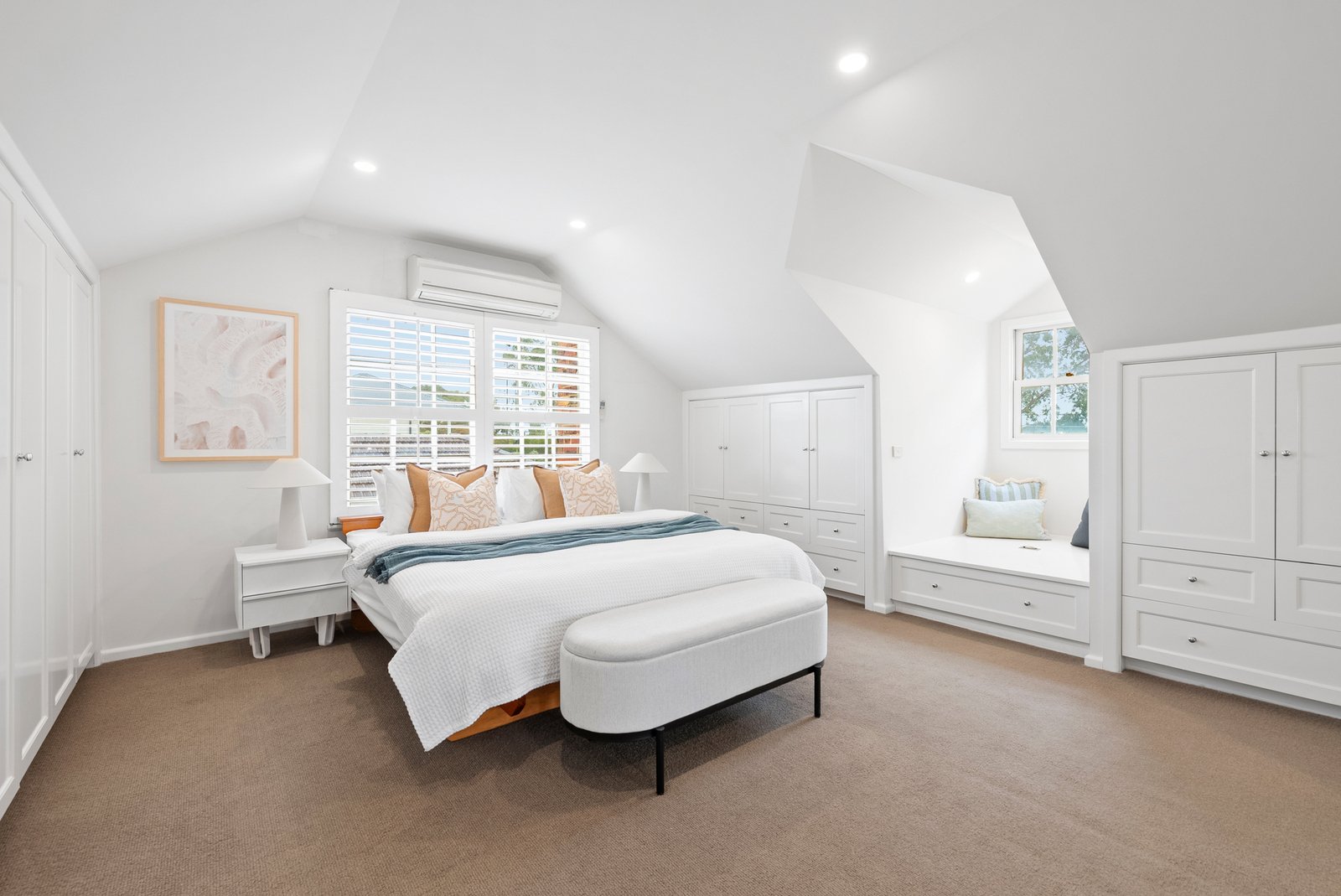 Two ground-floor bedrooms, each with robes and split-system comfort, share a bright central bathroom. Above, the private parents’ retreat offers a serene escape with fitted study nook, extensive wardrobes, and a sleek ensuite - a sanctuary elevated above the activity below.