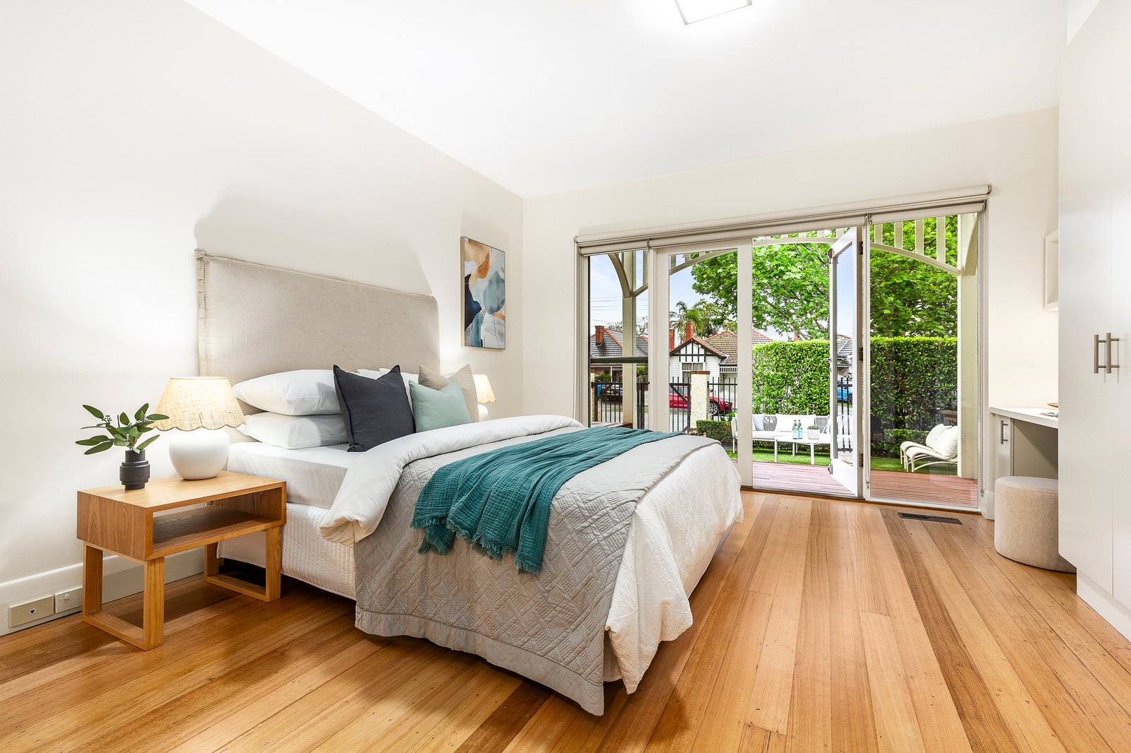 The main bedroom impresses with its generous proportions, extensive built-in wardrobes and study nook, while French doors opening to the courtyard create a tranquil haven of indoor-outdoor style. A stone-vanity bathroom, European laundry and second robed bedroom further enhance the home’s functionality and appeal.