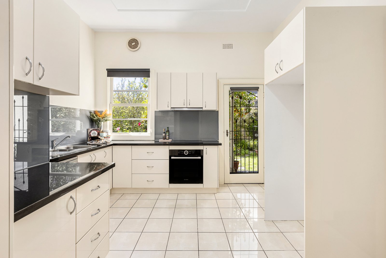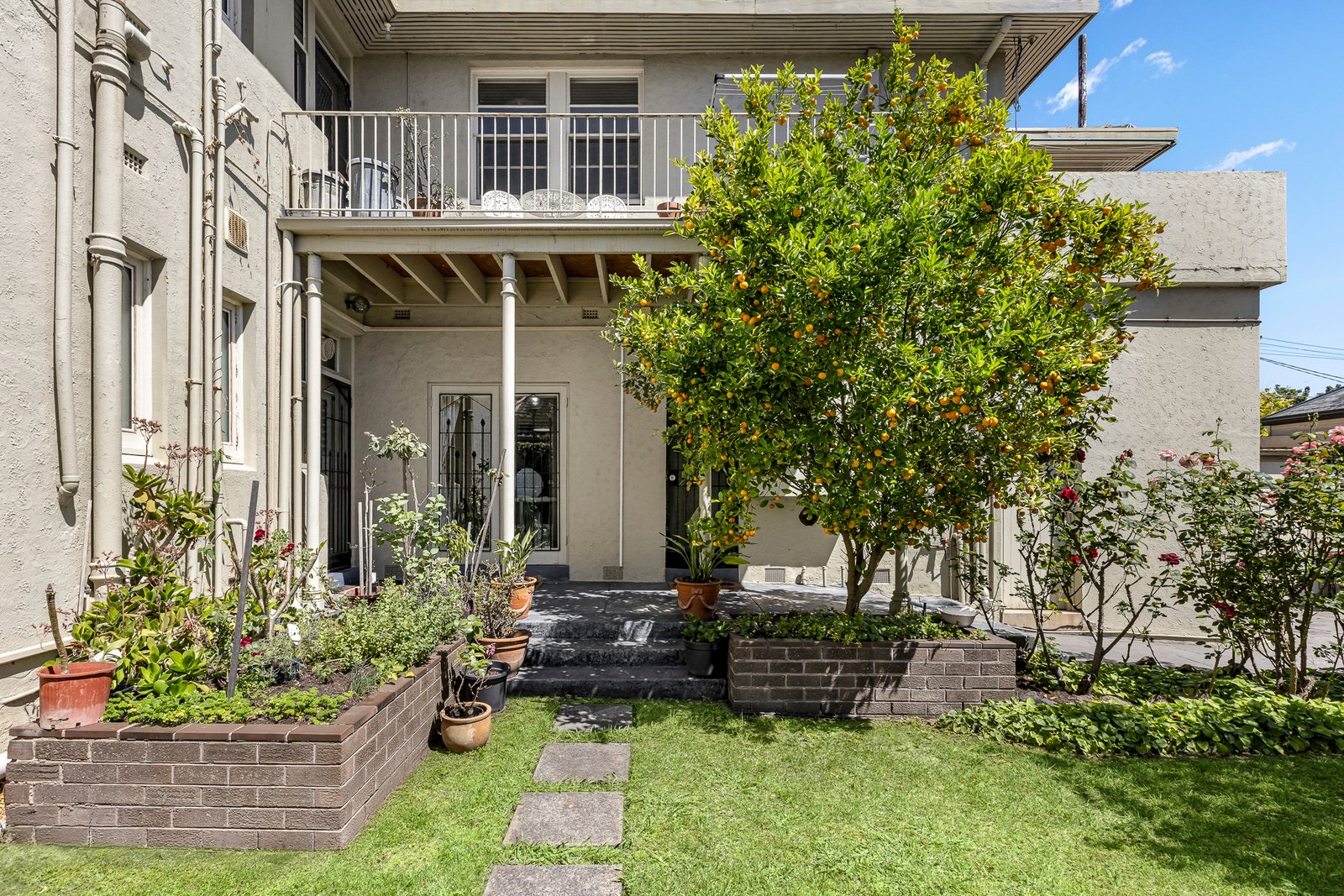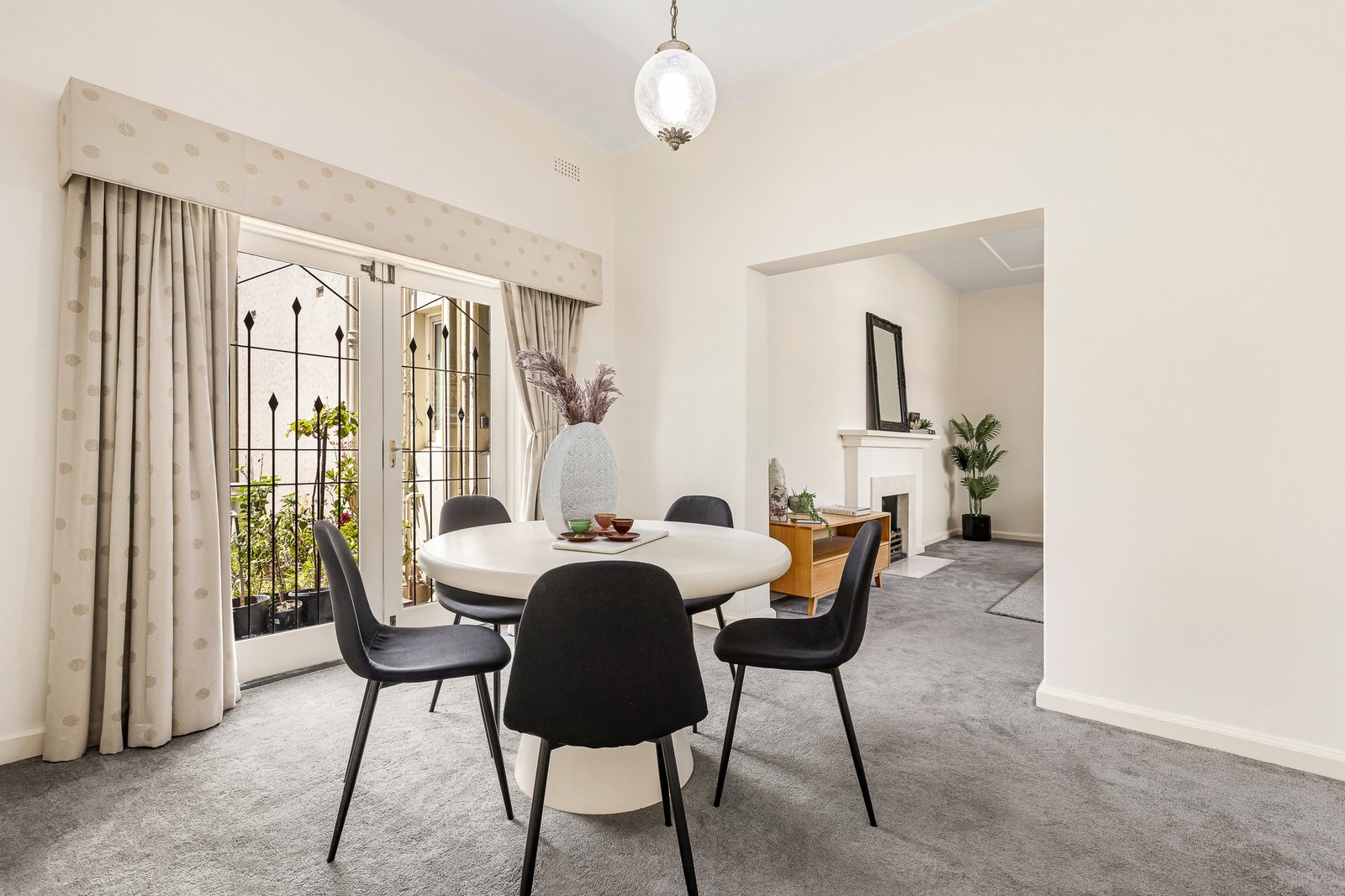 Set amid the fragrant gardens of ‘County Lodge’, a tightly held boutique group of just three, the home enjoys a peaceful frontage to Thomson Street. A private stepped entrance reveals light-filled interiors with high ceilings, hydronic heating and enduring period character. The spacious living room and separate dining area flow to a classically appointed stone kitchen featuring Bosch appliances (electric cooktop, oven and dishwasher) and outdoor access.