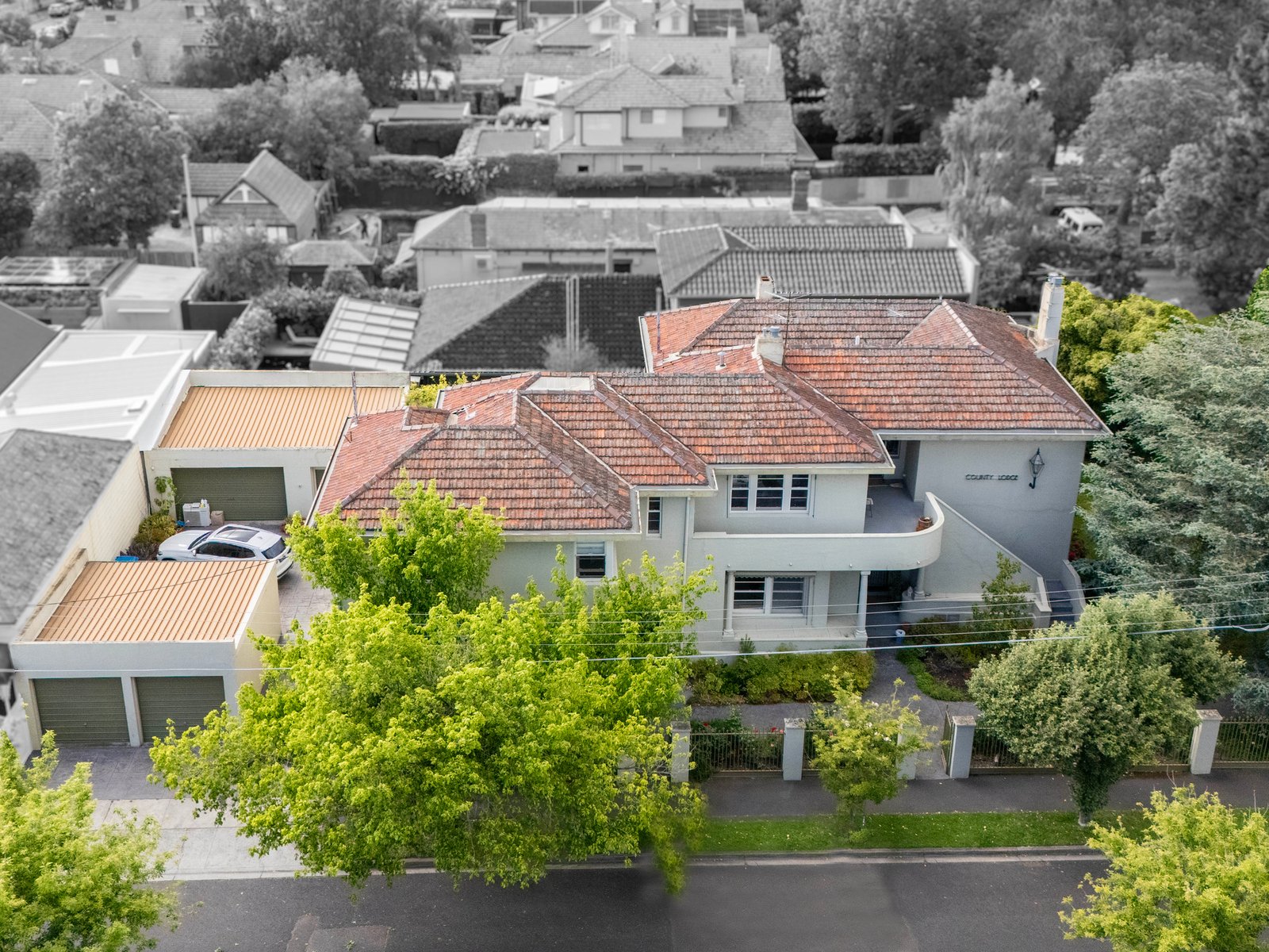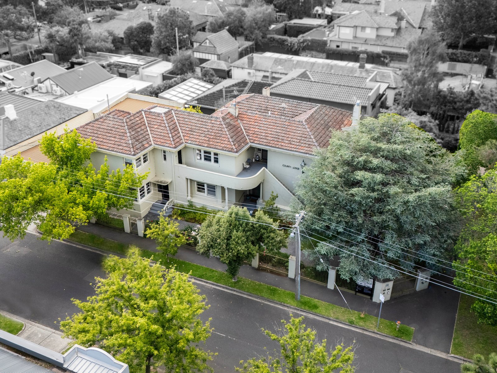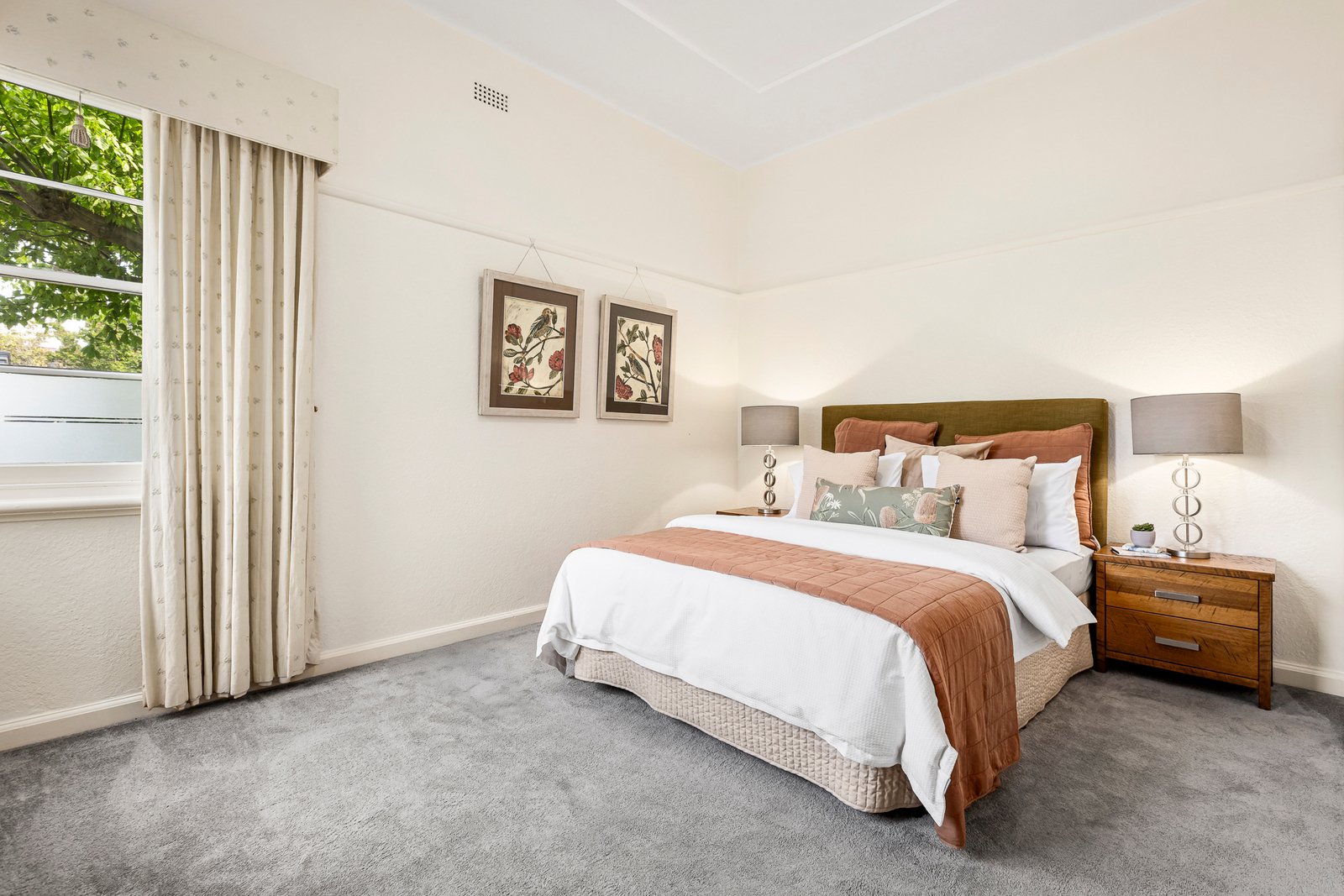 Set amid the fragrant gardens of ‘County Lodge’, a tightly held boutique group of just three, the home enjoys a peaceful frontage to Thomson Street. A private stepped entrance reveals light-filled interiors with high ceilings, hydronic heating and enduring period character. The spacious living room and separate dining area flow to a classically appointed stone kitchen featuring Bosch appliances (electric cooktop, oven and dishwasher) and outdoor access.