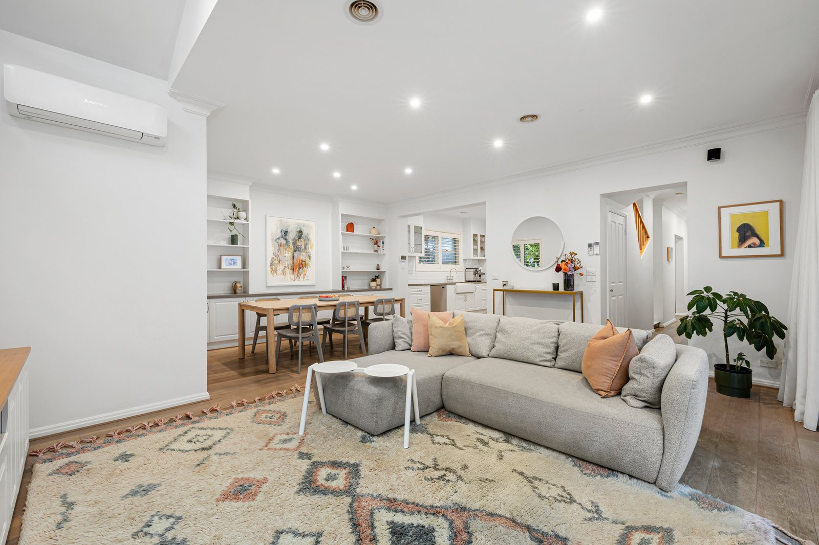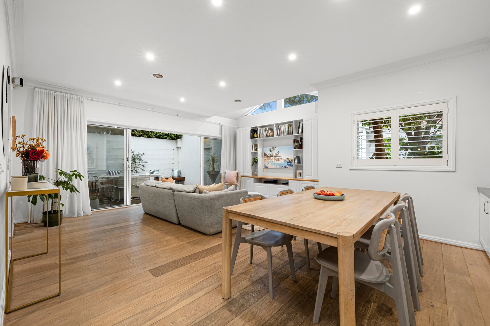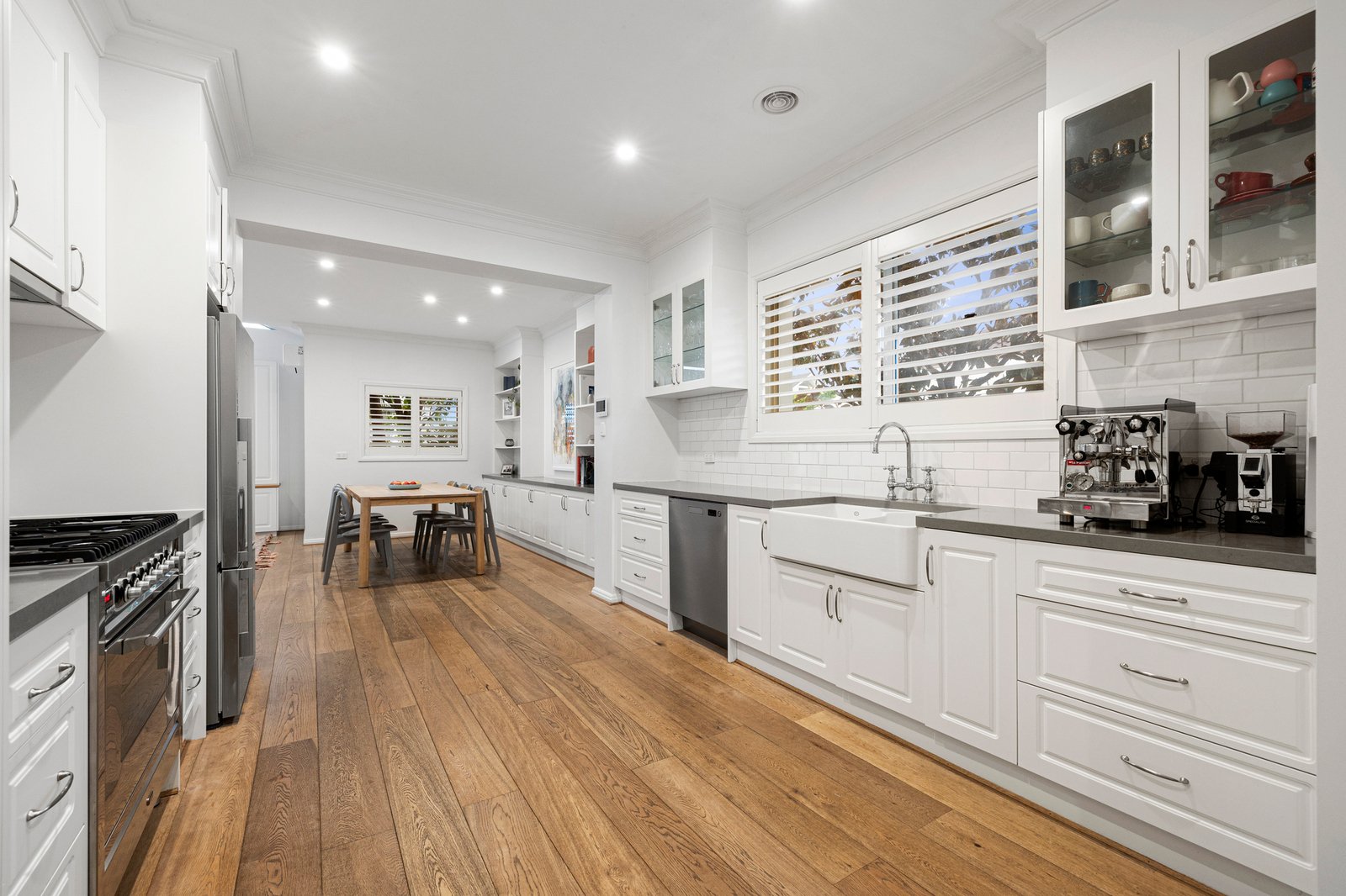 Upon entry, discover a garden-view lounge with cosy gas fireplace – the perfect spot to relax at the end of the working day. Further on, quality Ilve/Asko appliances, stone benchtops and a classic farmhouse sink are highlights of the sophisticated kitchen while an open plan living/dining zone with bespoke built-in cabinetry spills seamlessly outside to a decked courtyard with umbrella for easy indoor/outdoor entertaining.