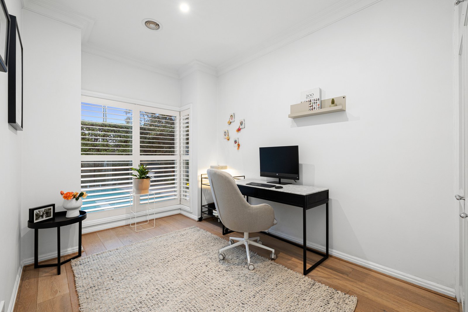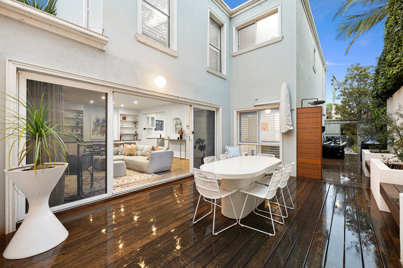 Screened from passers-by thanks to a high fence and lush greenery, the secure front garden with heated pool & spa welcomes guests and sets the tone for the inviting spaces within.