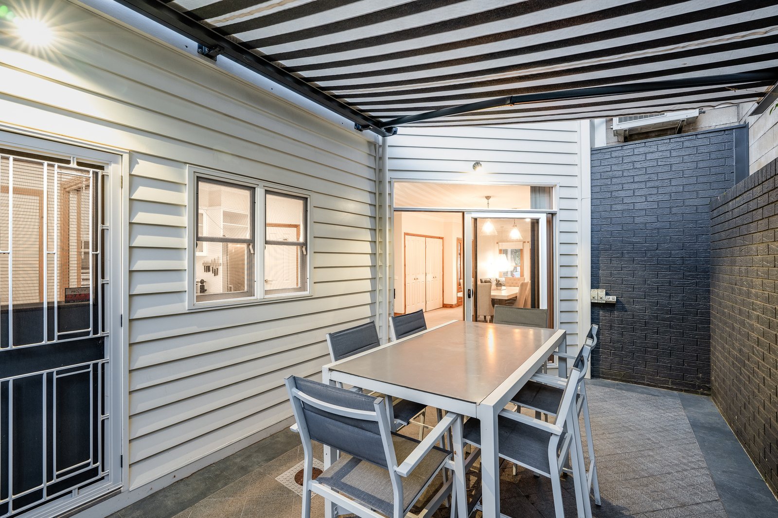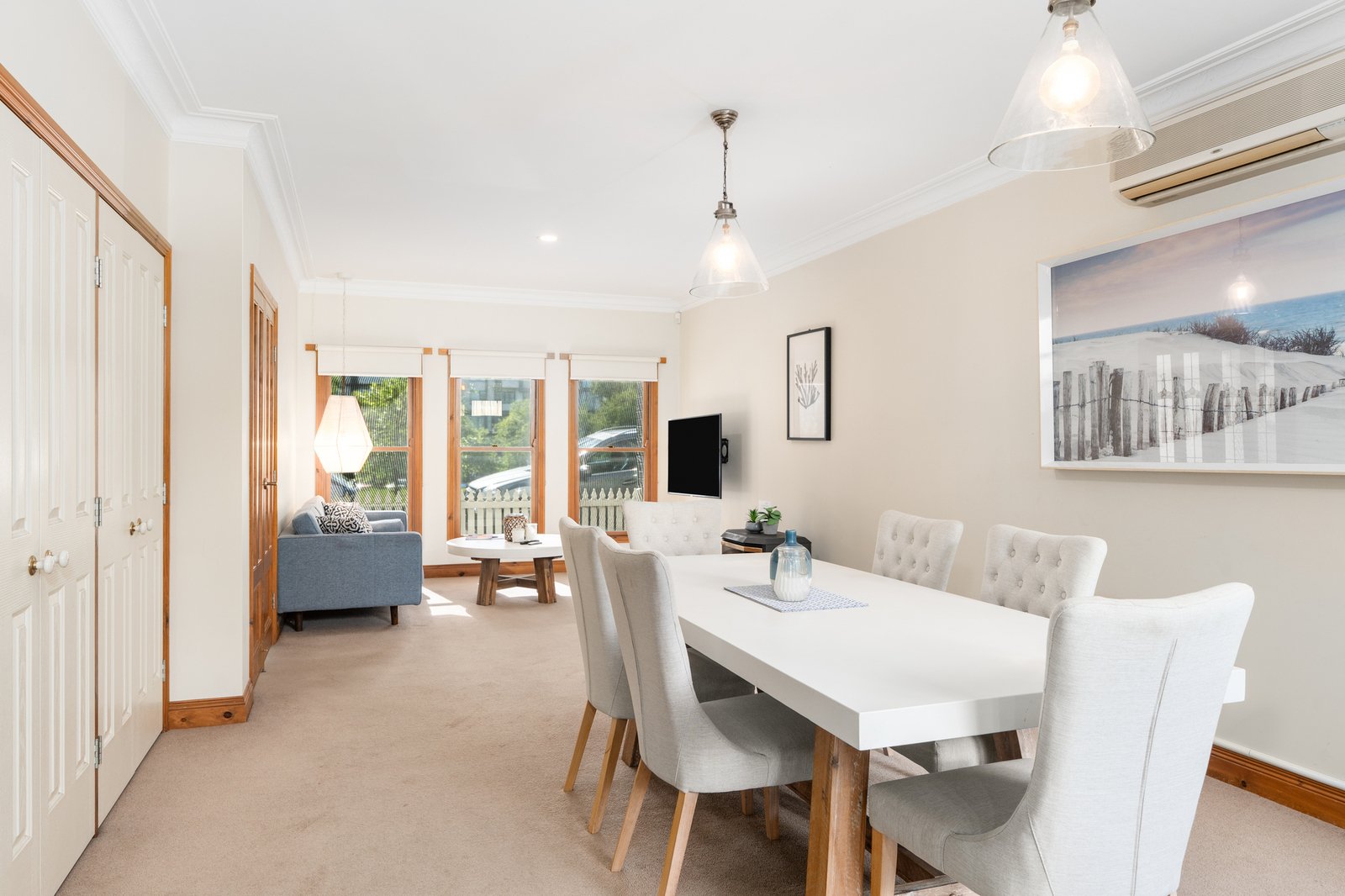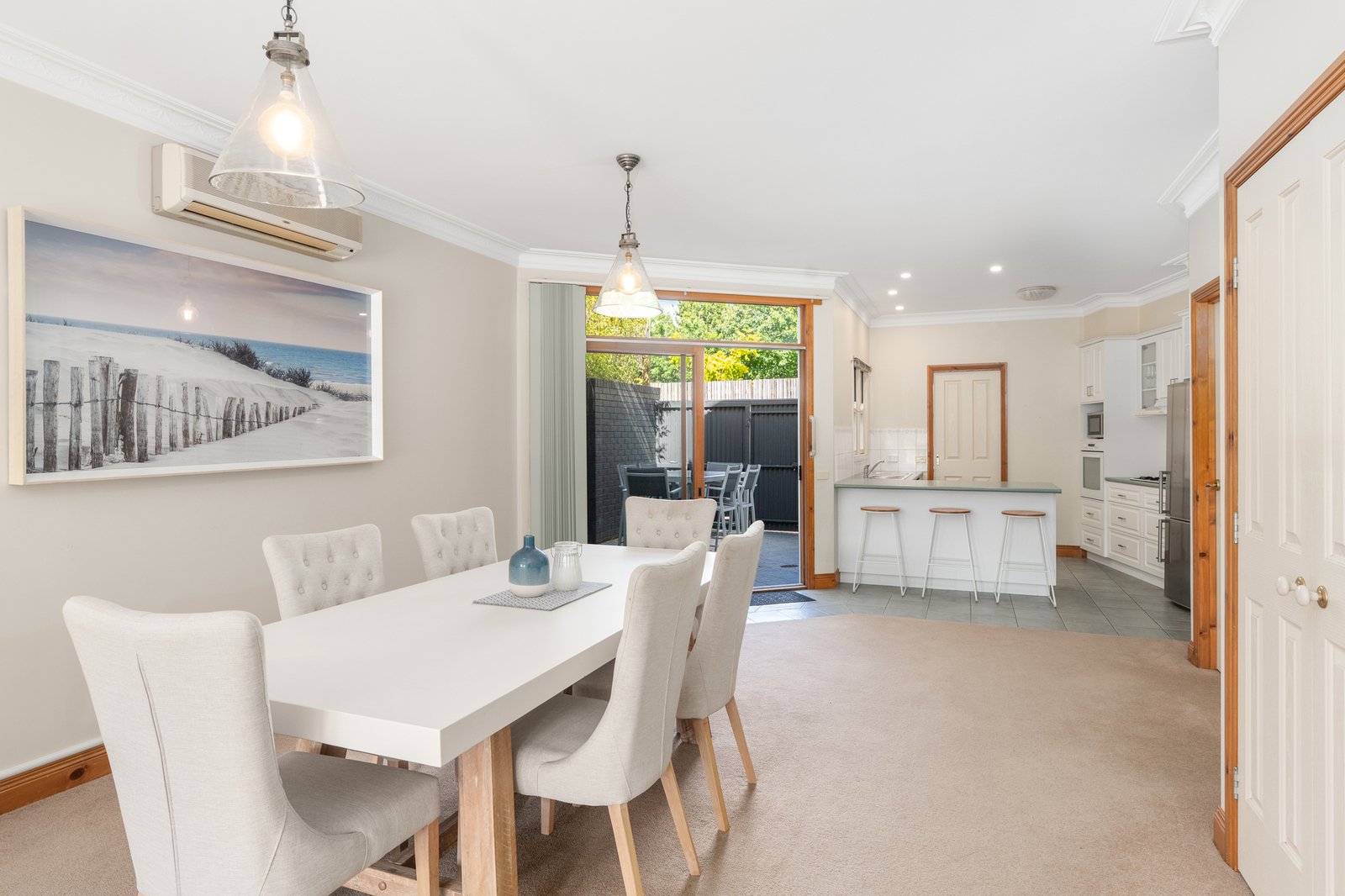 From the moment you arrive, the charming white weatherboard façade and classic picket fence set a welcoming tone. Inside, the open-plan living, dining, and kitchen area forms the heart of the home, a warm and inviting space complete with a gas log fire for cosy nights in. Step outside to the private courtyard, enhanced by a retractable awning for all-season enjoyment. The kitchen is beautifully appointed with a step-in pantry, electric oven, gas cooktop and dishwasher. The ground floor master suite provides a peaceful retreat featuring a generous walk-in robe and ensuite. A powder room and well-fitted laundry with additional storage complete the lower level.