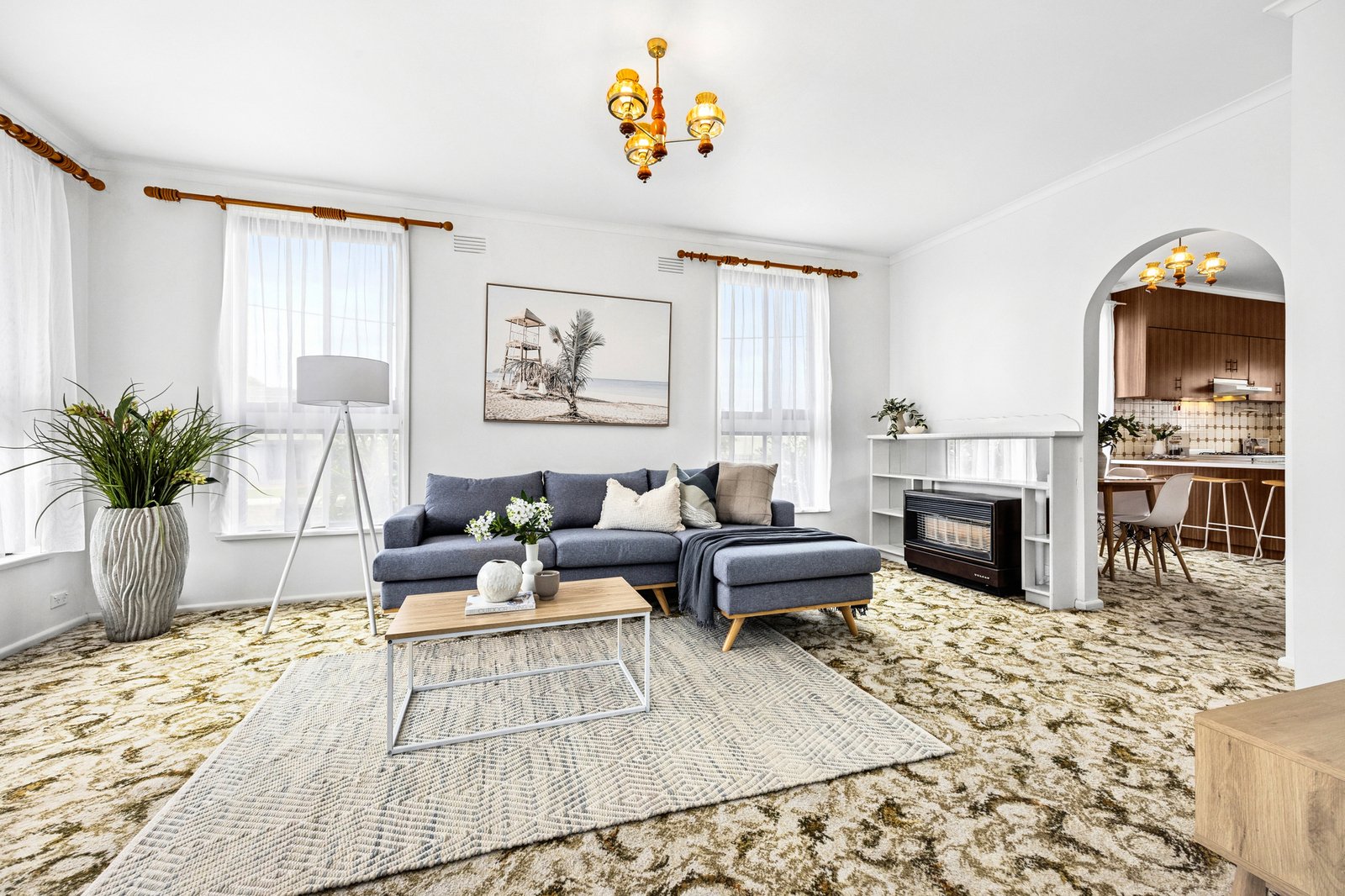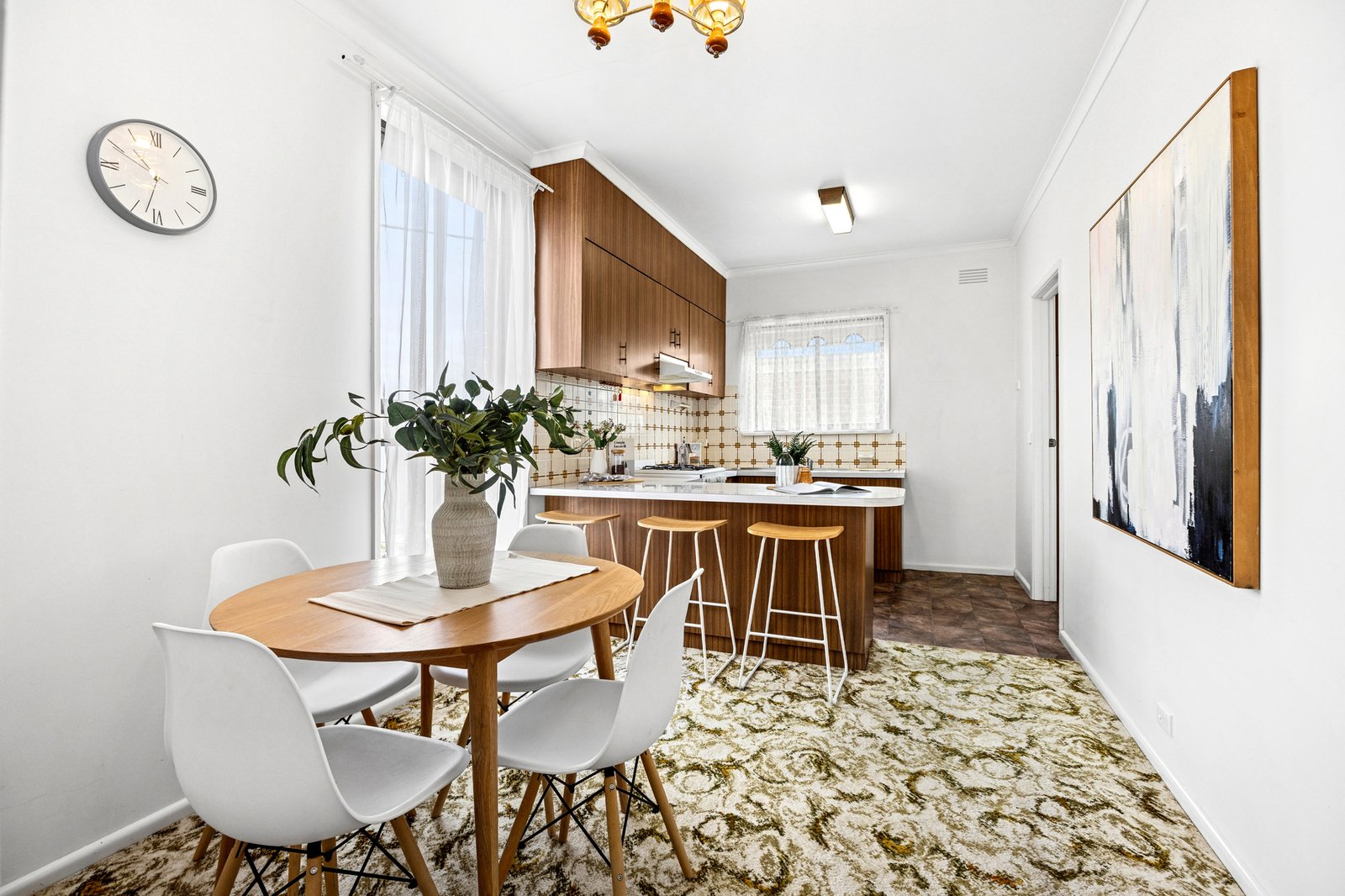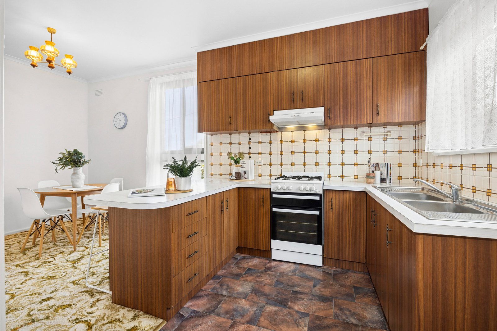 Positioned in a picturesque garden setting, the home is welcoming in appeal. Inside, the living room features original fittings including built-in bookshelves, and pendant lighting, while north facing windows bathe the space in natural light, creating a warm and inviting atmosphere. The adjoining dining area and kitchen continues in the retro theme of the home, with an updated 600mm oven and cooktop, ample bench space and excellent storage.