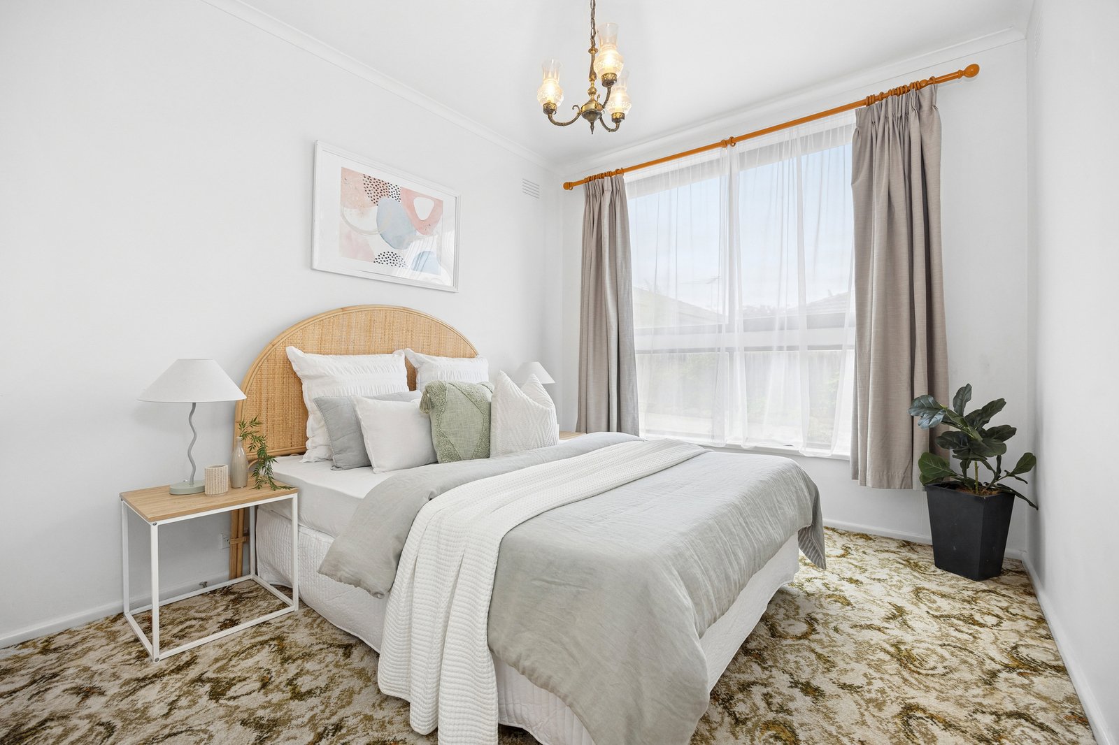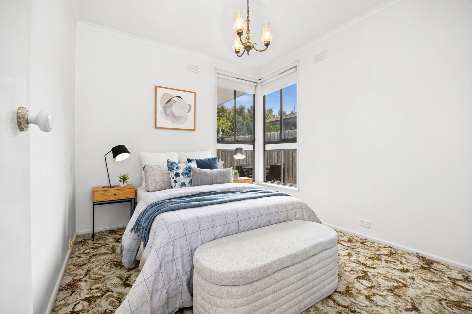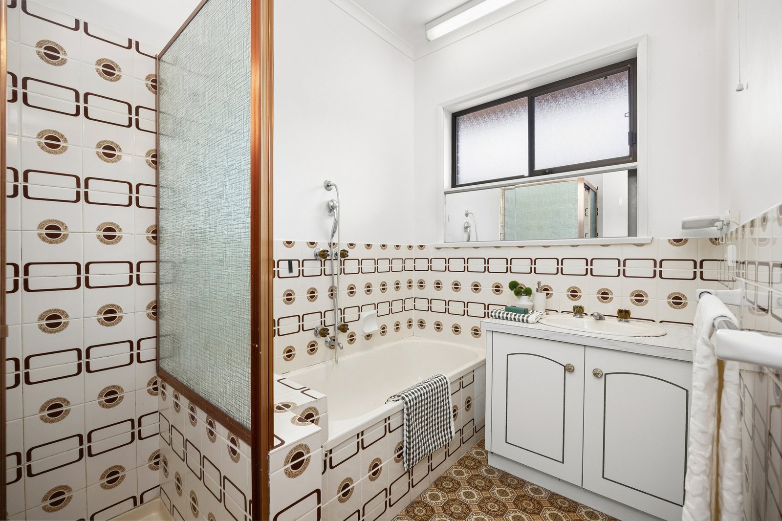 Positioned in a picturesque garden setting, the home is welcoming in appeal. Inside, the living room features original fittings including built-in bookshelves, and pendant lighting, while north facing windows bathe the space in natural light, creating a warm and inviting atmosphere. The adjoining dining area and kitchen continues in the retro theme of the home, with an updated 600mm oven and cooktop, ample bench space and excellent storage.