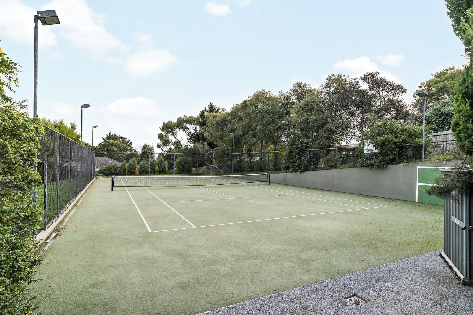 - Solar-heated pool and mod-grass tennis court with lights