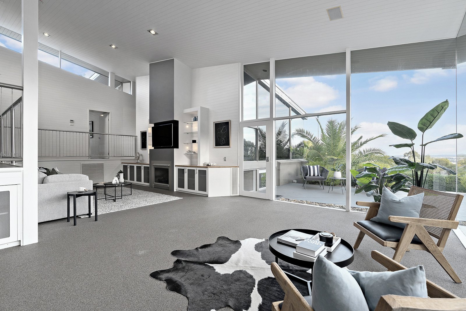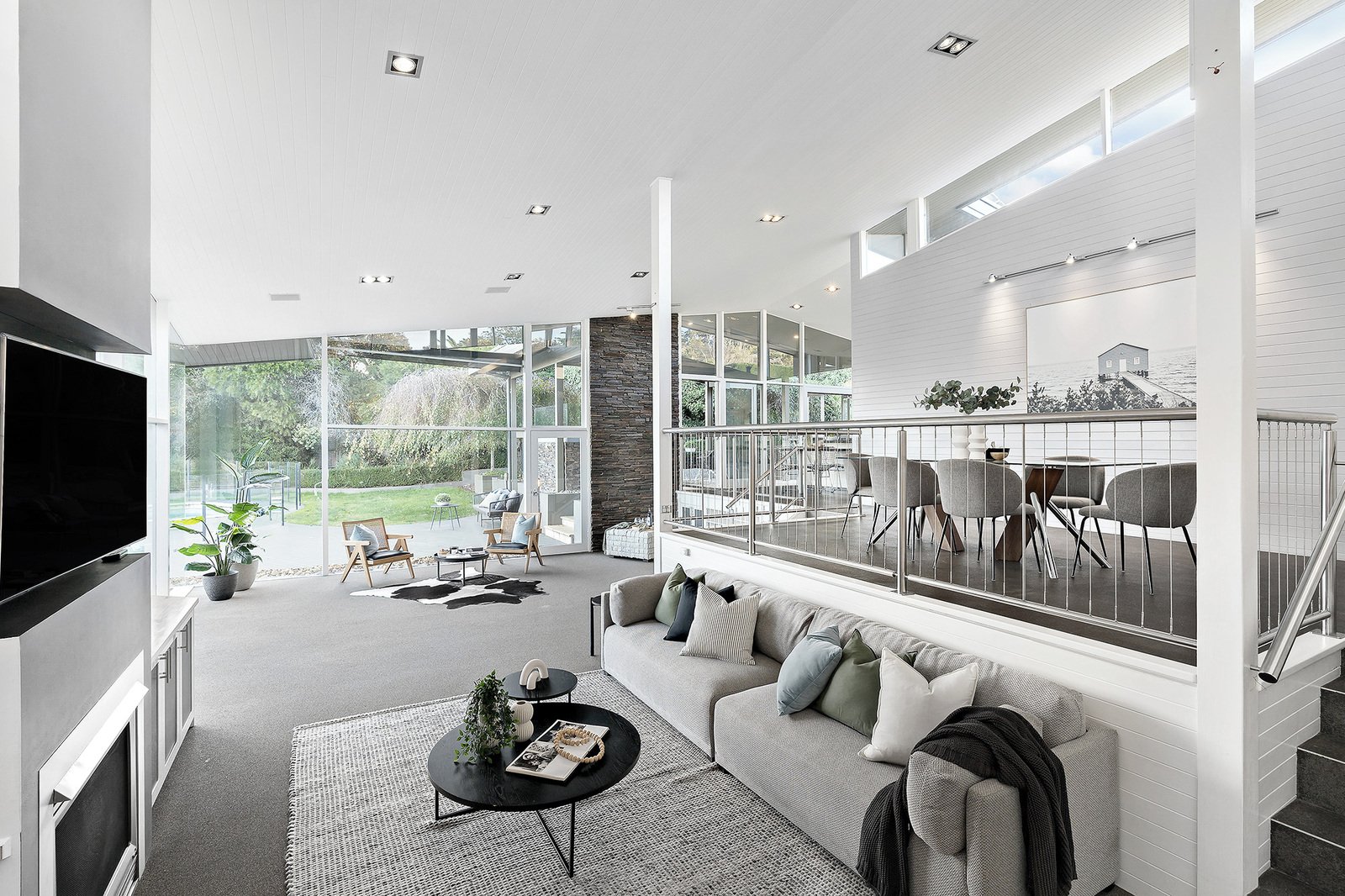 - Expansive open-plan living and dining with cathedral ceilings, Heat & Glo fireplace, and floor-to-ceiling windows