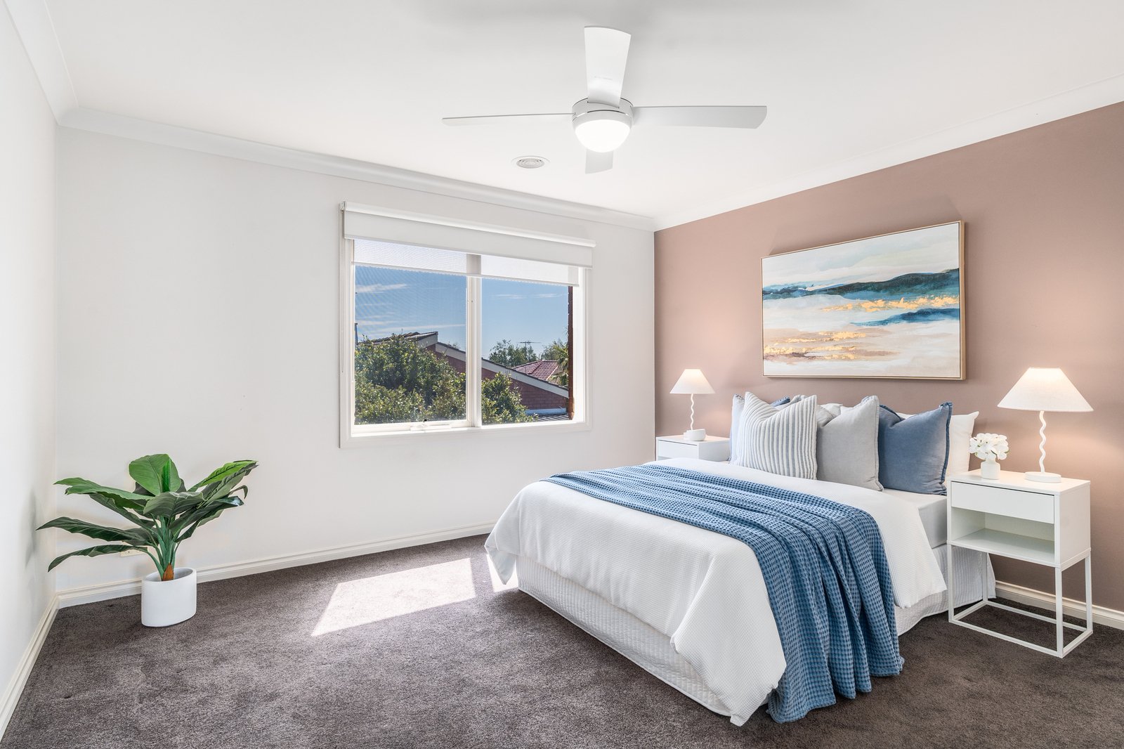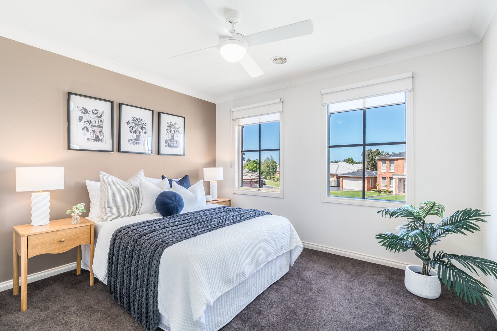 Additional features include ducted heating, split system heating and cooling on both levels, ceiling fans in all bedrooms, under-stairs storage, ground floor powder room, well-appointed laundry, and upstairs linen storage.
