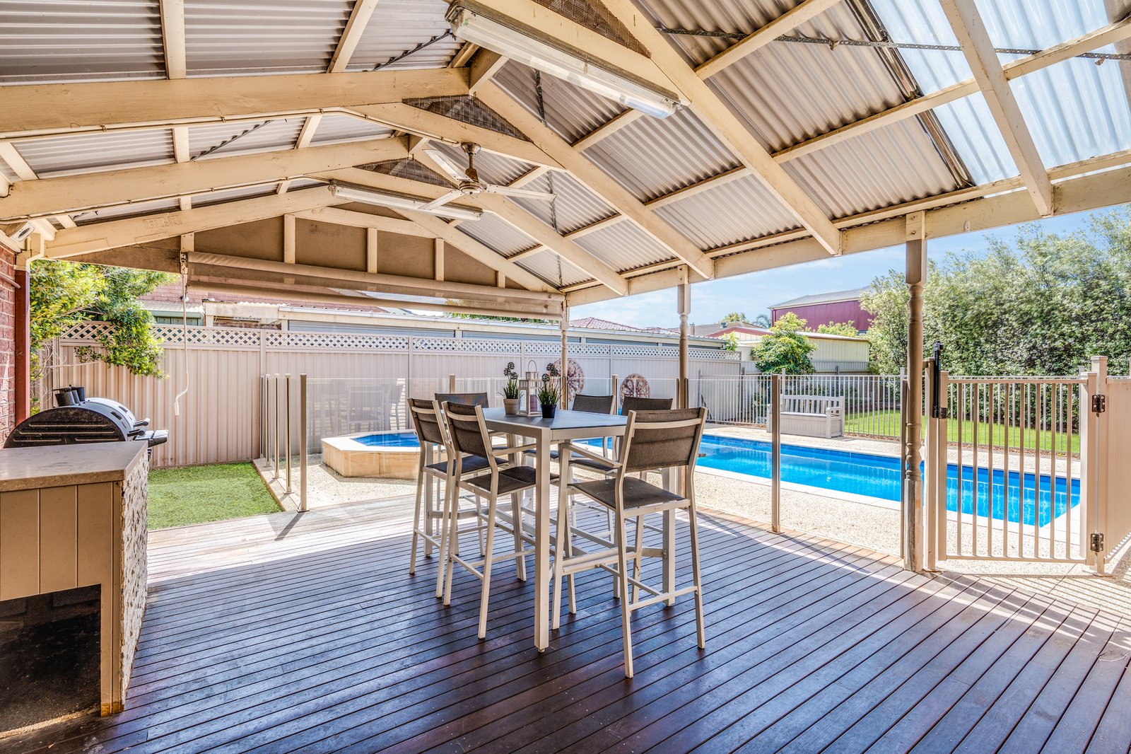 Outside, the north facing alfresco provides a private setting for poolside relaxing or entertaining, complete with a ceiling fan and pull-down blinds for added comfort. The solar-heated in-ground pool brings a touch of luxury to warm summer days, while the adjoining spa offers the perfect place to unwind. The large block accommodates a secure lawn area for the kids to play, with established trees creating a tranquil environment. The oversized double garage allows additional space for workshop facilities, with rear roller door and pedestrian access to the alfresco. The wide block also caters for excellent side access to the backyard.