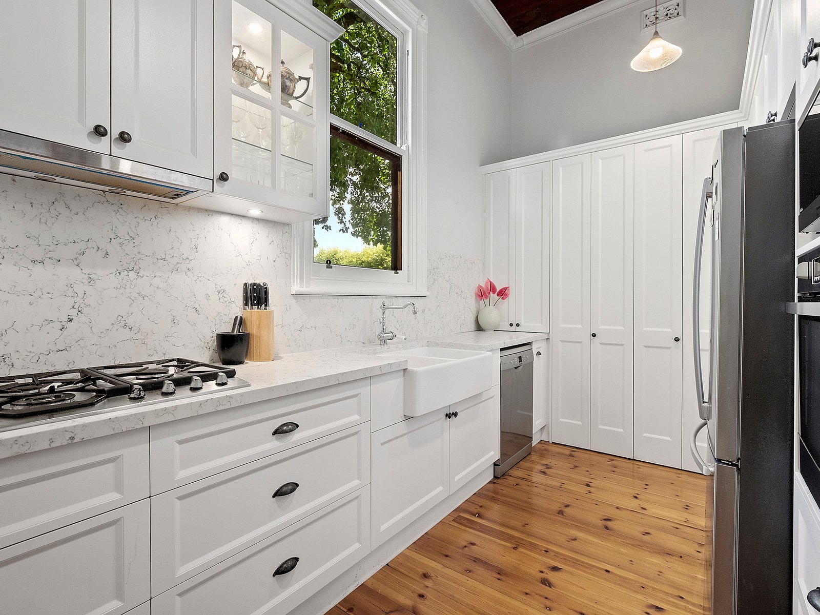 Accommodation includes three generous bedrooms and a fourth bedroom (or study) featuring the original lino floor covering. Large lounge and dining rooms enjoy easy access to the new galley-style kitchen. Custom-designed, it offers culinary enthusiasts a double farmhouse sink, stone benchtops and splashbacks, a gas cooktop, an electric oven, a Bosch dishwasher, ample storage and a cleverly concealed European laundry. Families will appreciate two bathrooms to ease the morning rush, while a spacious vestibule doubles as a study or sitting/reading nook.