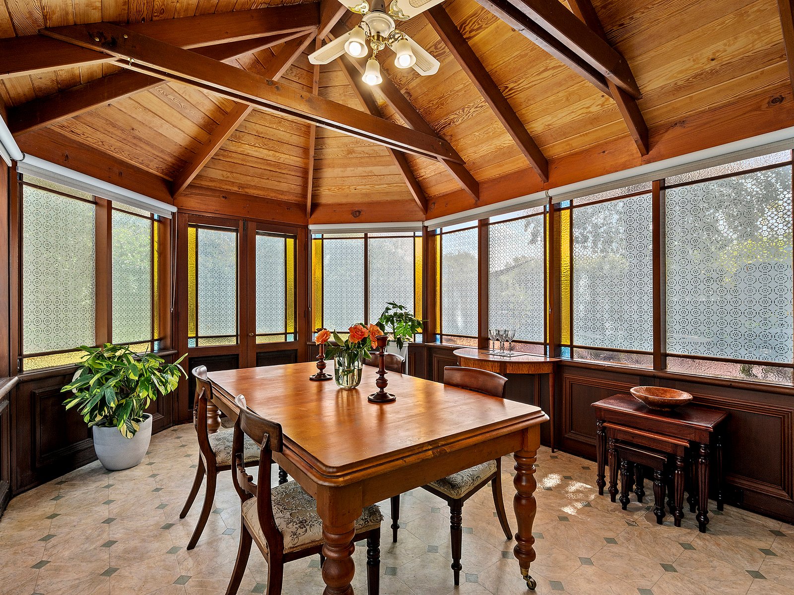 Ducted heating/evaporative cooling fills the interiors, while a split system unit ensures effortless year-round comfort. Designed to blend with Beebe's work, a rear timber and glass conservatory room added some years ago, is the ideal place to spend cosy mornings bathed in winter sunshine and cool summer evenings with the French doors open to the rear garden.