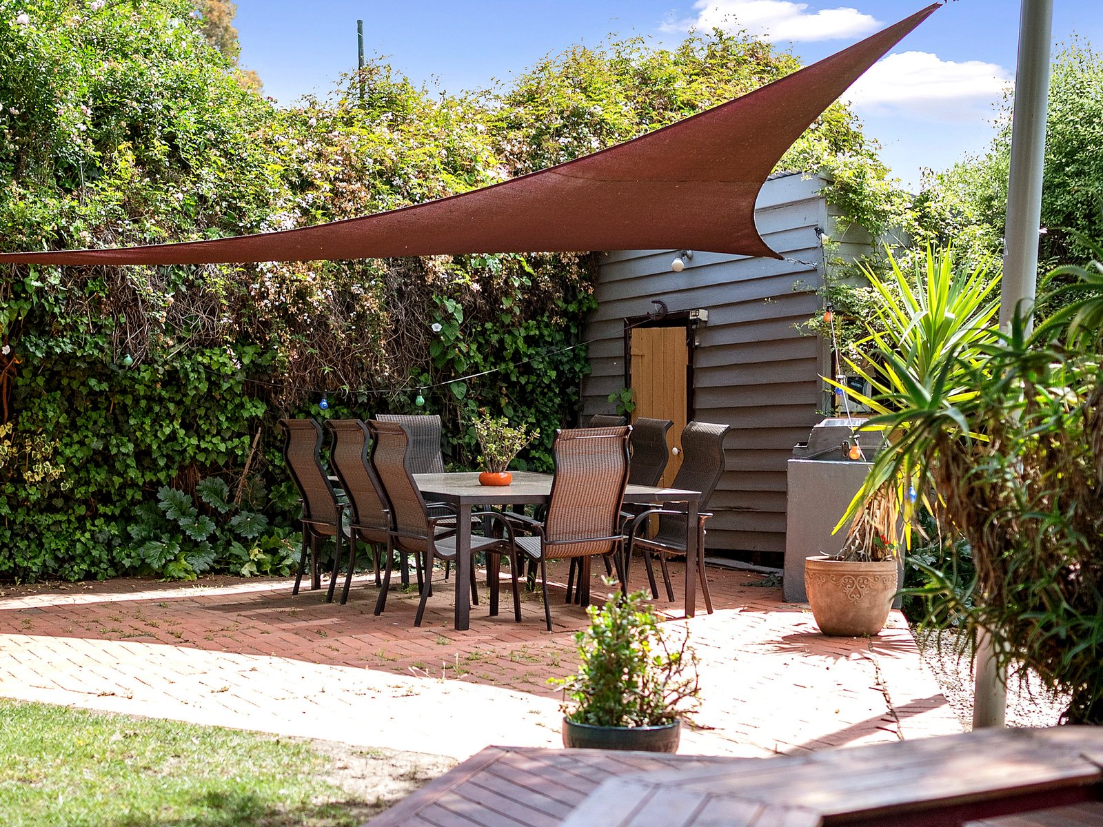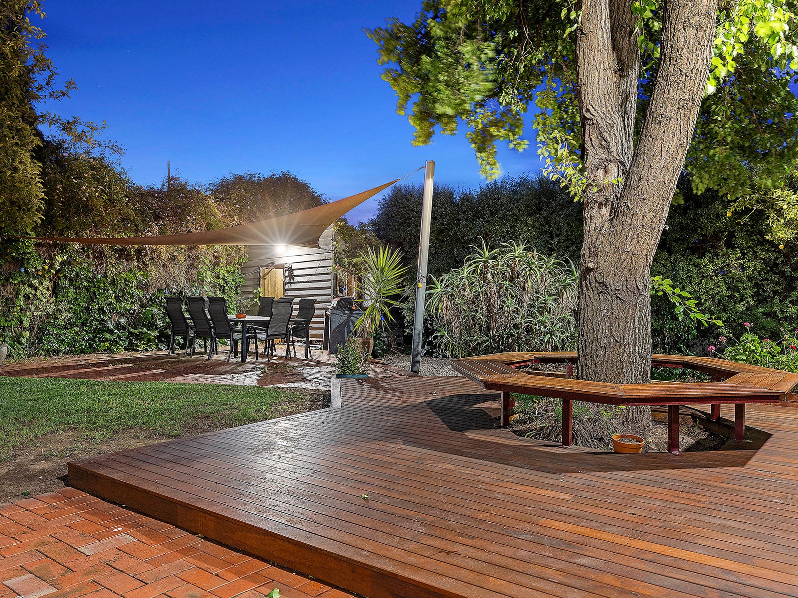 The backyard includes a substantial timber deck and seating surrounding a magnificent white mulberry tree, along with a paved and shaded alfresco area, providing magical spaces to relax, entertain, and savour the fully irrigated private gardens. For those needing extra storage, a 3 x 3m tool shed, the original 3 x 6.5m garage offers dual-purpose functionality, and a carport sits behind the gated side driveway.