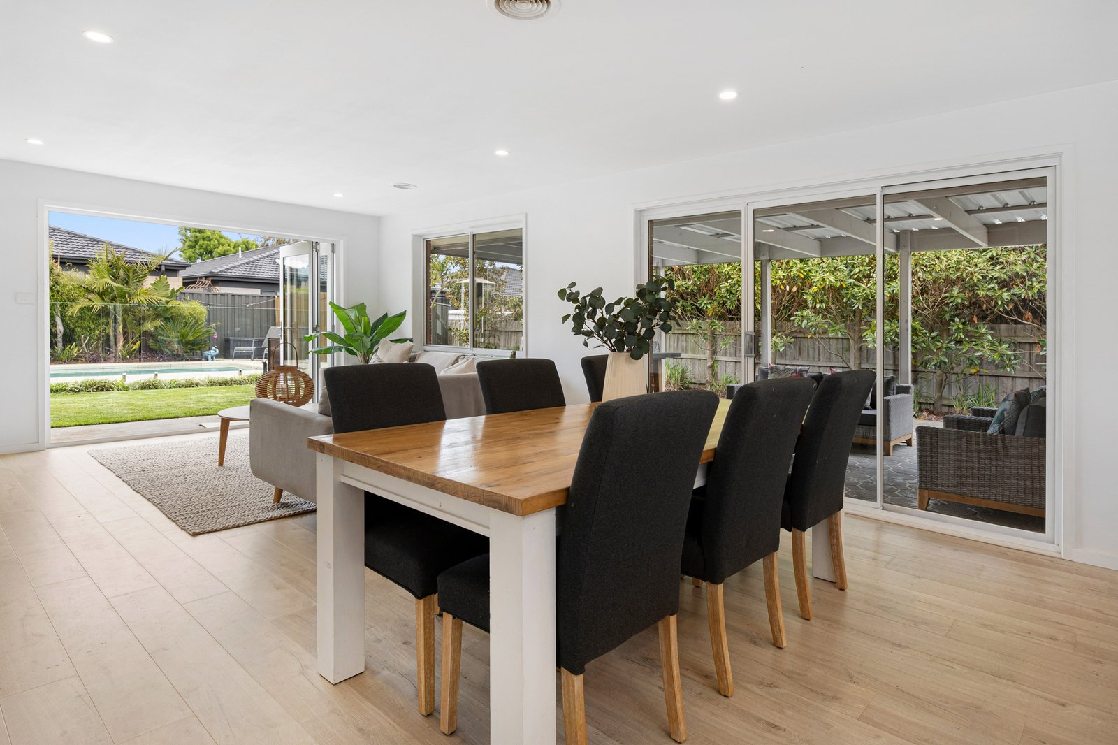 Inside, the stunning new kitchen forms the showstopping centrepiece of the home, featuring extensive stone benchtops, premium appliances and a walk-in pantry. An adjoining open plan dining area flows out to a covered terrace with room for alfresco dining and outdoor lounging, while the lounge area has concertina doors opening out to lawns and a sparkling inground pool and pool pod.