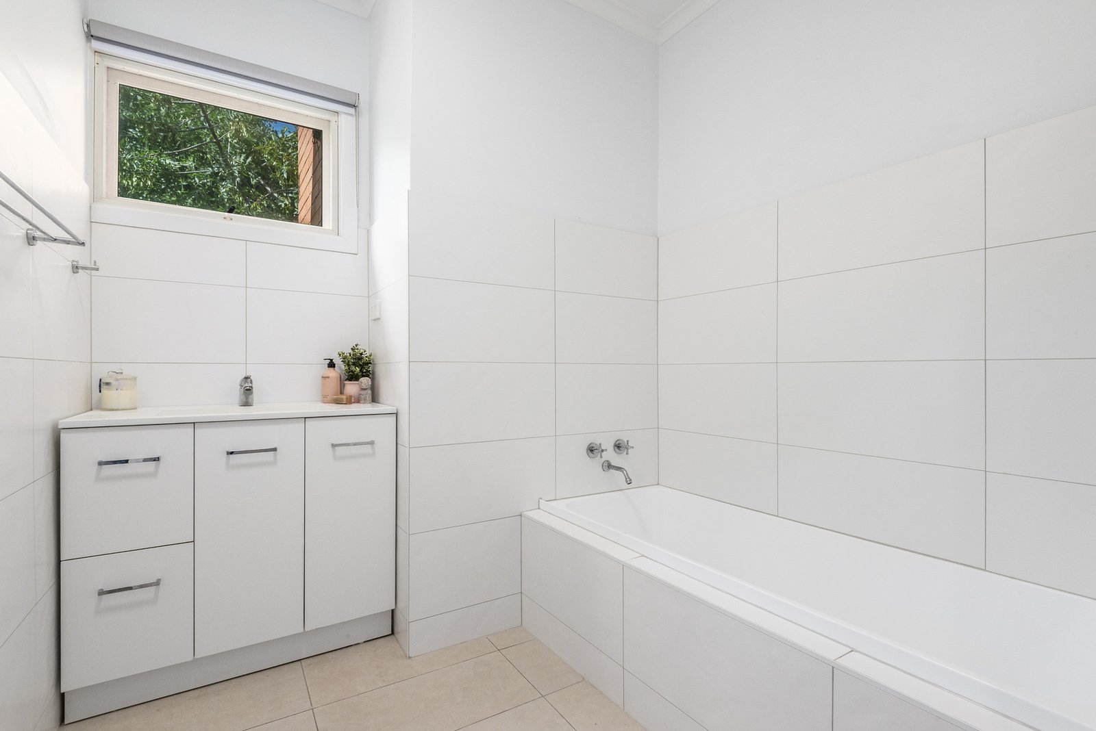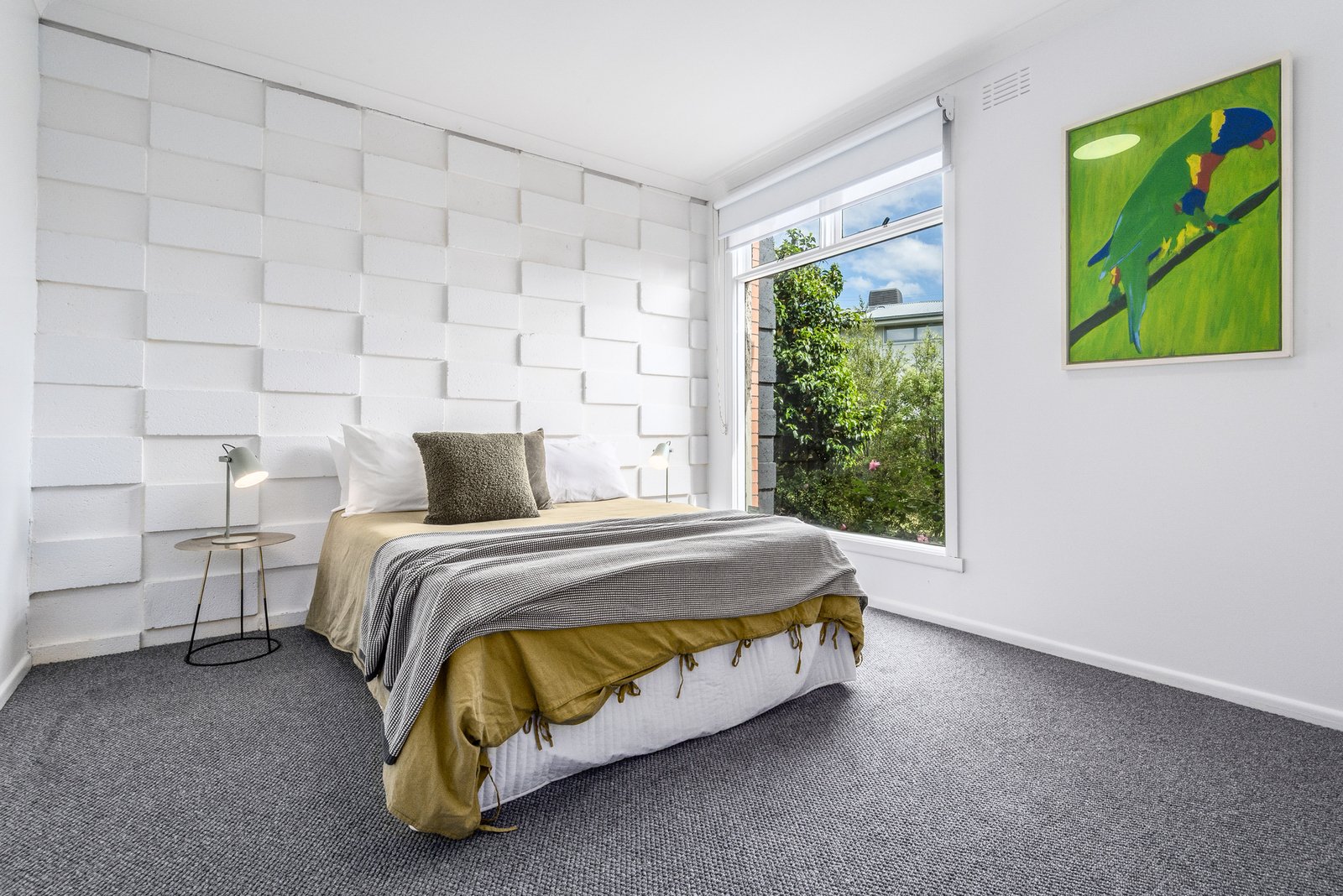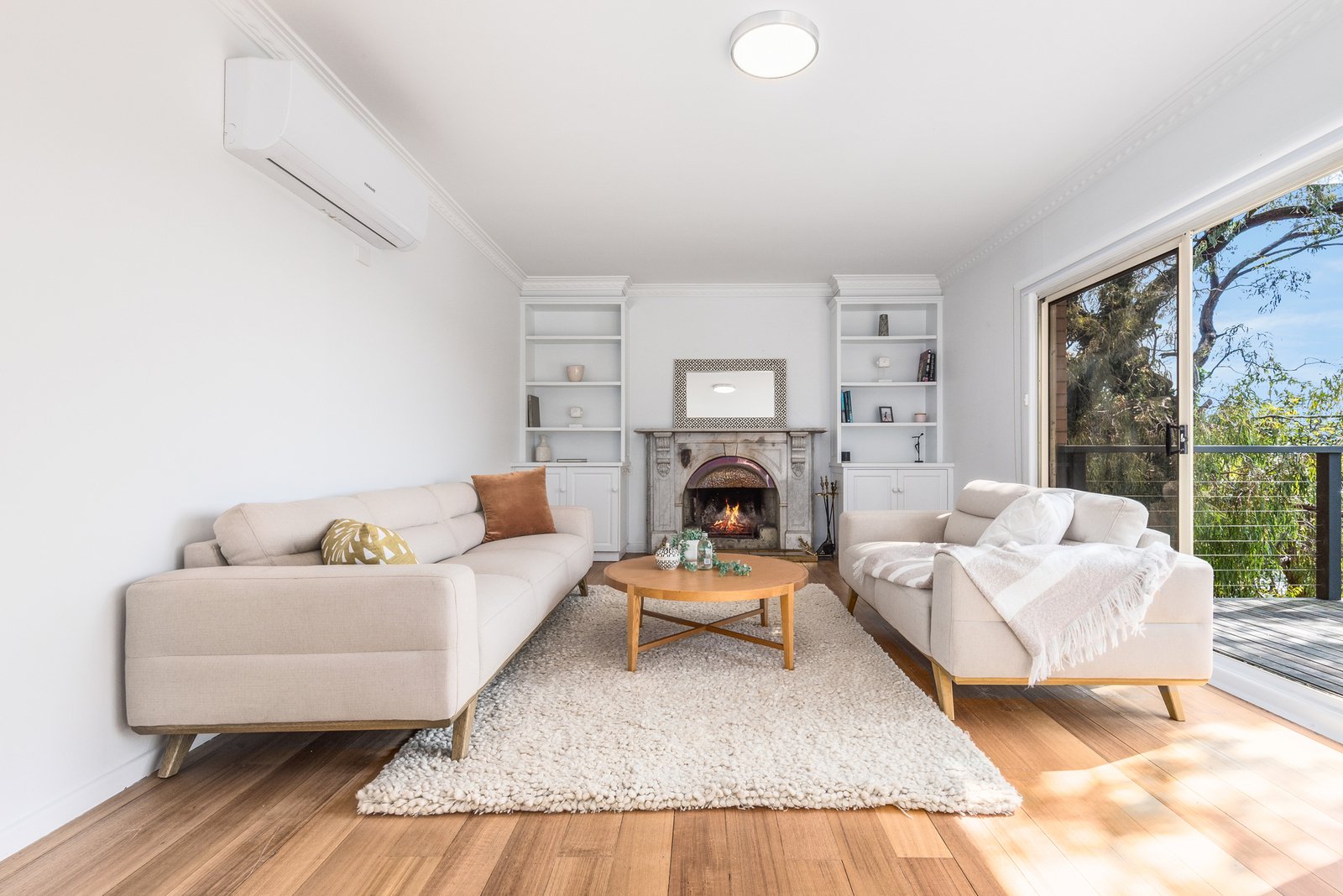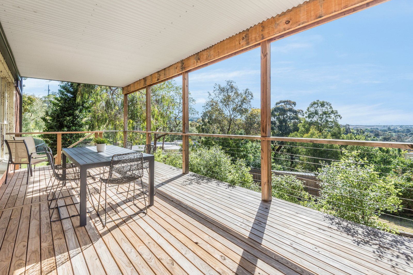 The split-level design steps down to the main living zone, the well-appointed kitchen equipped with modern cooking appliances, dishwasher, excellent storage, a central island, and a breakfast bar with a view. The adjoining dining area flows through to a light-filled living room with built-in bookshelves and an original fireplace for a warm and inviting ambience. Both the dining and living areas connect to a spacious balcony, creating an impressive layout for indoor-outdoor entertaining, with a bird’s eye view of the lush surrounds of the Barwon River, Queens Park and Fyansford. A spacious second living area on the lower level offers a quiet space to relax or send the kids to play, with large windows looking out to the rear yard and beyond.