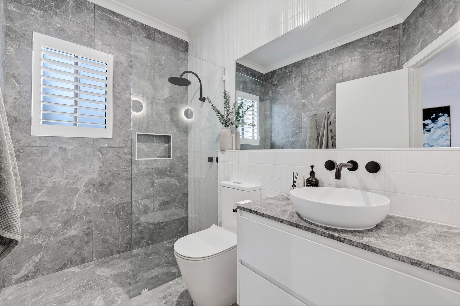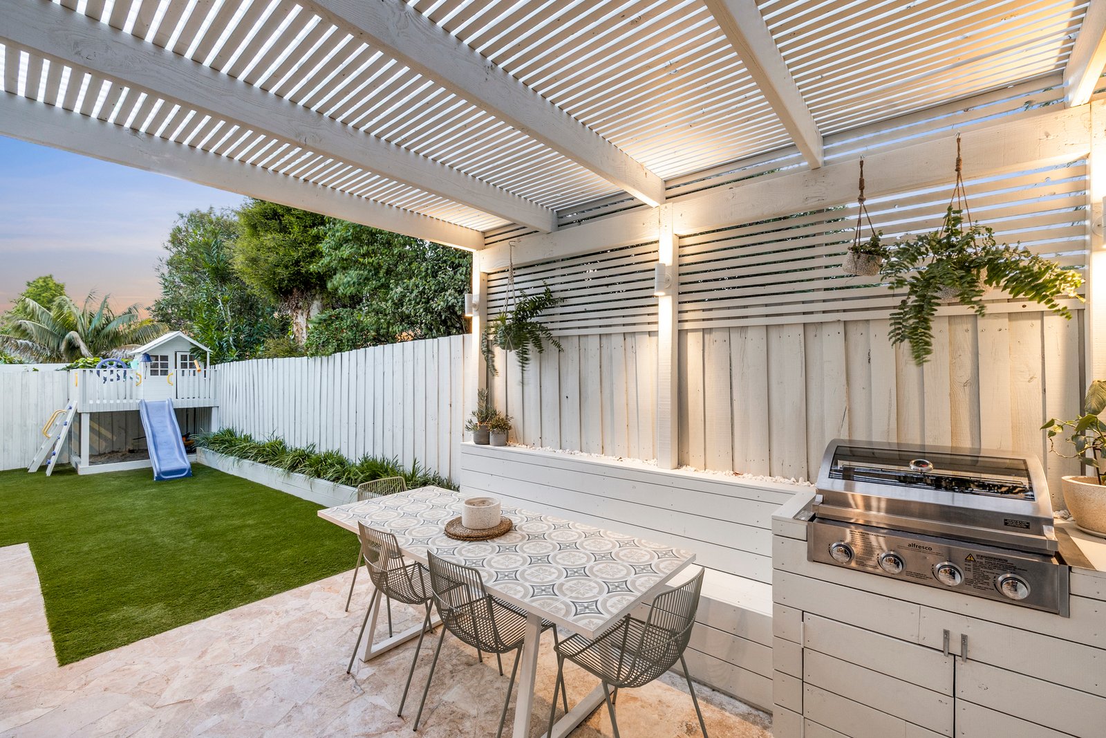Under a soaring split-level ceiling that harnesses the north light, the home welcomes with hardwood floors. Comprises a lounge, dining and inviting paved pergola that all flow together. Overlooked by a stylish stone kitchen with dishwasher and terrific storage.