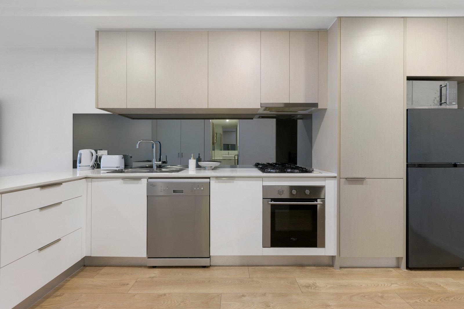 Stylishly appointed, with wide-board oak flooring and a host of high-end finishes adding to its appeal, the ground floor residence features a generous open plan living/dining zone with access to a private suntrap terrace plus a sleek streamlined kitchen with stone benchtops, mirrored splashback and quality appliances – including a gas cooktop and stainless steel dishwasher.