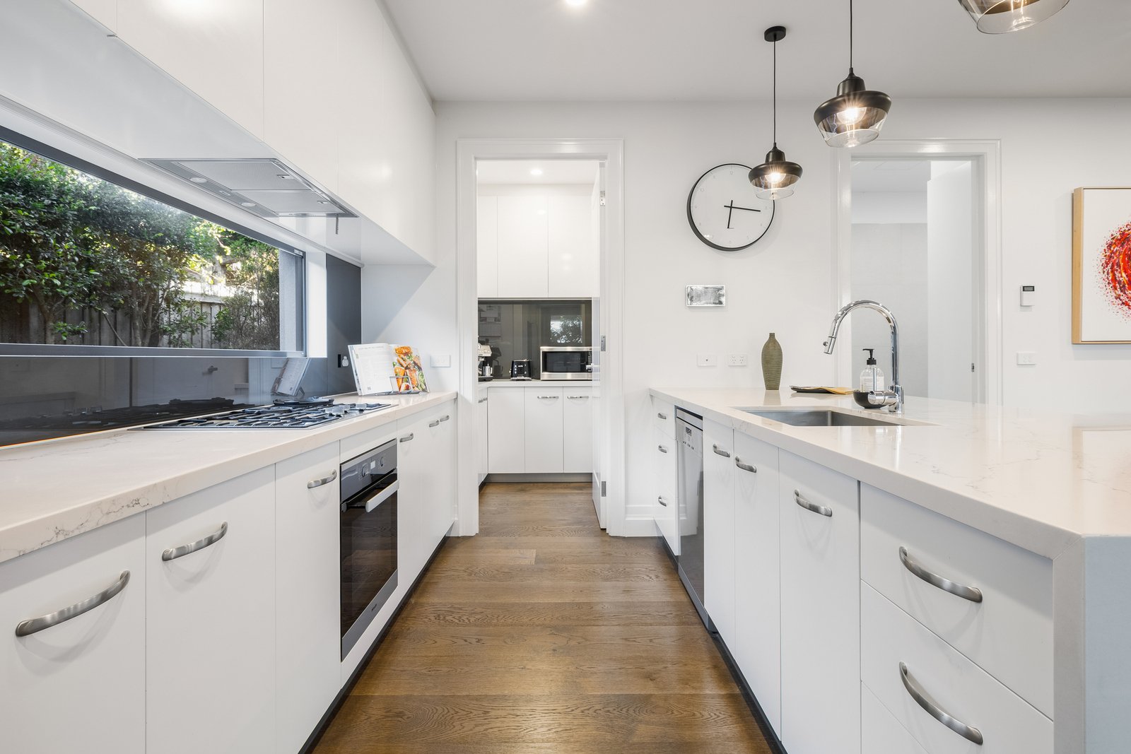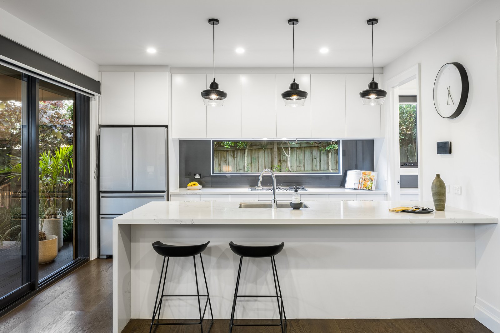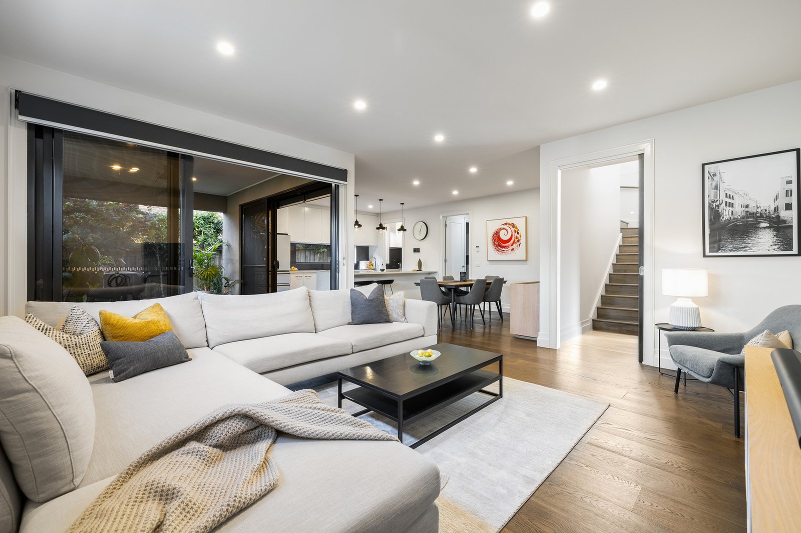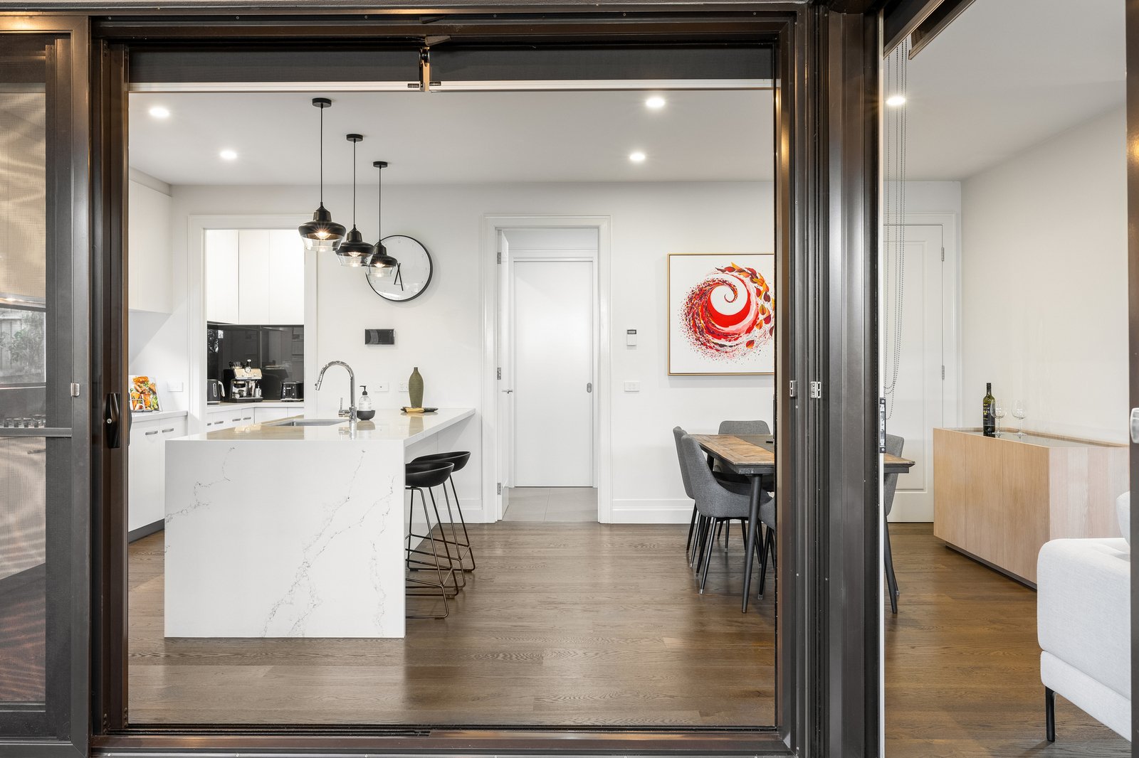 The ground floor reveals a thoughtfully designed layout highlighted by a spacious main bedroom suite complete with a walk-in robe and sleek ensuite, offering the convenience of single-level living for parents, downsizers, or visiting guests. A light-filled living area flows seamlessly into the open dining domain, perfectly complemented by a designer kitchen appointed with stone bench tops, island breakfast bar, Miele appliances and an elegant butler’s pantry. The transition to the covered alfresco zone is effortless with stacker sliding doors opening wide to create an inviting setting for year-round entertaining.