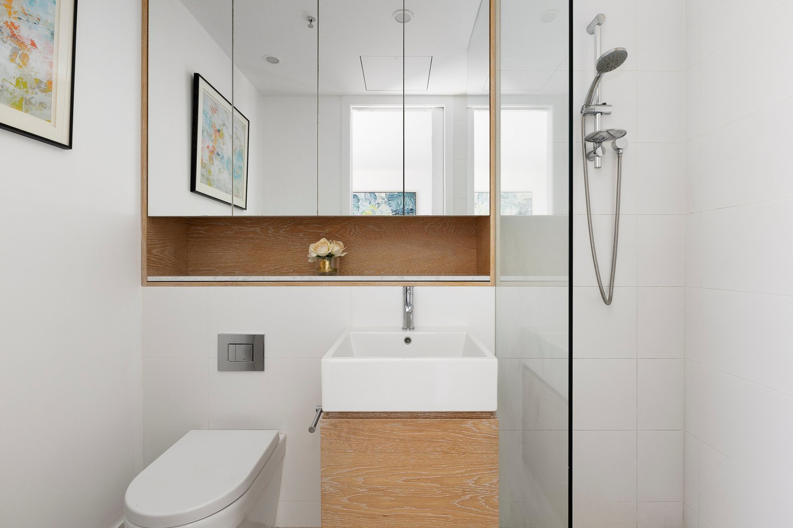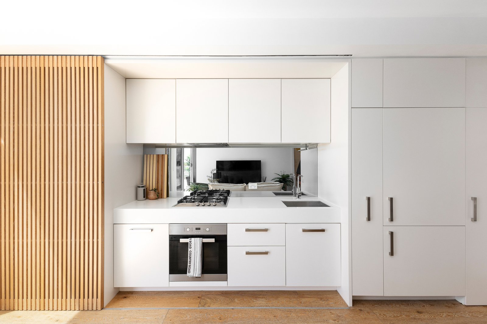 Inside, pale oak floors flow through light-filled open-plan living, anchored by a fully integrated Miele kitchen with Caesarstone benchtops and mirrored splashbacks. A clever study alcove adds flexibility, while floor-to-ceiling glass frames sweeping city and bay views.
