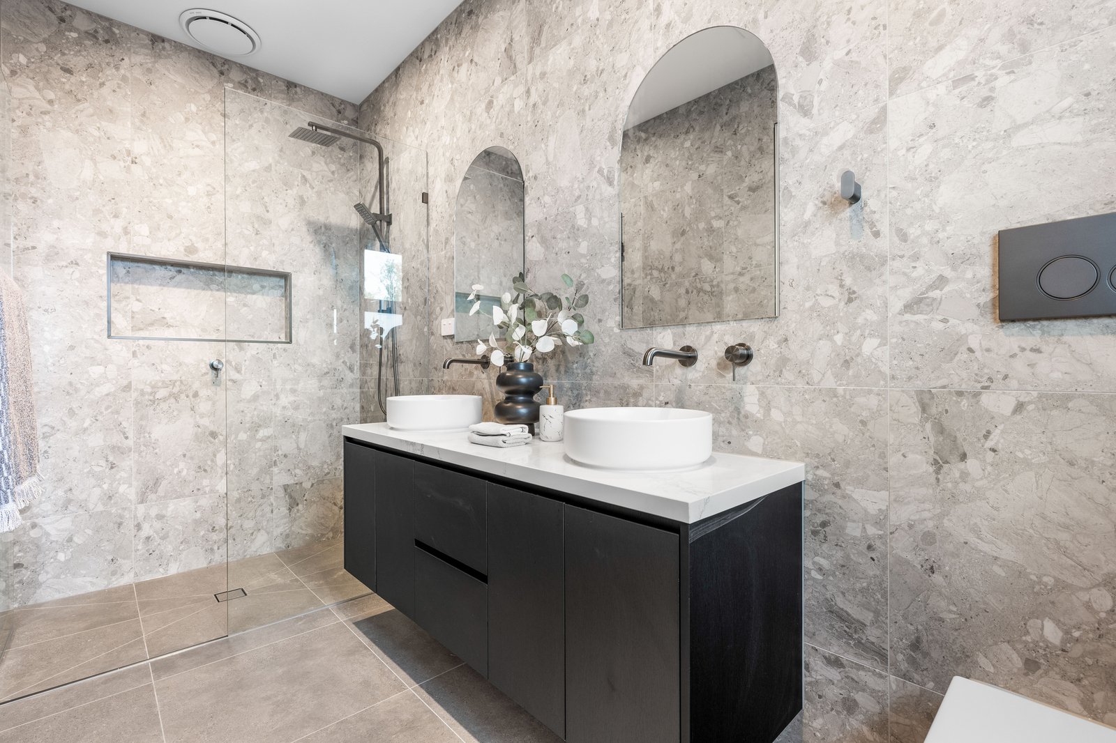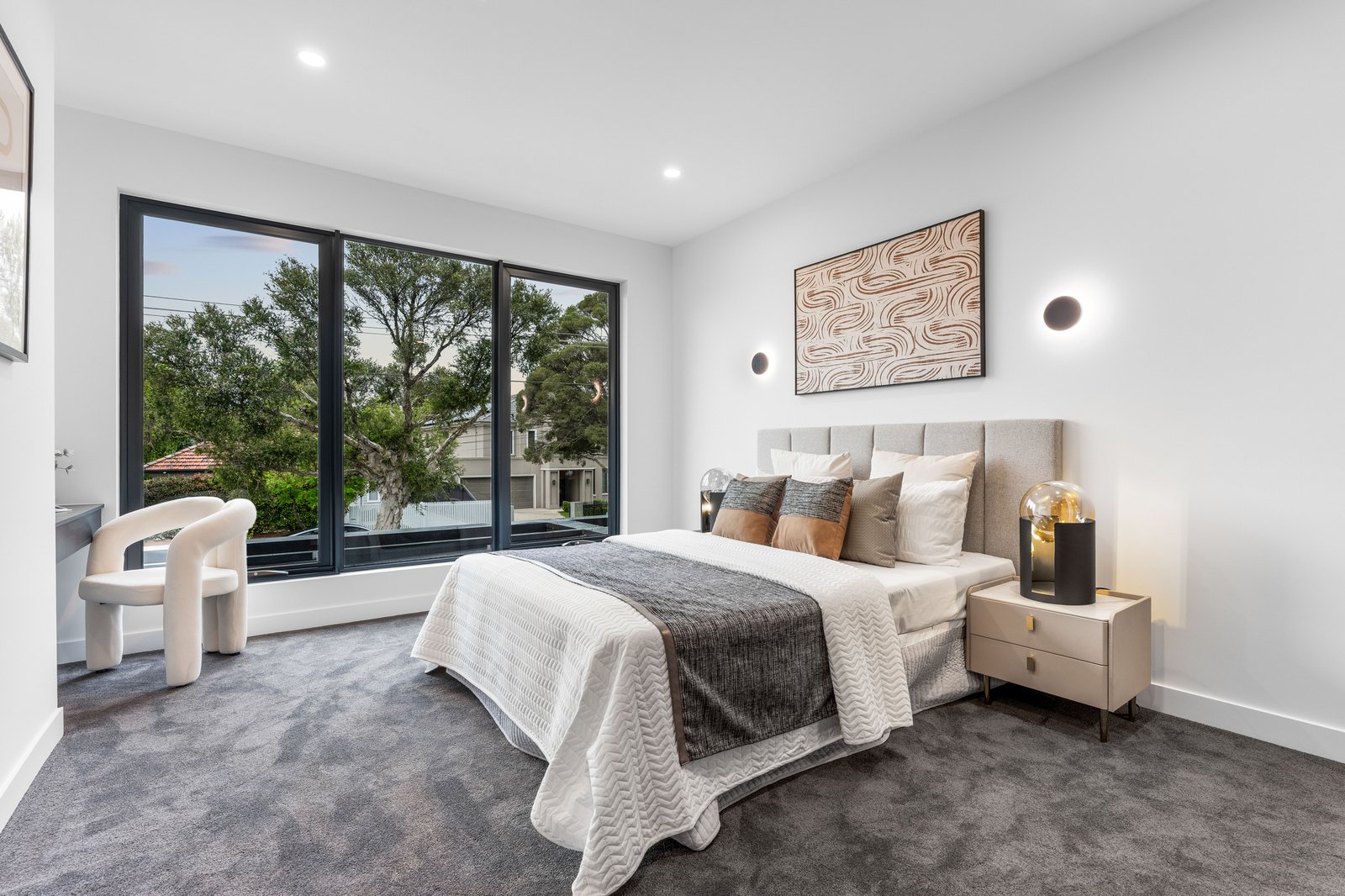 Starring floor-to-ceiling terrazzo-style tiles and concealed-cistern WCs for each bathroom, the home is styled with streamlined push-open linen-presses & robes, and designer lighting - including Dot lights to the stairwell and a sparkling kitchen strip-pendant. Showcasing clever design features including a dual-duty butler’s pantry/ laundry, a bar area to service the al fresco kitchen, and his-and-hers master walk-in and built-in robes, it's all been considered here. Climate controlled and secured by Smartphone video-entry, keyless entry and an alarm, the home is set in sun-catching north-westerly grounds with an auto-garage plus parking.