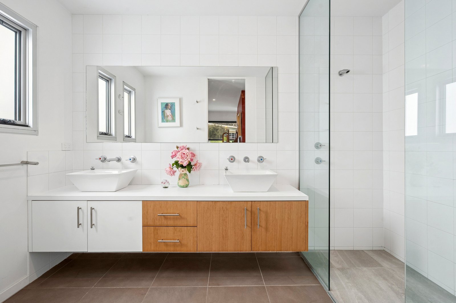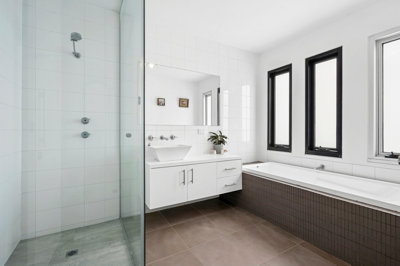 Upstairs, the accommodation is generous and thoughtfully designed. The main bedroom offers a peaceful retreat, complete with excellent robe storage, a modern ensuite, and large windows that frame a beautiful leafy outlook. Two further bedrooms – each with their own walk-in robes – are serviced by a stylish central family bathroom. An additional study nook provides further convenience for work or study.