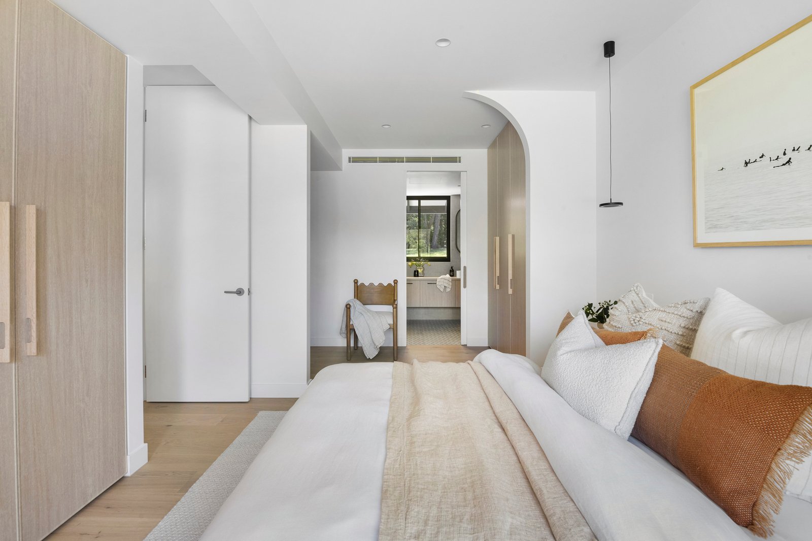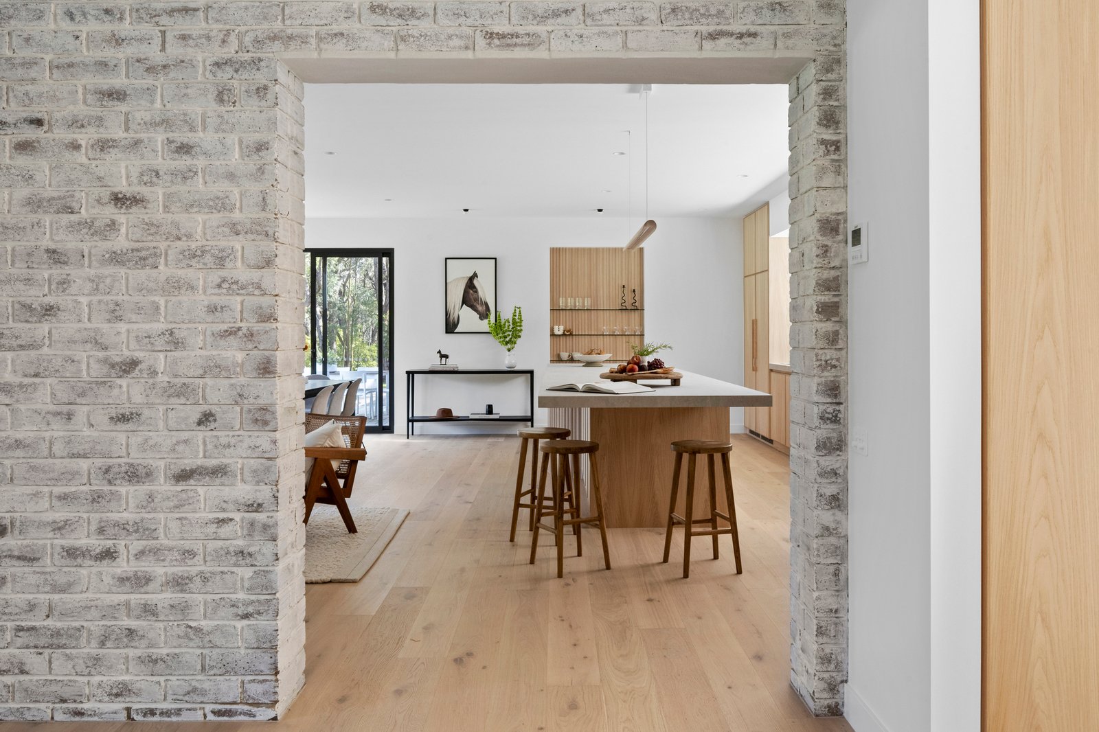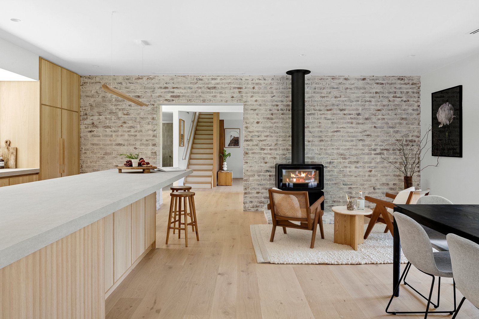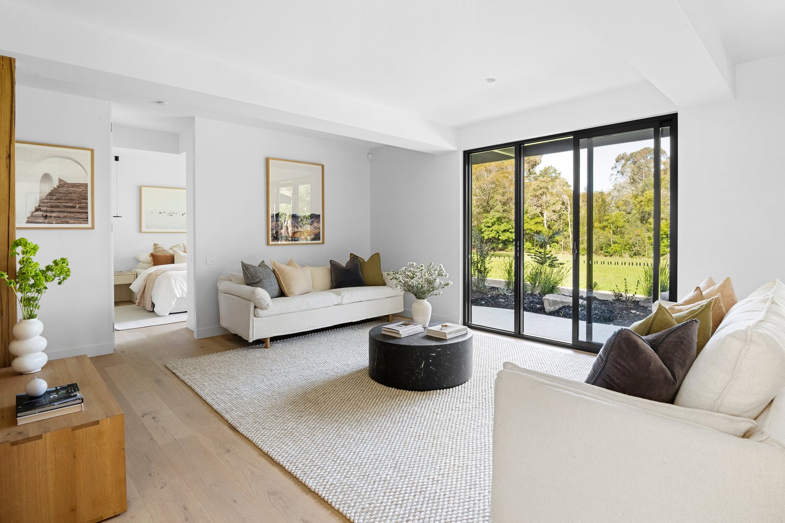 Across an expansive interior footprint and 2.6-metre ceilings, living, dining and entertaining domains unfold with natural ease, where limewashed brickwork, engineered oak flooring and minimalist lines fuse contemporary, organic design with subtle rural undertones. Centred around a statement island that shares the warmth of the fireside living area, the stone kitchen forms a natural axis within the home’s social flow, equipped with a Falcon induction range, integrated refrigeration and generous storage for effortless meal preparation and entertainment. Operable double glazing softens the divide between interior and landscape, unfolding to an undercover alfresco deck, firepit and inviting north-facing pool embraced by layered greenery and veggie planters.