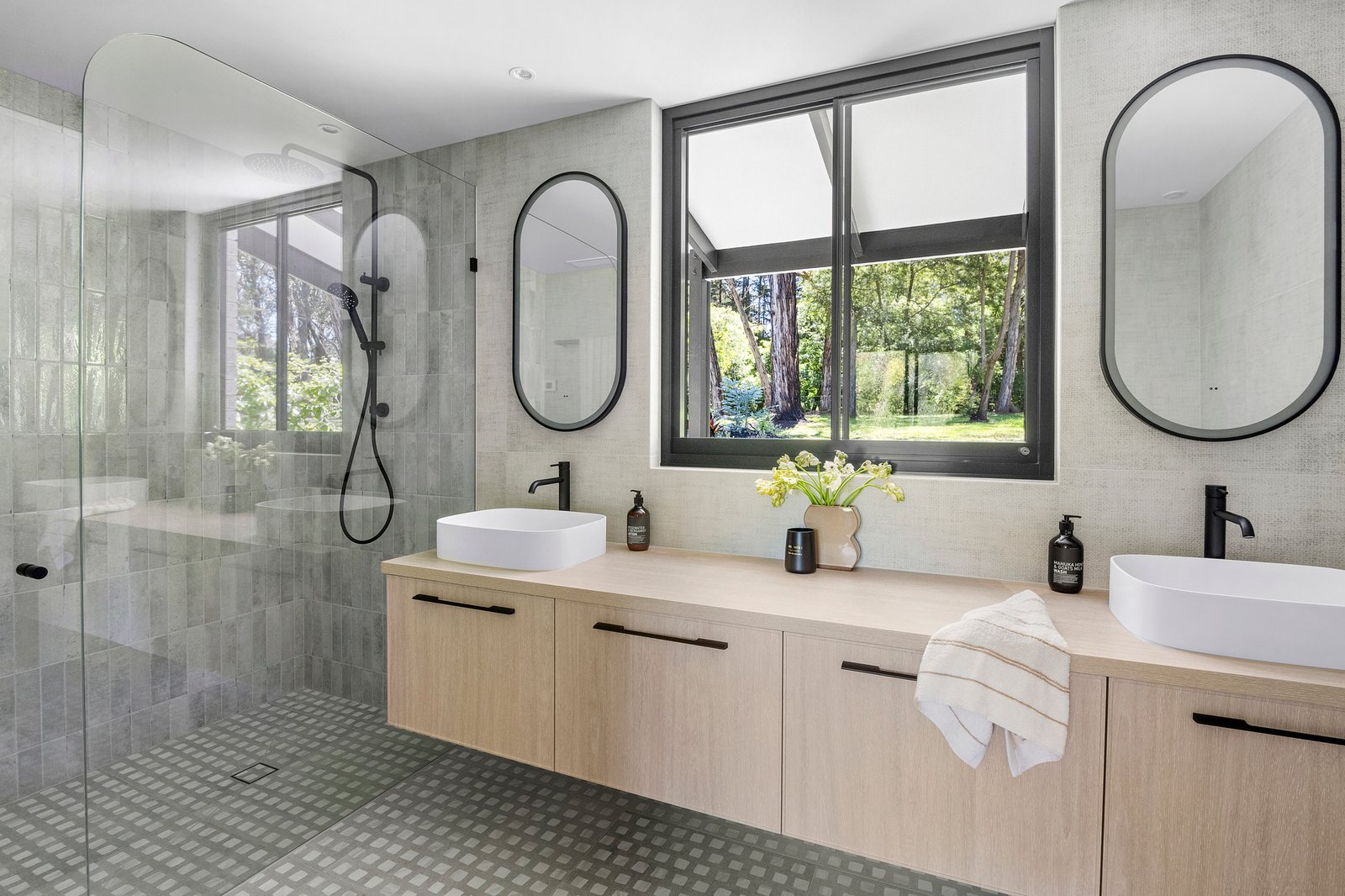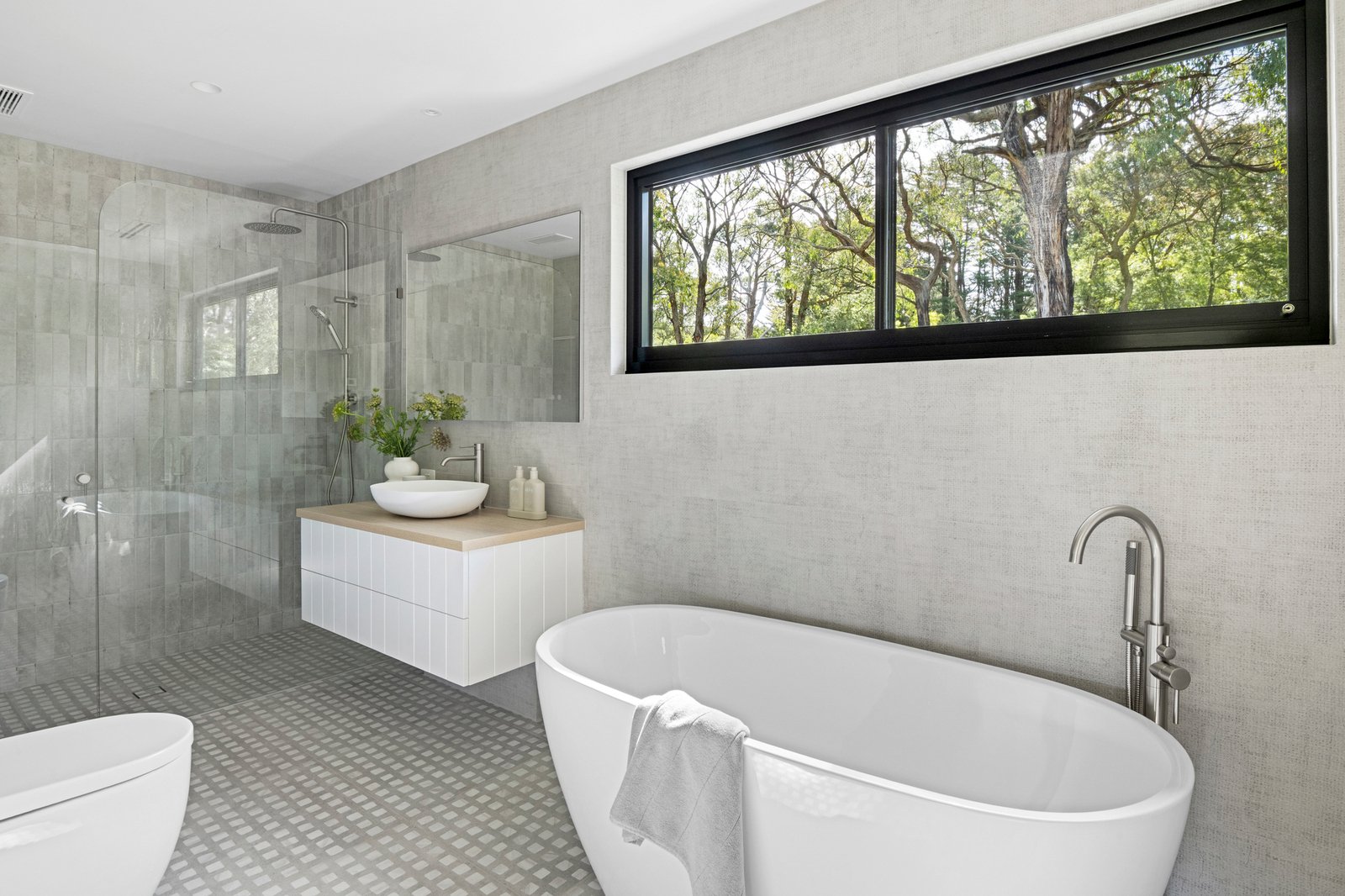 Large in scale and designed for longevity, the primary suite rests on the lower level with a walk-in robe, built-in joinery and a luxurious ensuite detailed with floor-to-ceiling tiling and twin vanities. Upstairs, three additional bedrooms share a light-filled retreat/rumpus opening to full-width deck and a beautifully appointed bathroom with a freestanding bath and brushed-nickel fittings, offering peaceful separation for family or guests. Laundry/3rd bathroom services the pool area.