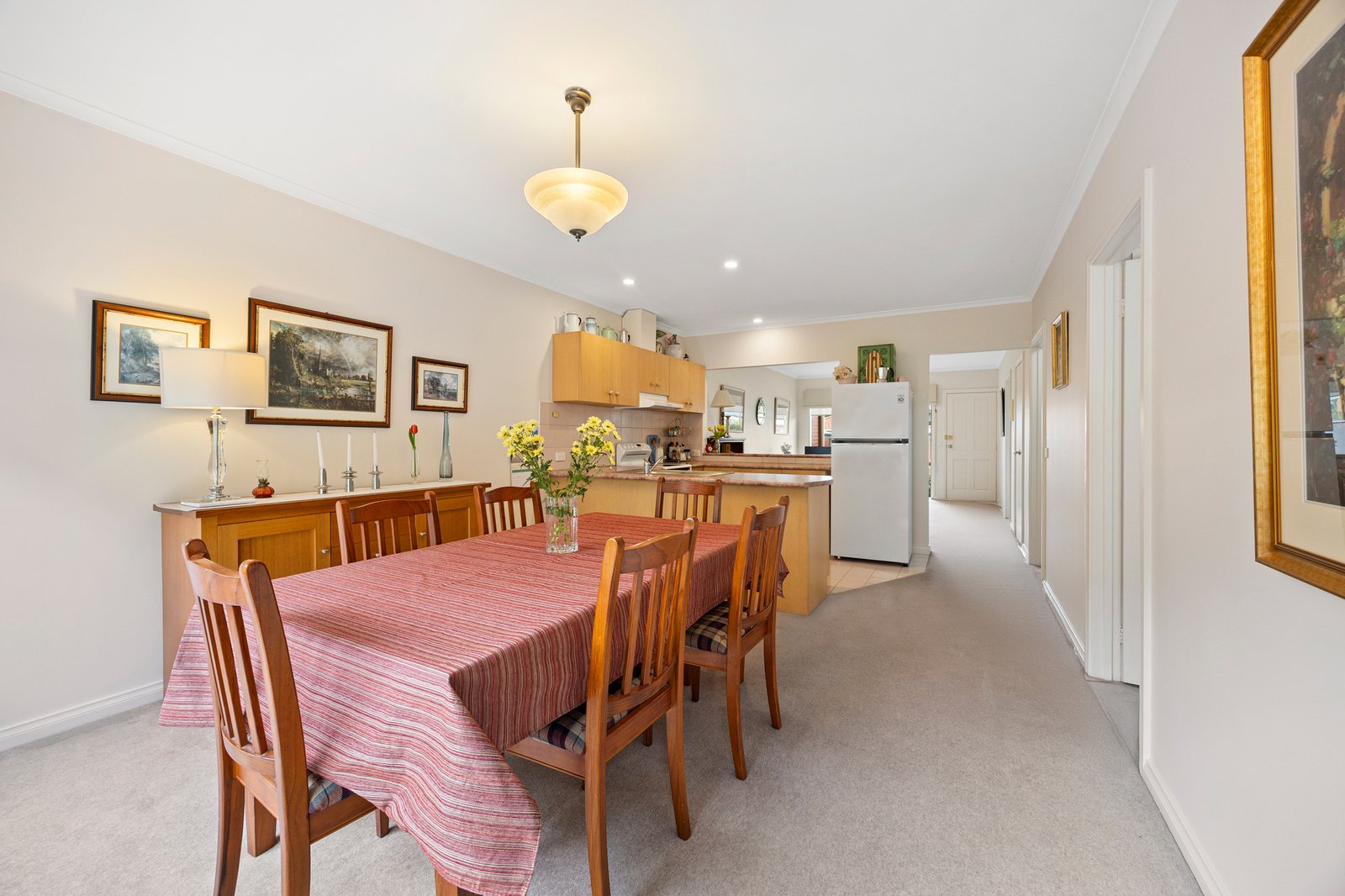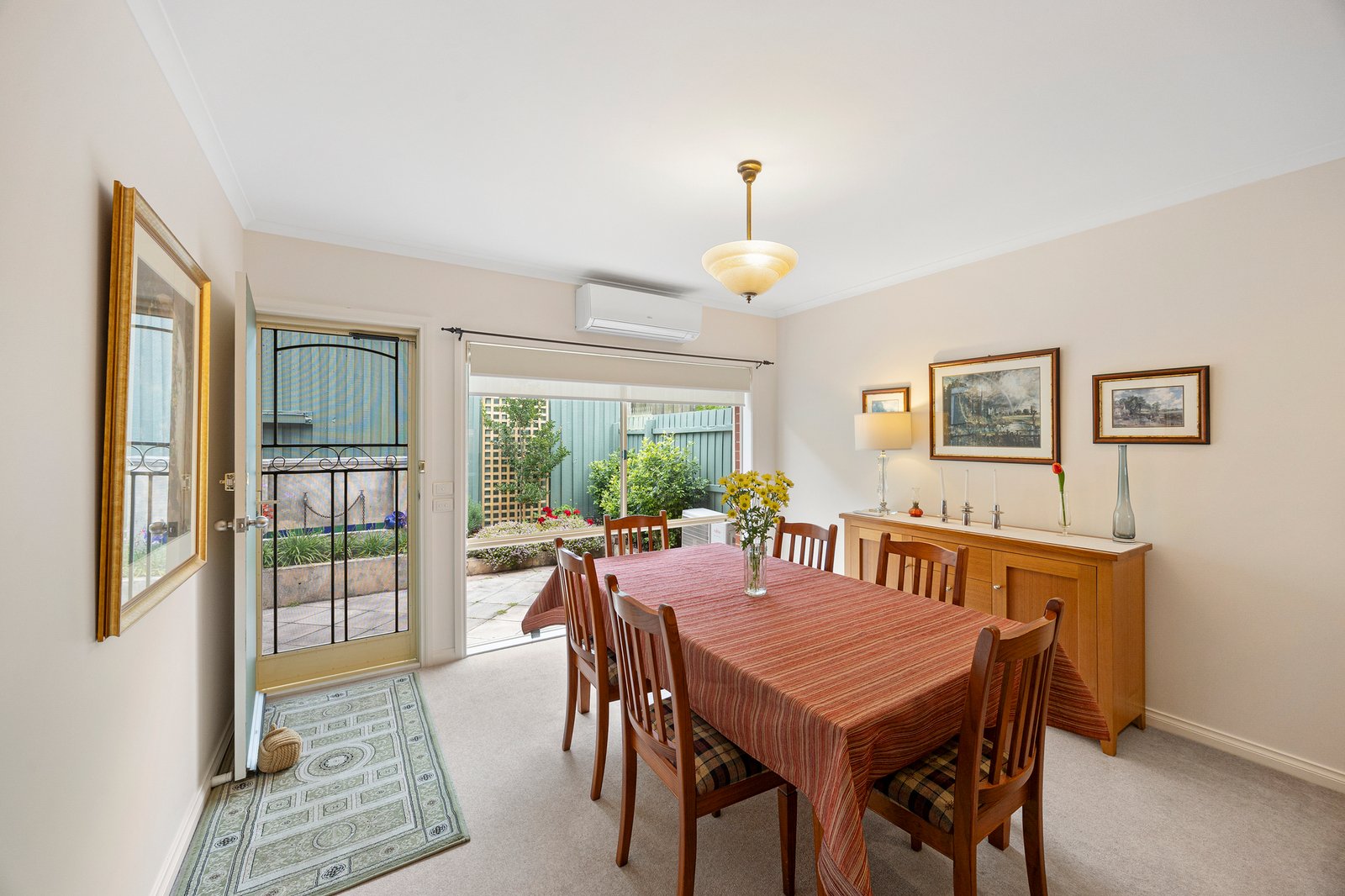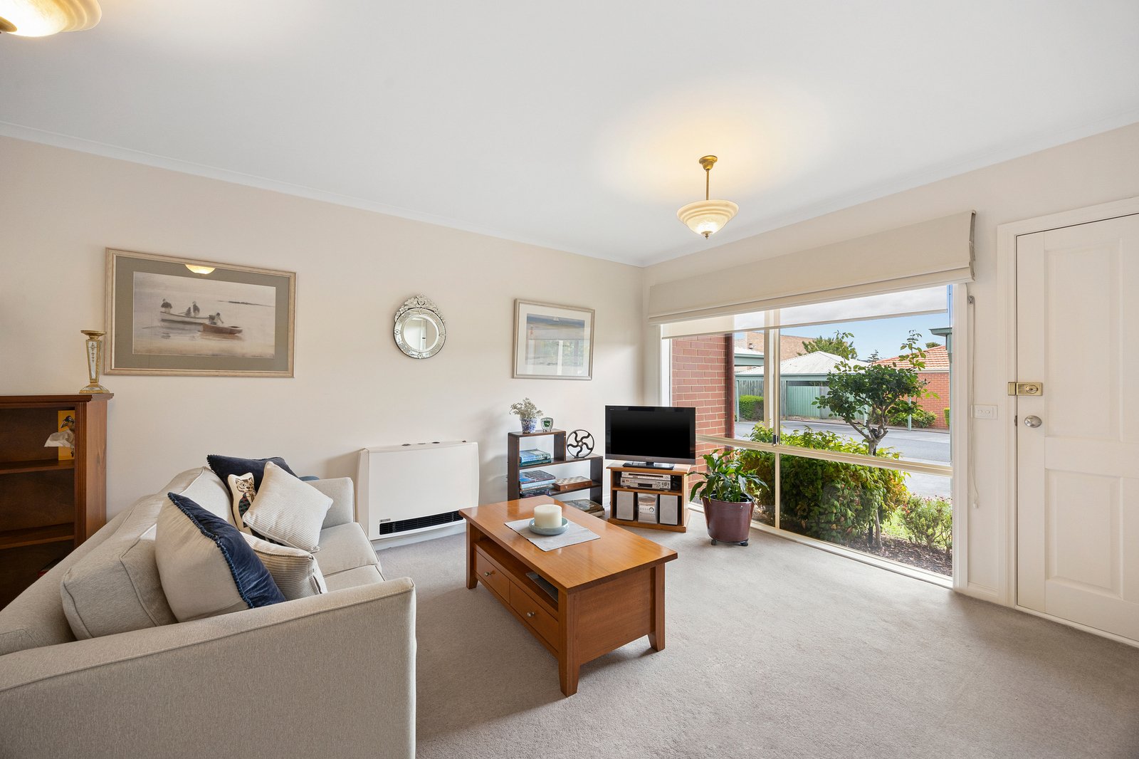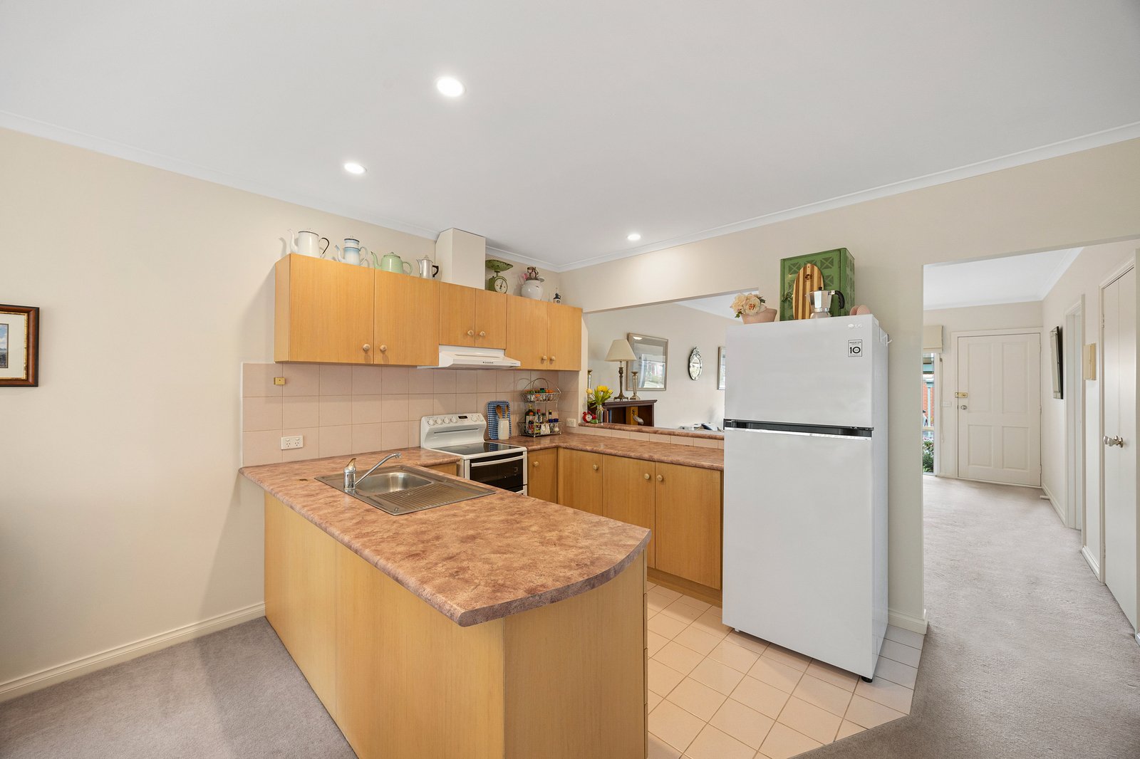 Inside, northern light animates the living area, creating an inviting first impression before the space flows to a bright, well-appointed kitchen with Westinghouse appliances.