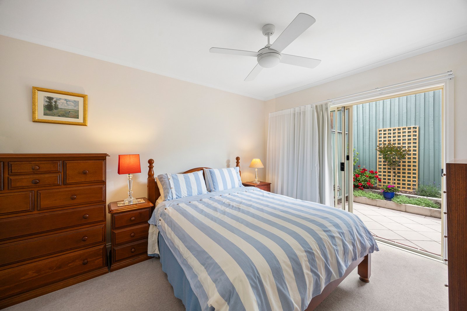 Accommodation includes two generously scaled bedrooms - each with built-in robes, ceiling fans, and direct bathroom access - positioned on either side of a stylish central bathroom with bath and separate shower. One bedroom also opens directly to the terrace, enhancing the home’s indoor-outdoor connection.