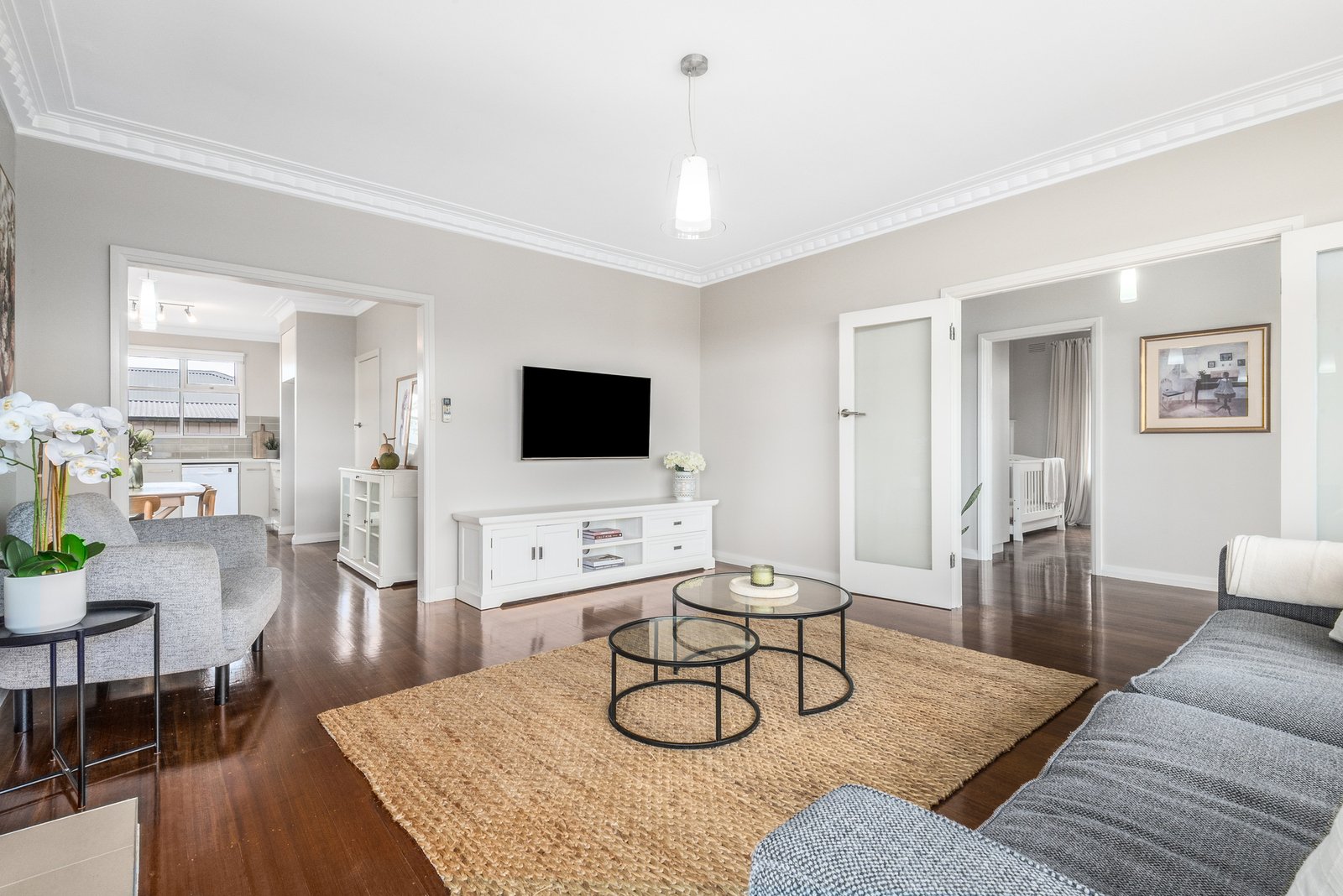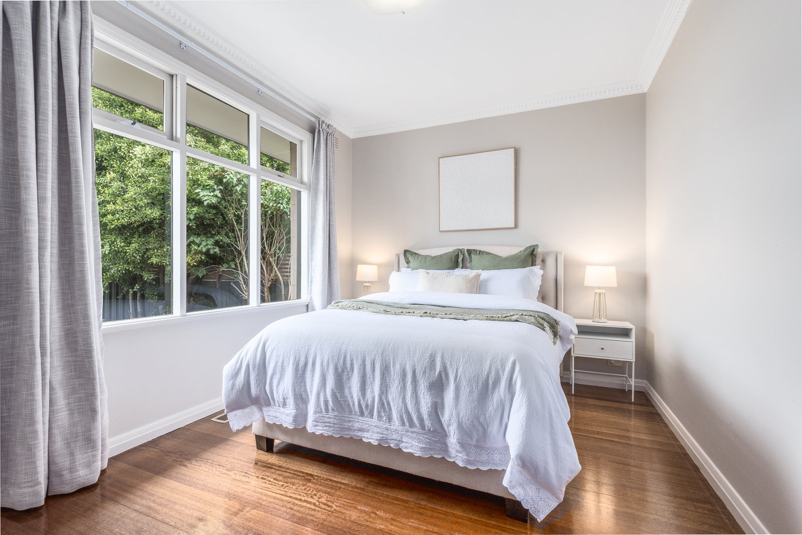 Set behind a high fence, the home is nestled in a private garden setting. Stepping inside, a classic neutral colour palette and polished timber floors showcase the sophisticated style within. From the entry, double glass doors open into the north facing living area, bathed in natural light, featuring ornate cornice, ducted heating, split system heating and cooling, plus a gas log fire for a cosy atmosphere. The adjoining kitchen and dining area offers an inviting space for everyday living and effortless entertaining. The quality kitchen features modern appliances including a new 600mm oven, gas cooktop, Bosch dishwasher, contemporary cabinetry and generous storage.