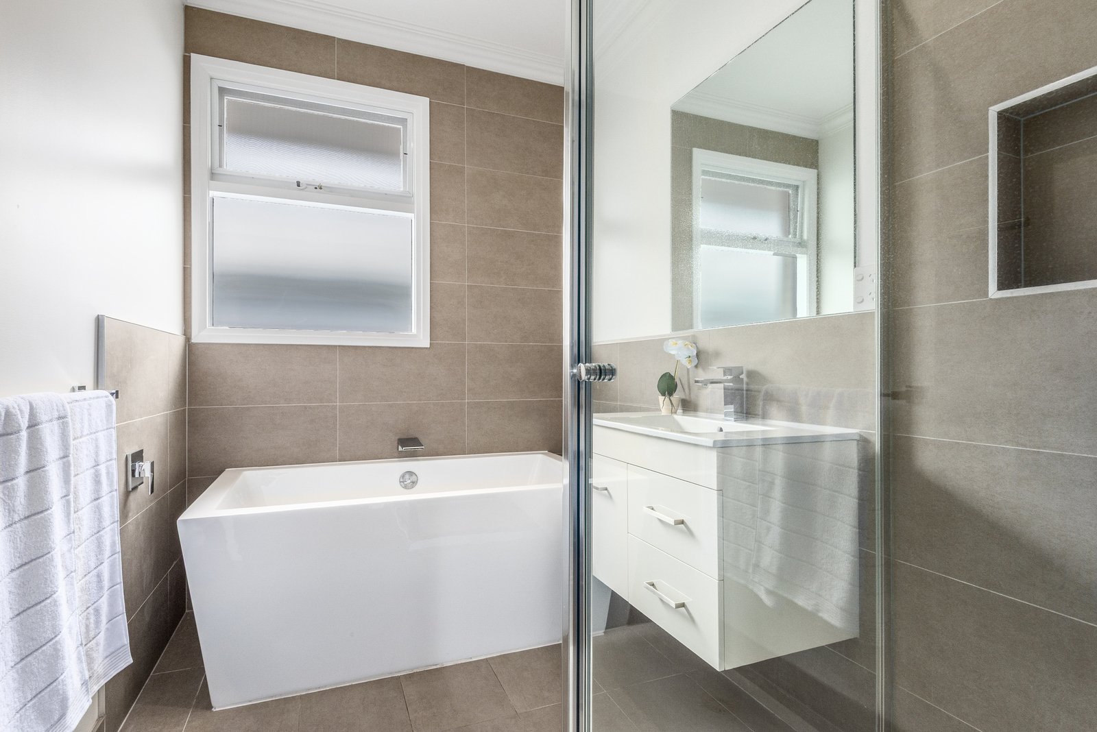 The main bedroom is a privately zoned retreat with walk-in robes and a tastefully presented ensuite. Bedroom two includes built-in robes and split system heating and cooling, bedroom three with dual built-in robes. The central bathroom features a freestanding bath, separate shower and modern vanity, with a separate powder room for added functionality.