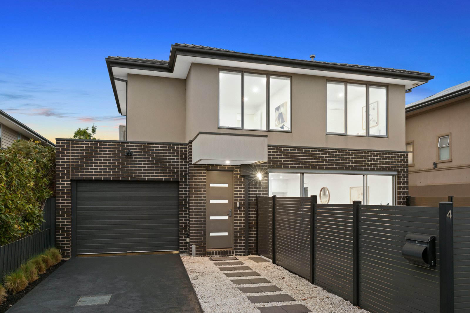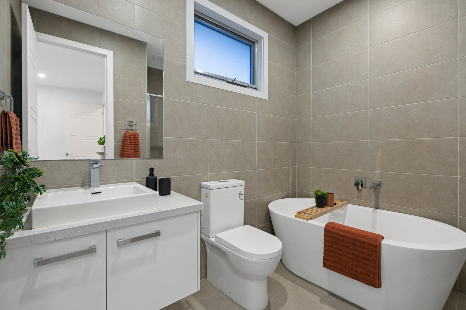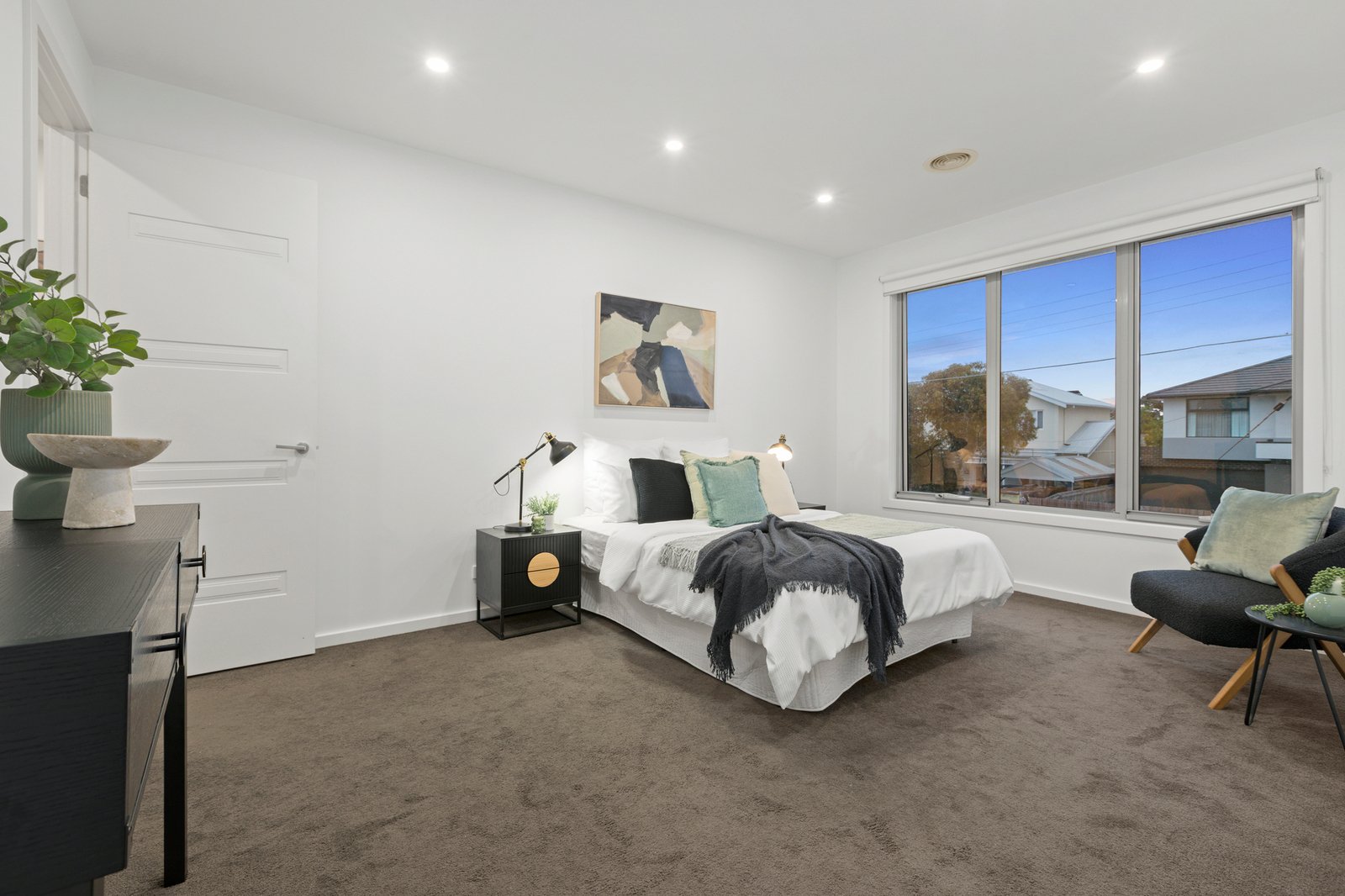 All three bedrooms are positioned upstairs, well away from the home’s social areas. The primary bedroom has the luxury of a walk-in robe and private ensuite while a smartly finished family bathroom with ceiling-height tiles and floating vanity services the remaining bedrooms.