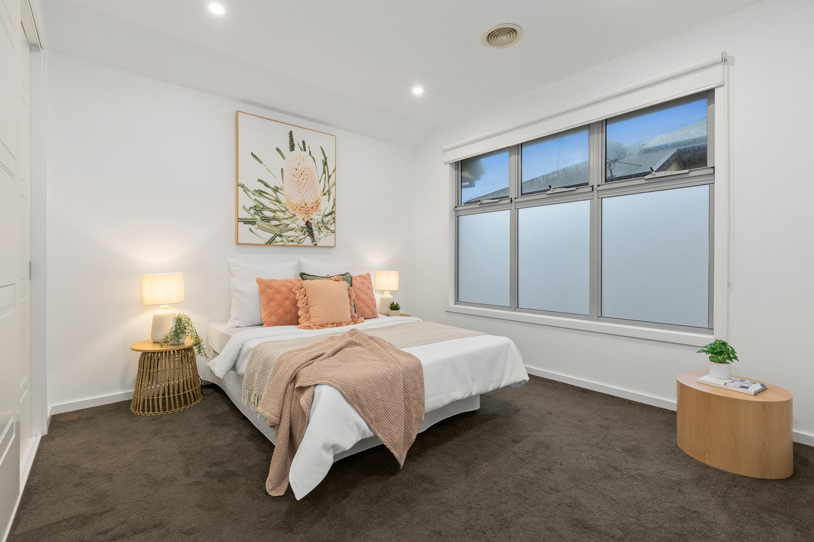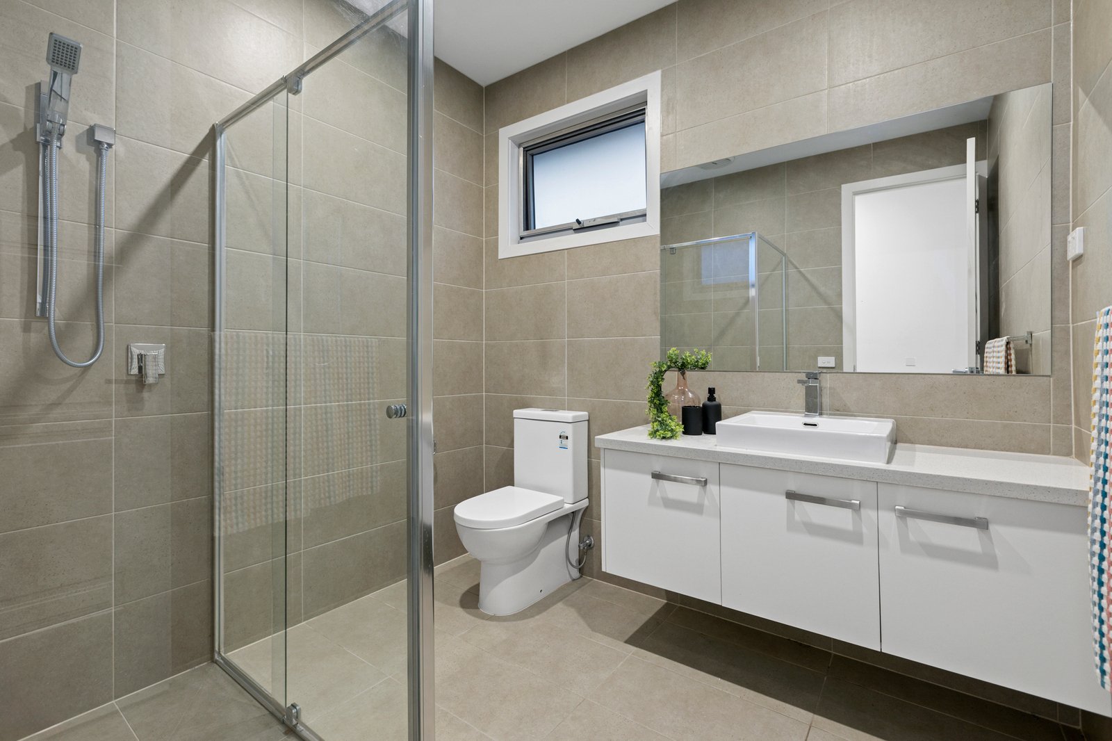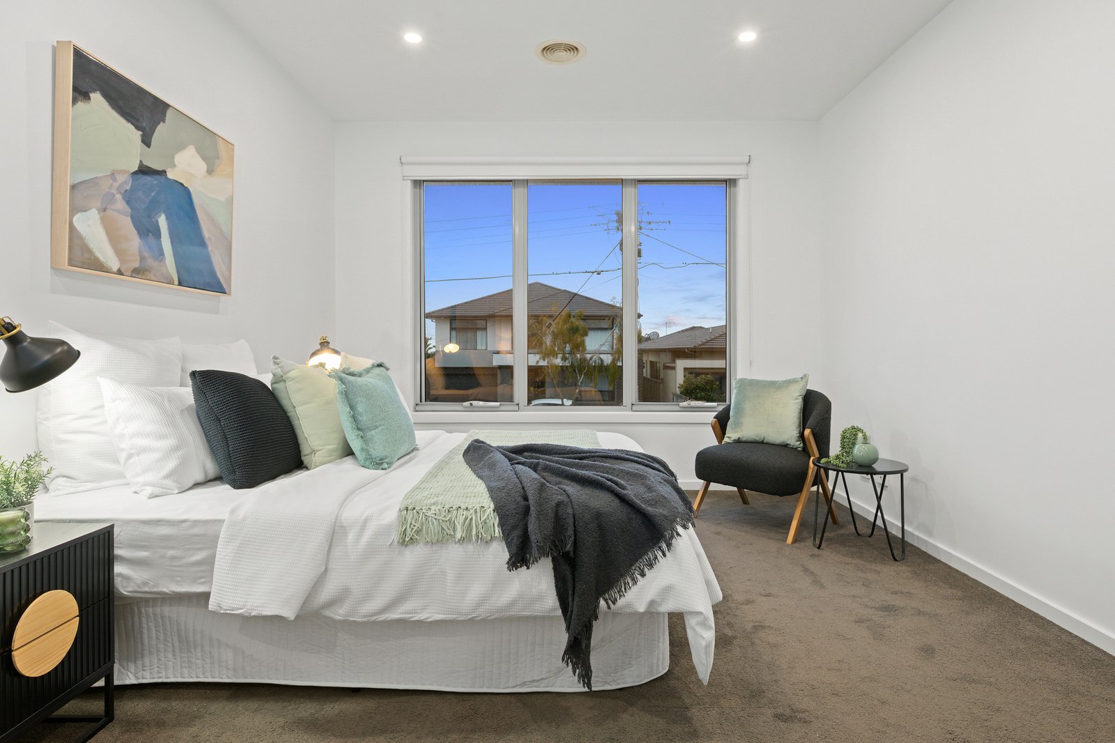 All three bedrooms are positioned upstairs, well away from the home’s social areas. The primary bedroom has the luxury of a walk-in robe and private ensuite while a smartly finished family bathroom with ceiling-height tiles and floating vanity services the remaining bedrooms.