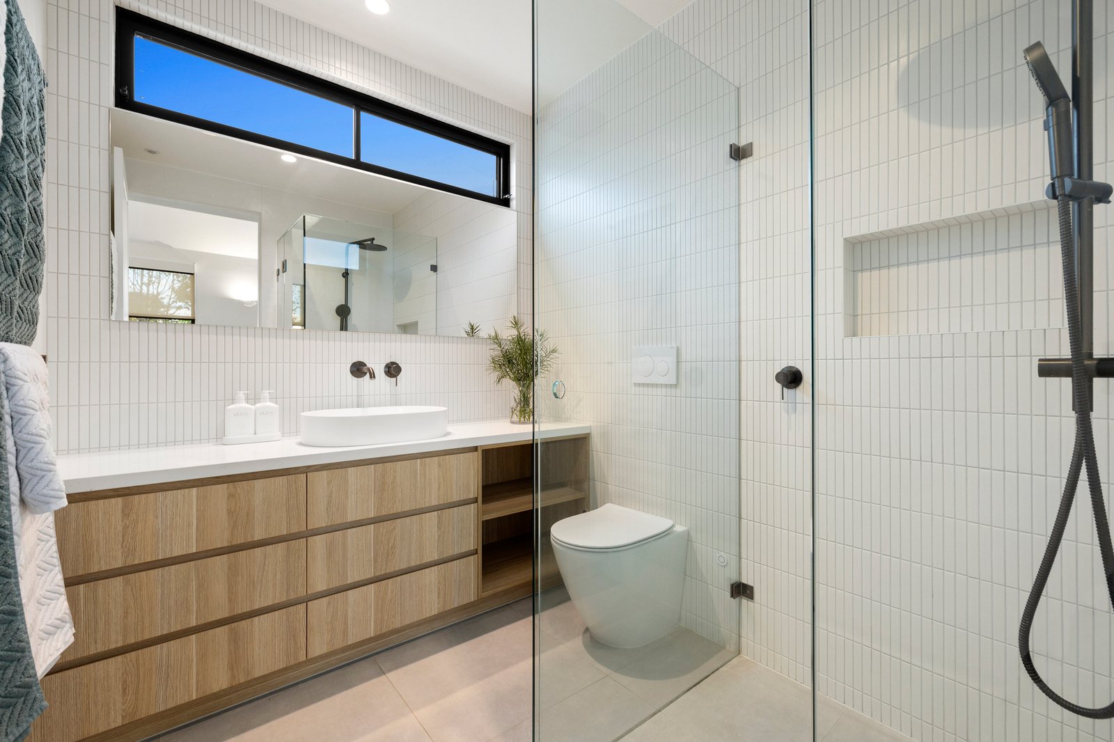A ground floor master bedroom with bespoke walk-thru wardrobe into a elegant finished ensuite and is among the crowd-pleasing inclusions, while four additional bedrooms are upstairs, bookending two beautiful bathrooms.