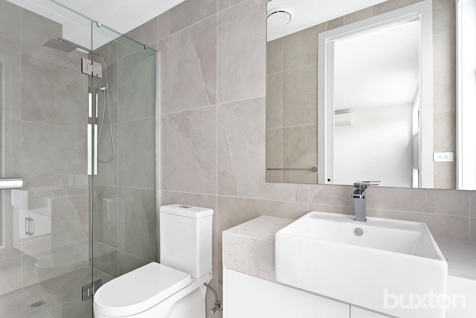 The top floor includes two spacious bedrooms, each with built-in robes, its own en suite, and individual split-system heating and cooling.