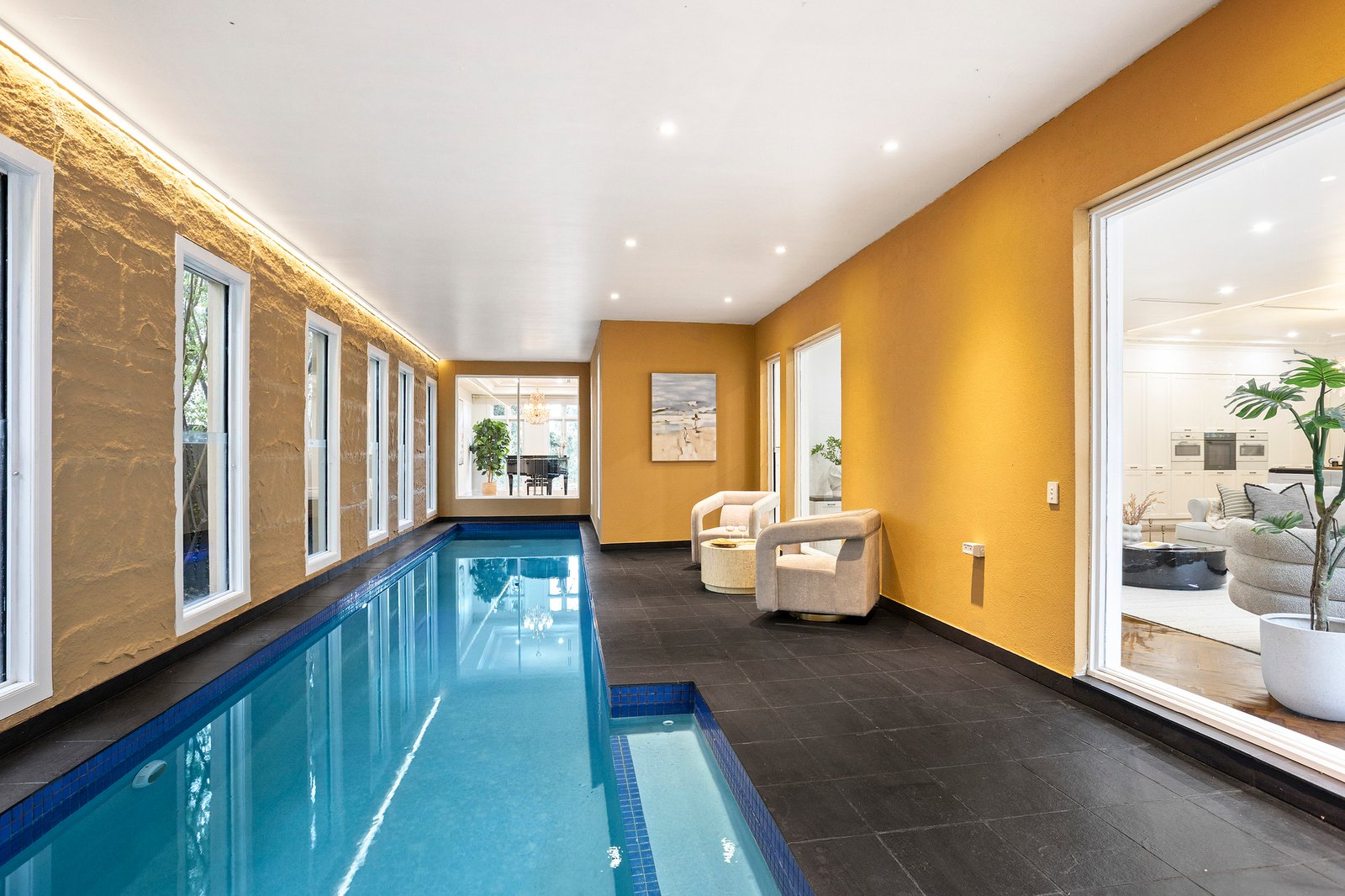 A highlight is the heated indoor swimming pool, offering year-round leisure, complemented by a home theatre, study, and four car garage.