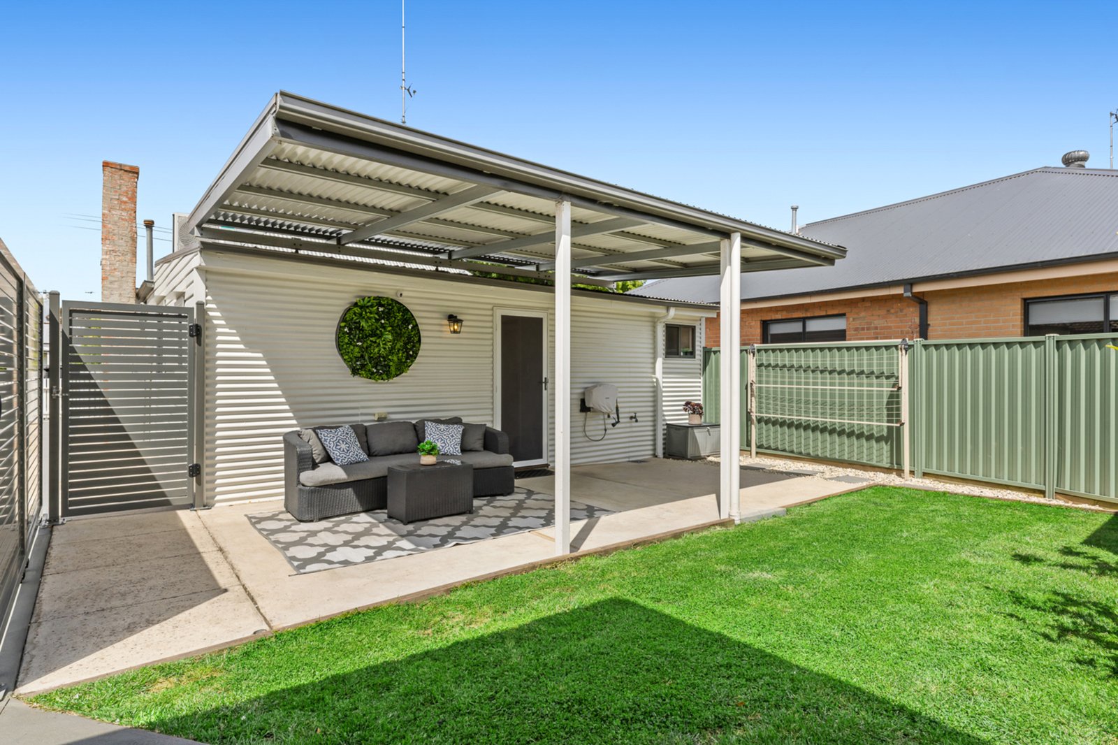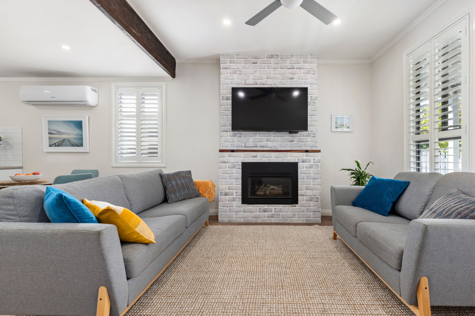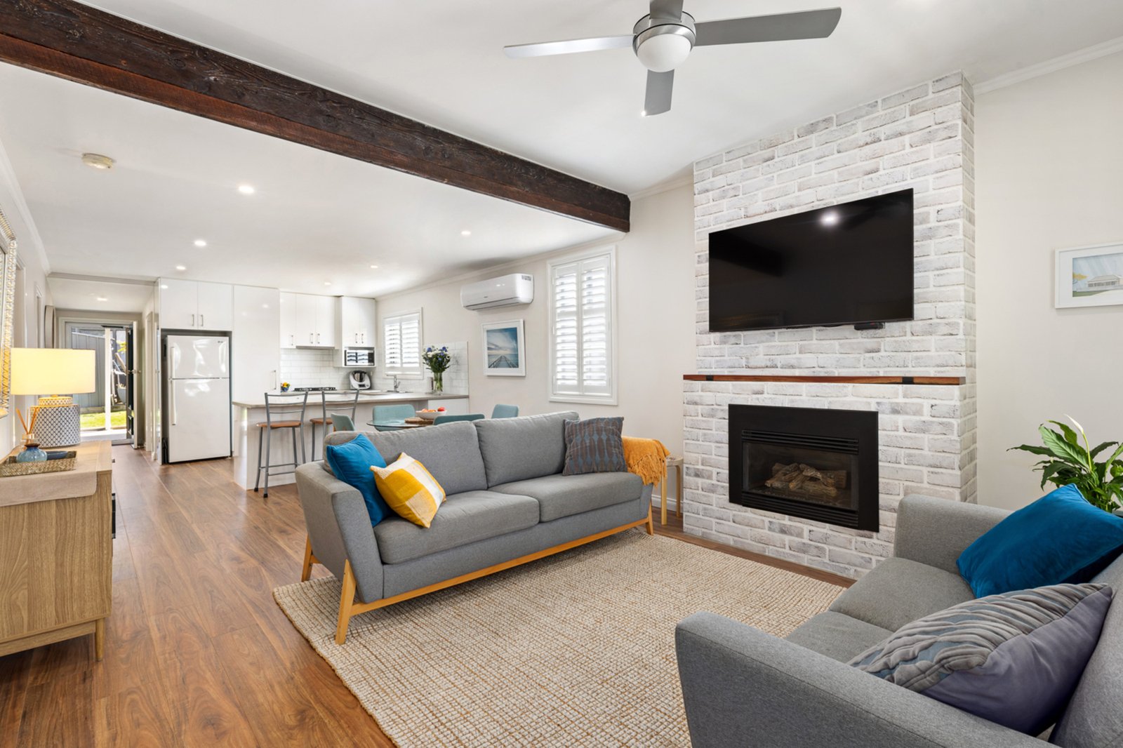 The home offers three well proportioned bedrooms and a beautifully updated bathroom, a large custom kitchen with Westinghouse appliances perfect for comfortable everyday living. The central living room is warm and welcoming, enhanced by a gas log fire, split system heating and cooling, and a ceiling fan to keep the space comfortable year round.