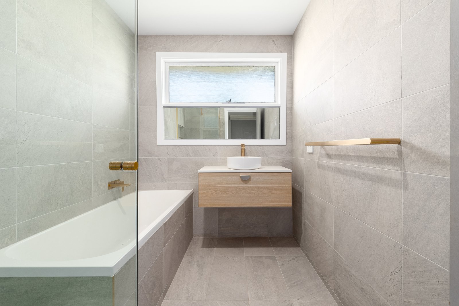 The main bedroom is privately zoned off the entry, featuring walk-in robes and an ensuite. Two further bedrooms are positioned in a rear wing, both include built-in robes, serviced by a tastefully updated main bathroom finished in floor to ceiling tiles, featuring a bath, separate shower, modern vanity with stone benchtop, and chic brass tapware. A separate wc, updated laundry, and generous linen storage ensures excellent functionality.