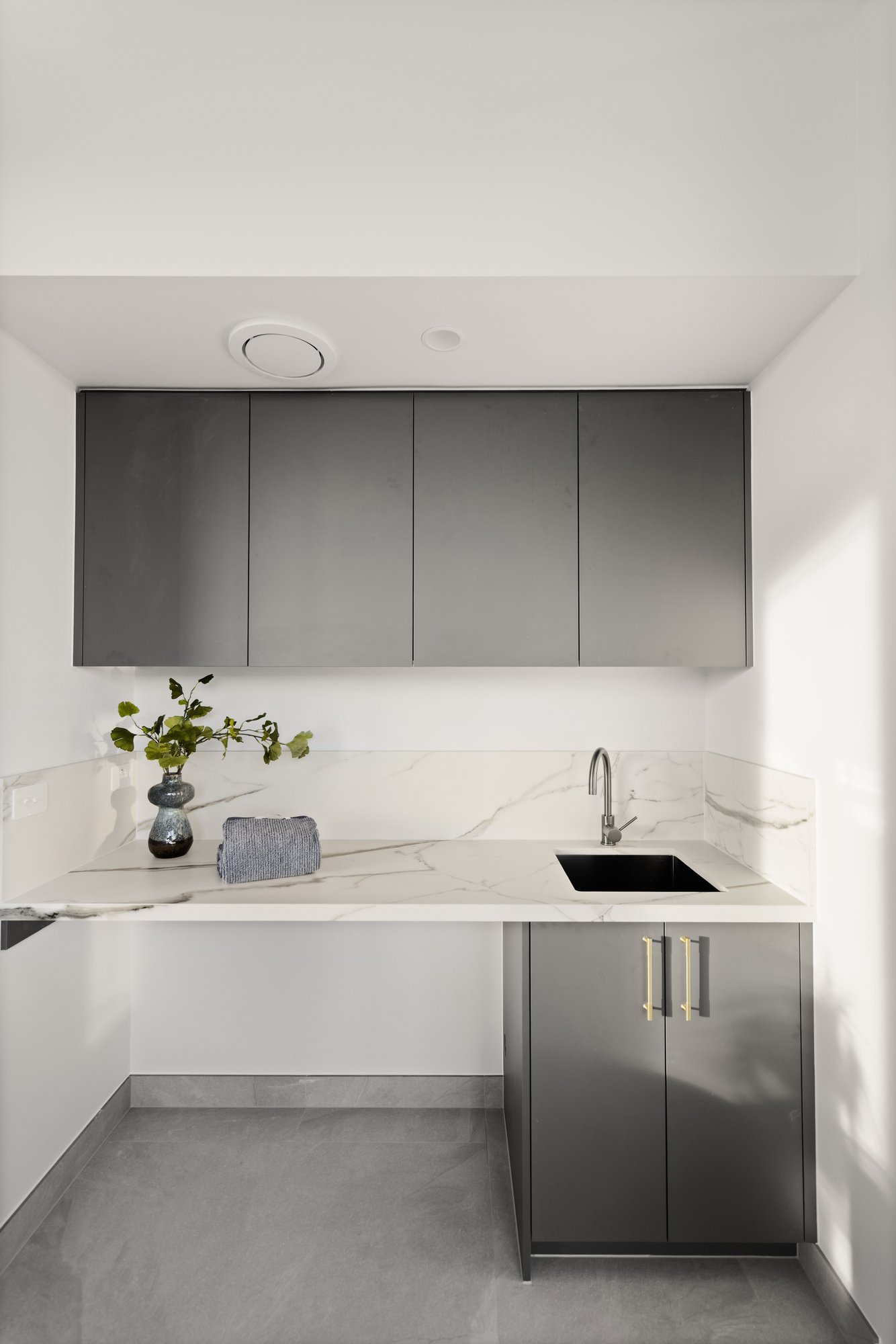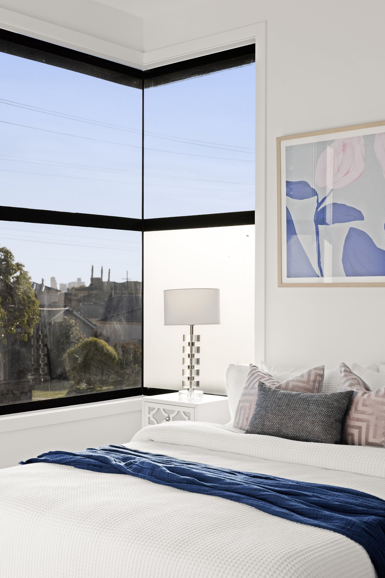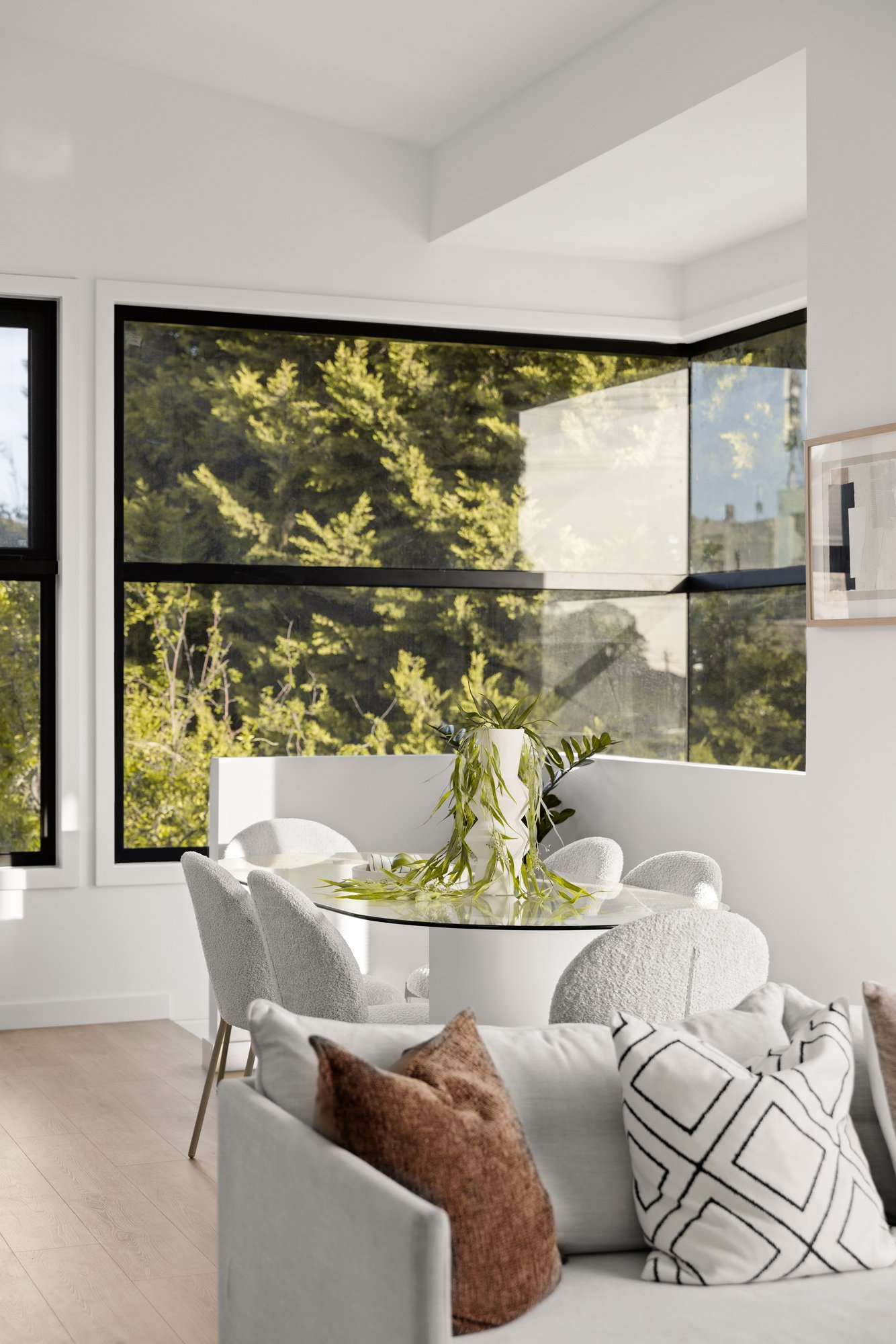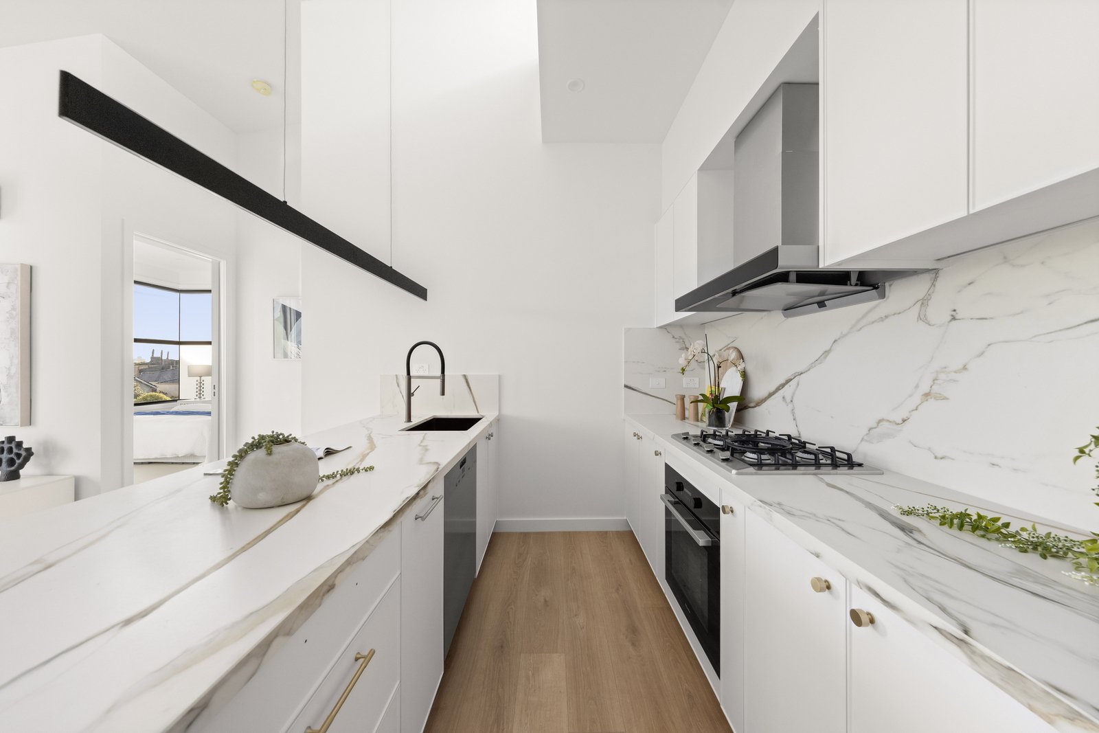 Upstairs, the expansive open-plan living domain is a true centrepiece—soaring ceilings, large picture windows and seamless indoor-outdoor flow work together to create a bright, uplifting environment. The gourmet kitchen is both functional and refined, boasting a long stone island bench, premium appliances and abundant storage, making it ideal for family cooking, entertaining and everyday dining. The adjoining living and dining areas extend out to a generous balcony, perfect for sunset gatherings, weekend relaxation or enjoying the leafy streetscape.