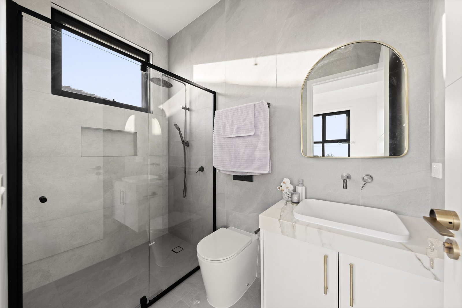 Every detail has been considered—from the beautifully finished bathrooms with modern stone surfaces, contemporary matte-black tapware and elegant tiling, to the light timber floors that enhance the home's warm, welcoming aesthetic. A spacious double garage, full laundry, and landscaped surrounds further elevate day-to-day convenience.