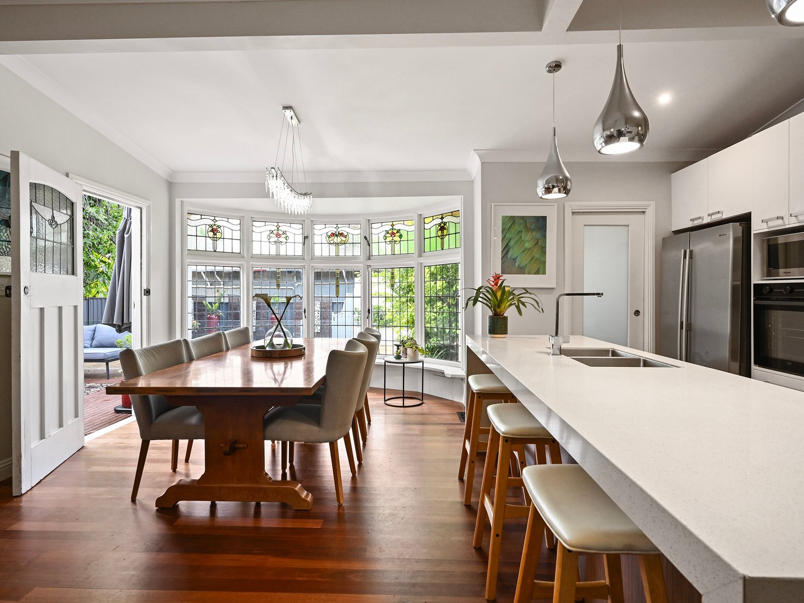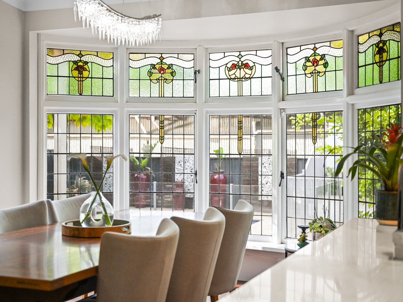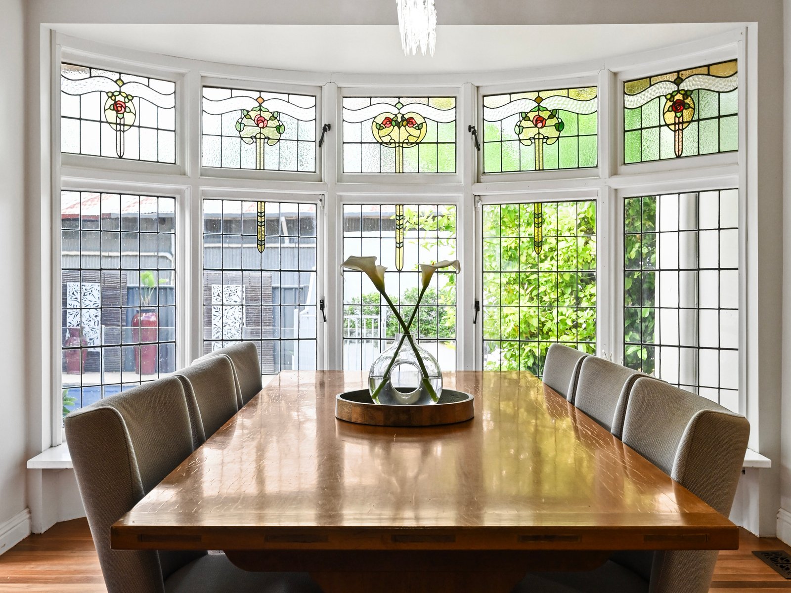 Some of the home's most striking features are the stunning Art Nouveau leadlight glazed windows in the front entry, a bay window in the dining area and an arched side vestibule entry.