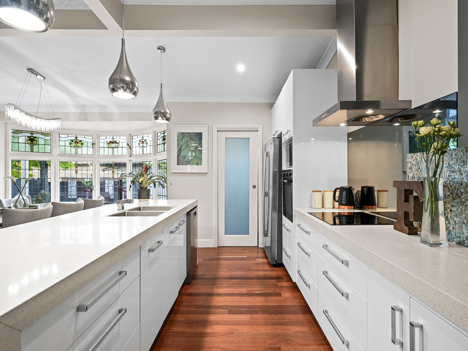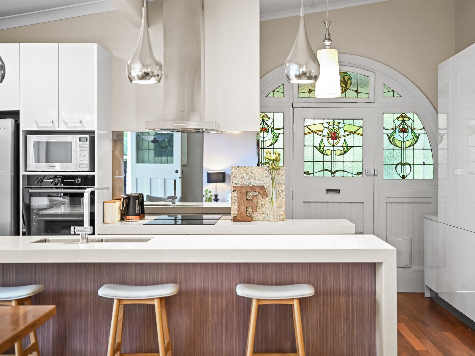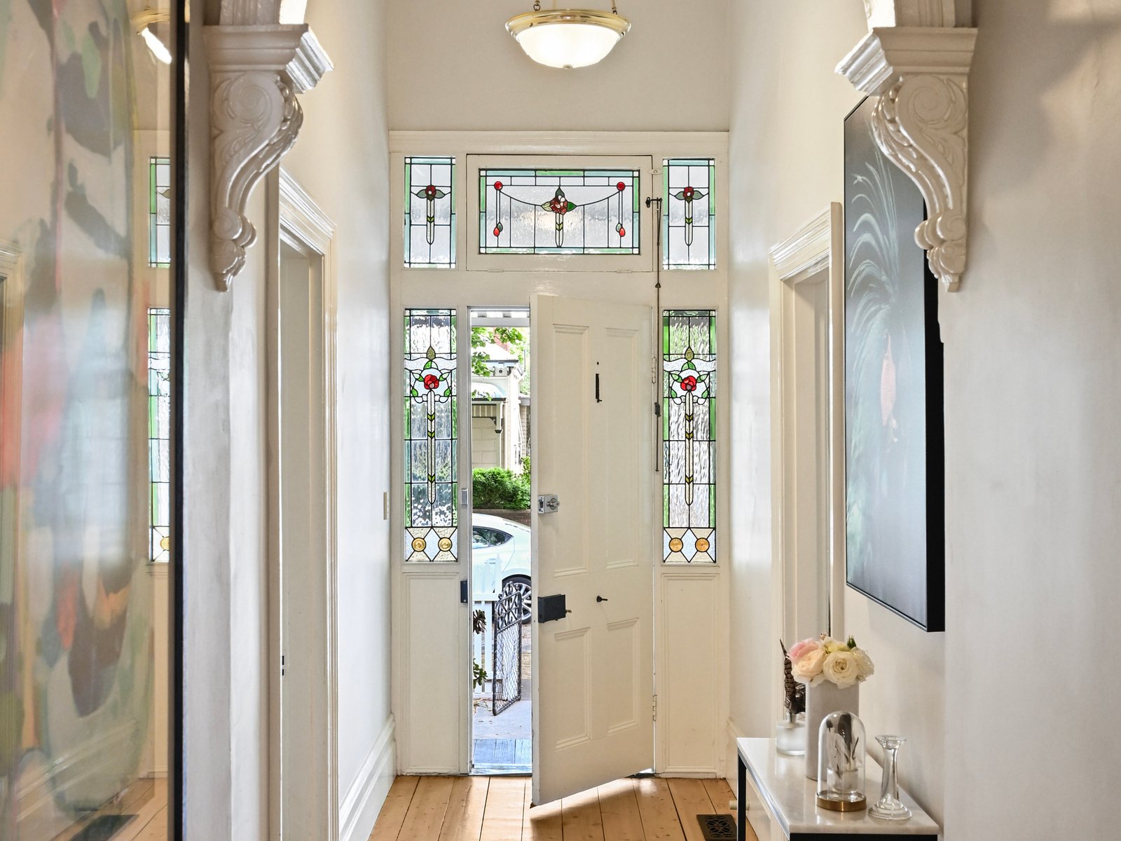 Some of the home's most striking features are the stunning Art Nouveau leadlight glazed windows in the front entry, a bay window in the dining area and an arched side vestibule entry.
