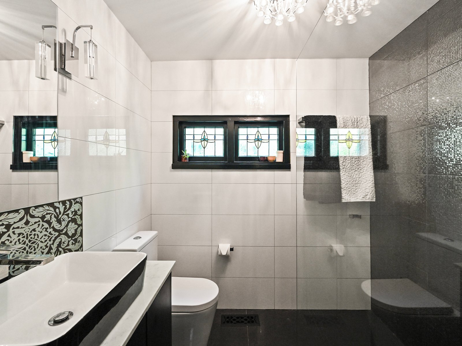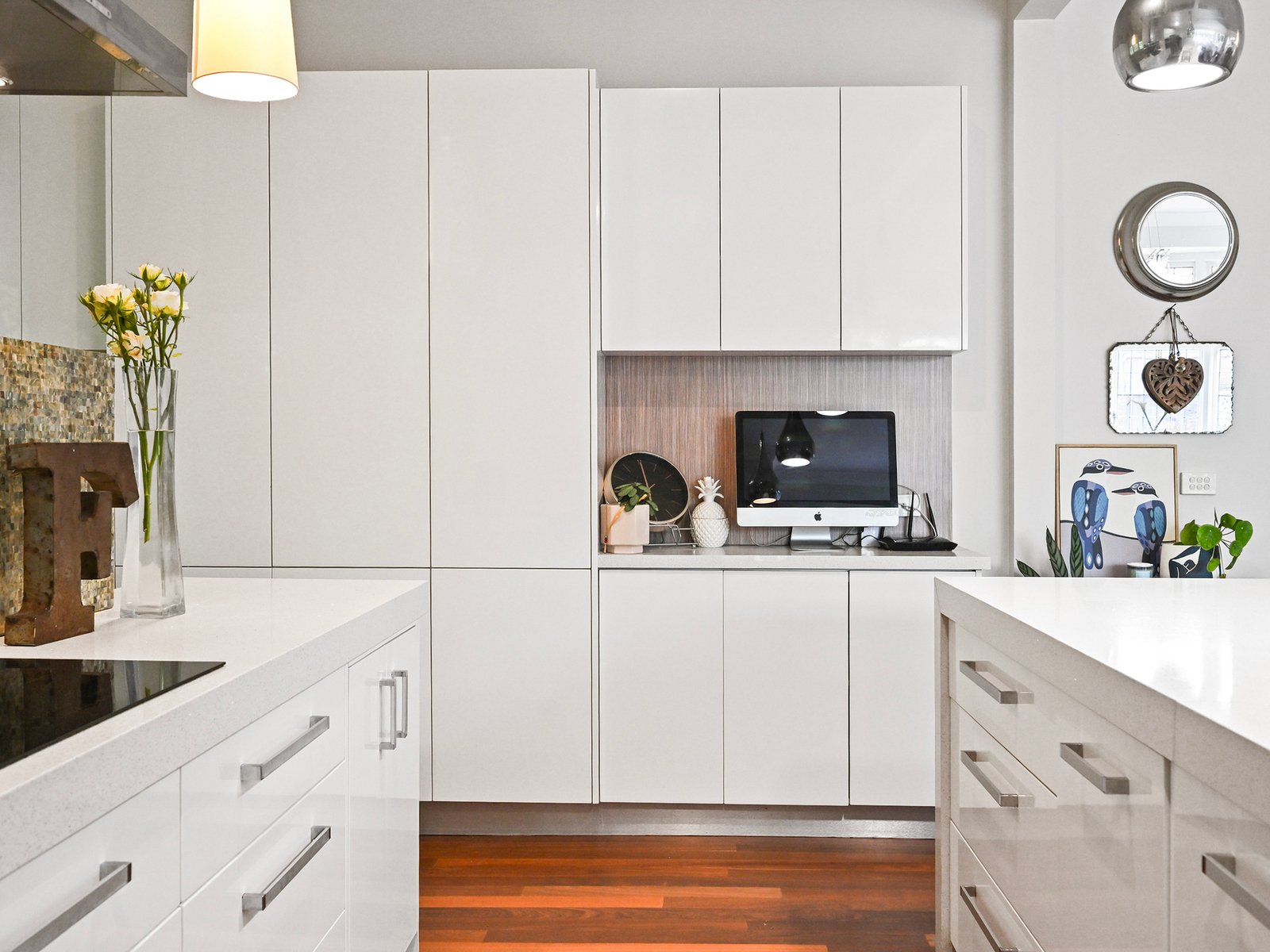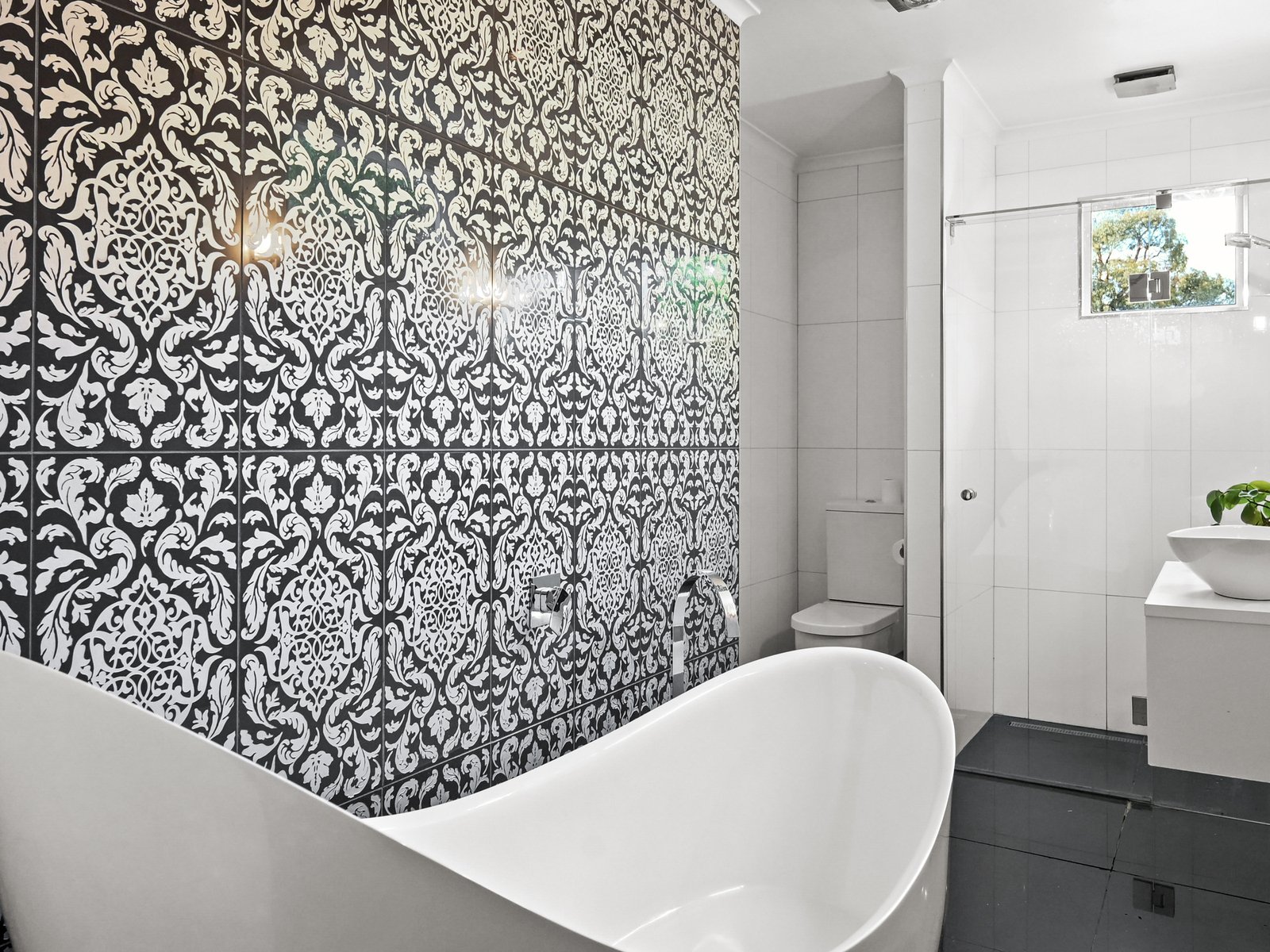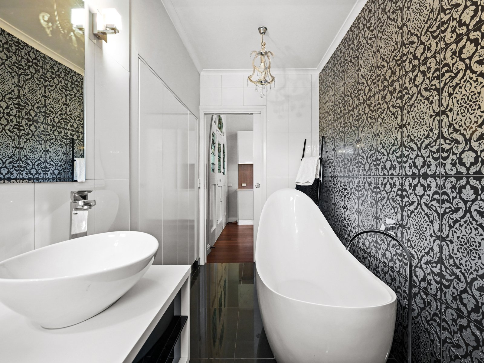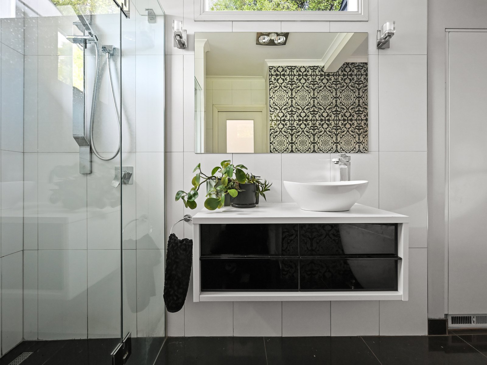 Keen culinary types will love the stylish kitchen with its mirrored splashback to the induction cooktop, an electric wall oven, a dishwasher, a substantial waterfall-end stone-topped island, a double pantry, and ample glossy white soft-close cabinetry. Alongside the kitchen, the laundry shares similar cabinetry and access to the rear yard. The striking black-and-white bathroom showcases contemporary flair with a patterned feature wall, a high-backed teardrop bath, a frameless 900mm shower, a modern wall-hung vanity and ample storage cupboards.