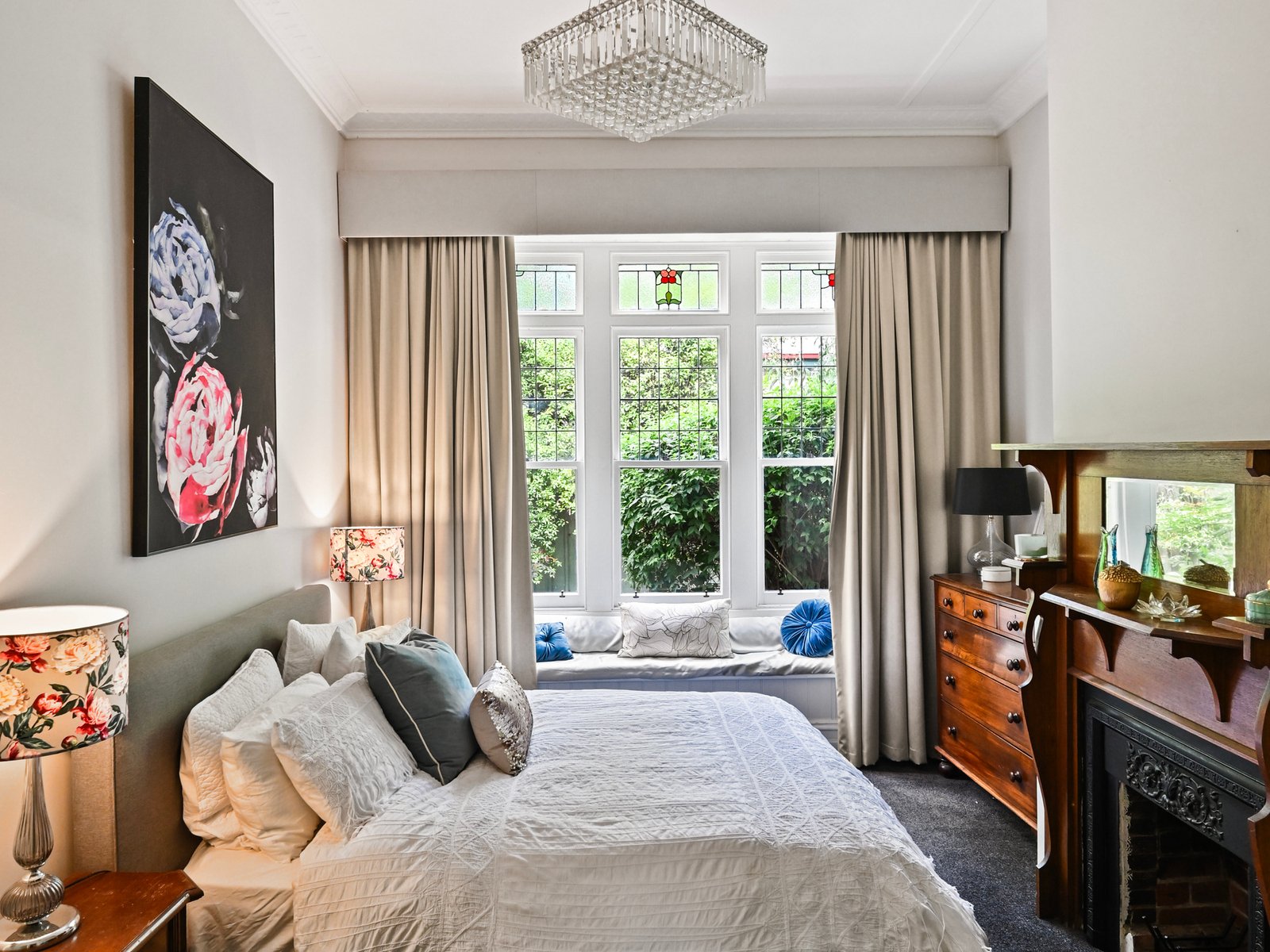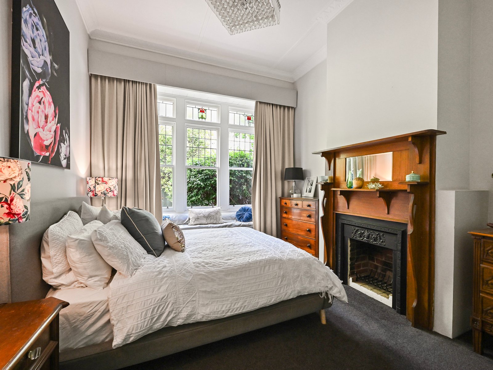 A box-bay window seat overlooking the side gardens, a walk-through robe, and a sleek en-suite bathroom further enhance the main bedroom. The formal lounge has another open fireplace and connects to the family living, dining and kitchen area, creating an effortless flow for entertaining. The large family room opens through French doors to the rear deck overlooking the glass-fenced pool, while the spacious dining area fills with Northern light filtering through the curved bay window.