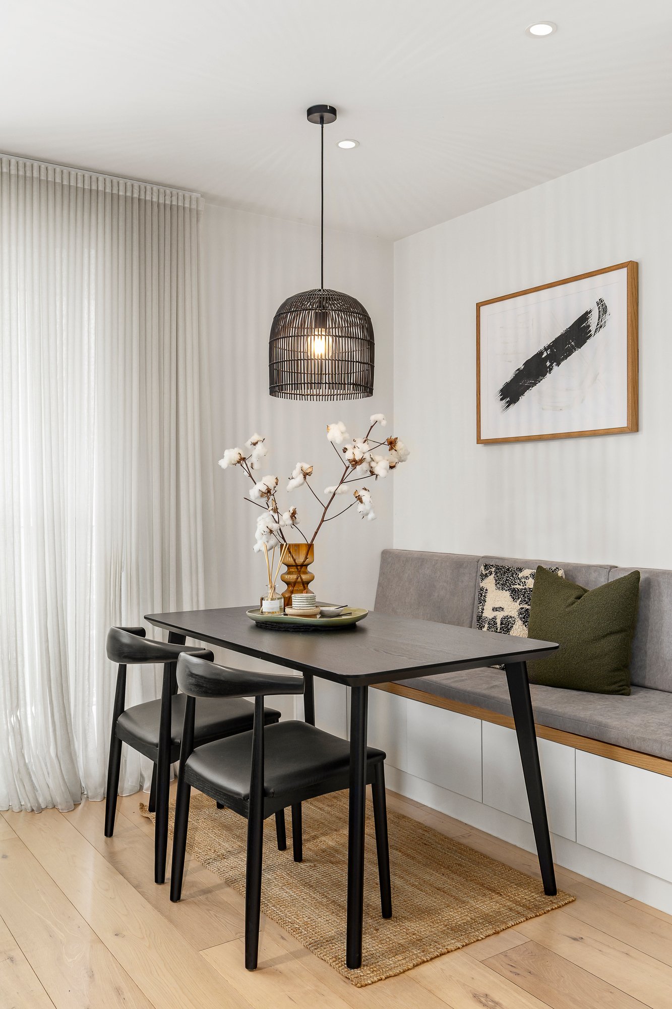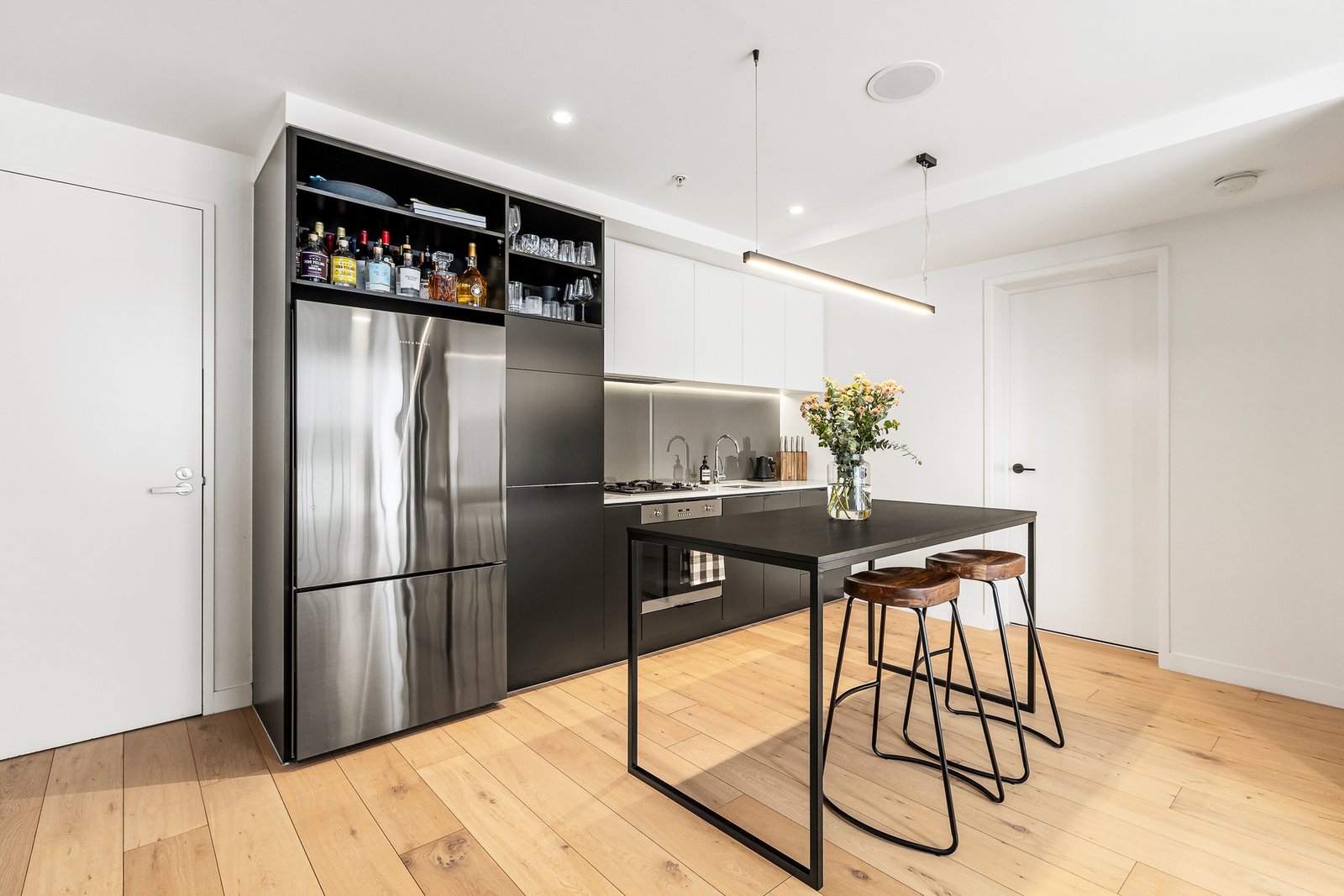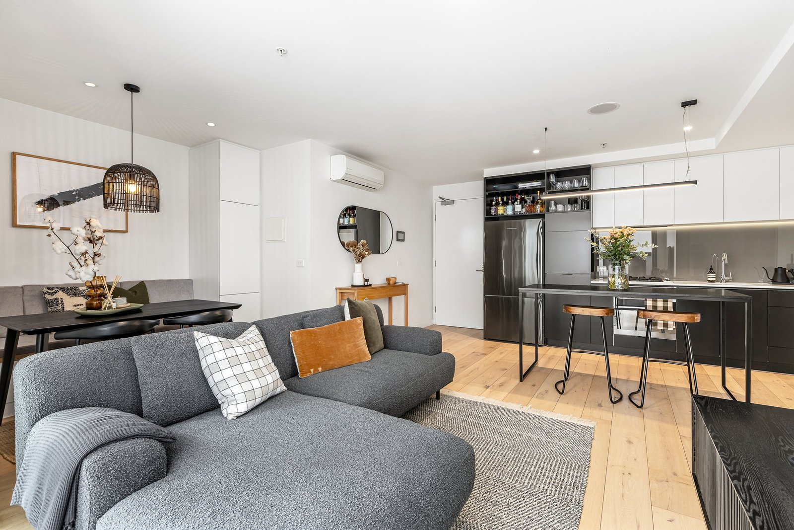 Experience refined city-edge living in this beautifully designed end apartment at 706/79 Market Street, South Melbourne. Showcasing a modern contemporary aesthetic, the interiors are defined by clean lines, warm finishes, and abundant natural light. The large double bedroom features mirrored built-in robes and floor-to-ceiling window and glass door to the balcony, while the open-plan living area with dining space with bespoke built in bench seating opens to a generous terrace with an appealing outlook.