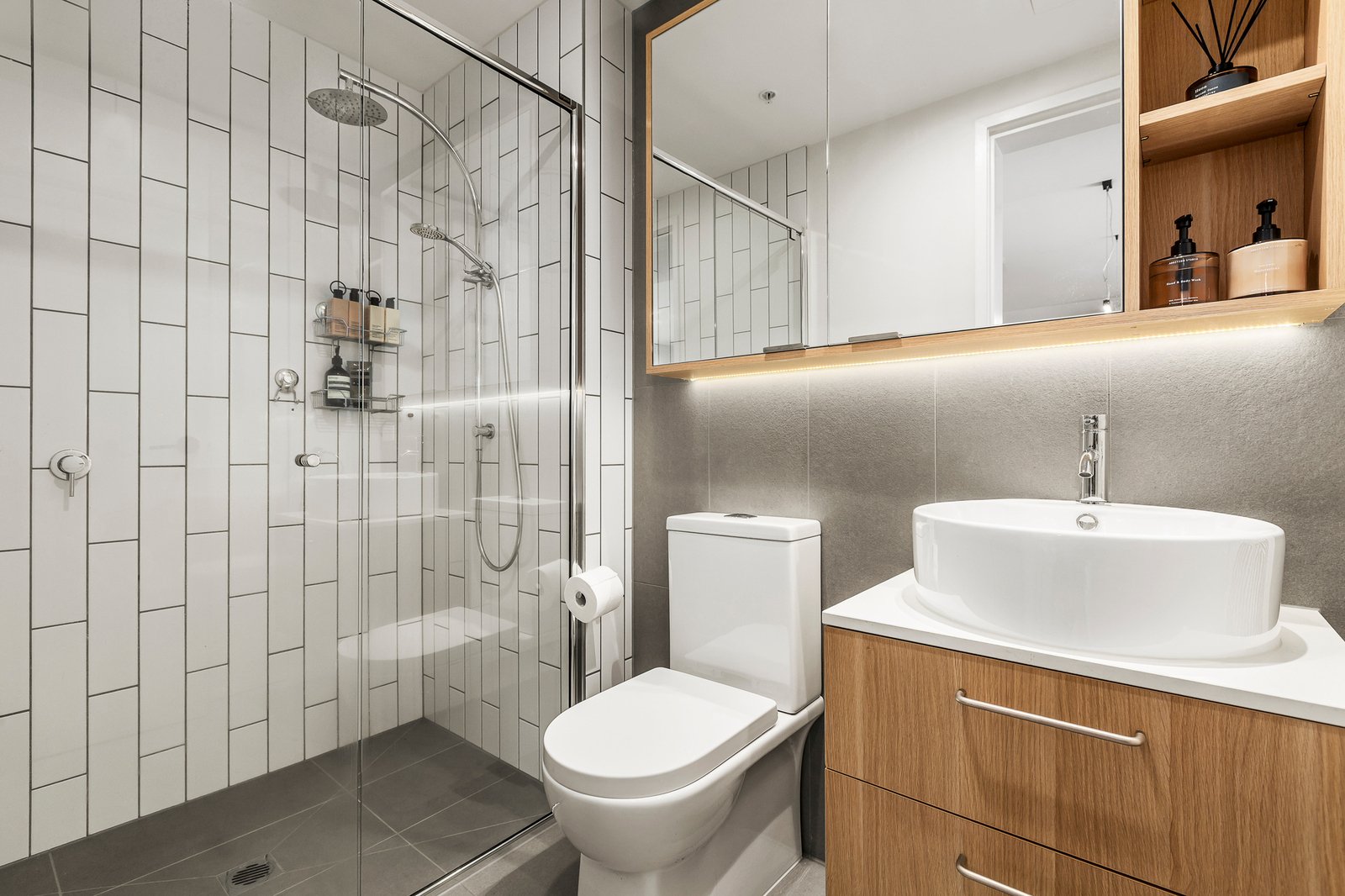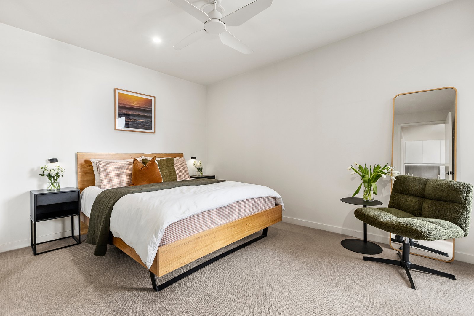 Experience refined city-edge living in this beautifully designed end apartment at 706/79 Market Street, South Melbourne. Showcasing a modern contemporary aesthetic, the interiors are defined by clean lines, warm finishes, and abundant natural light. The large double bedroom features mirrored built-in robes and floor-to-ceiling window and glass door...
